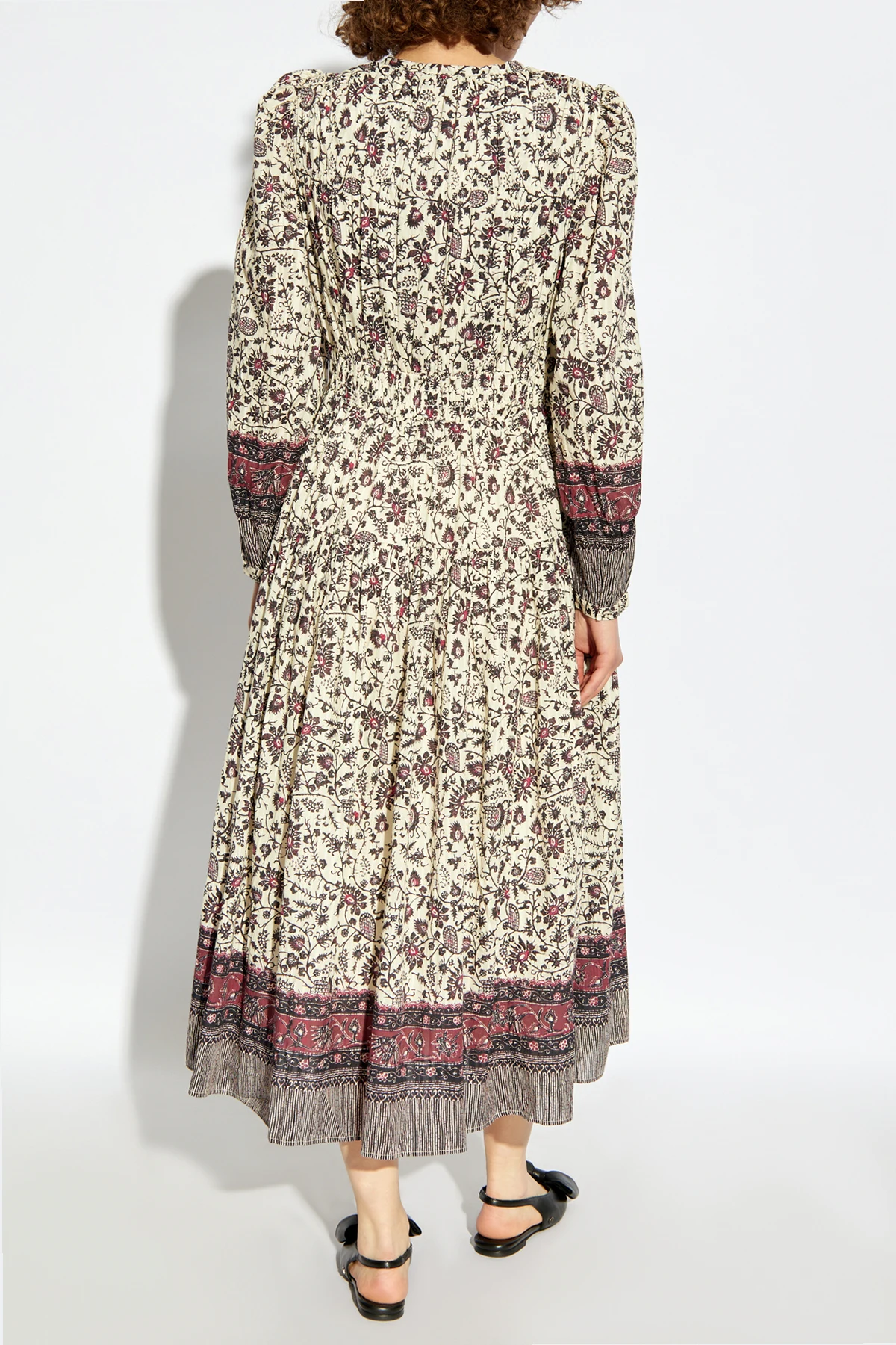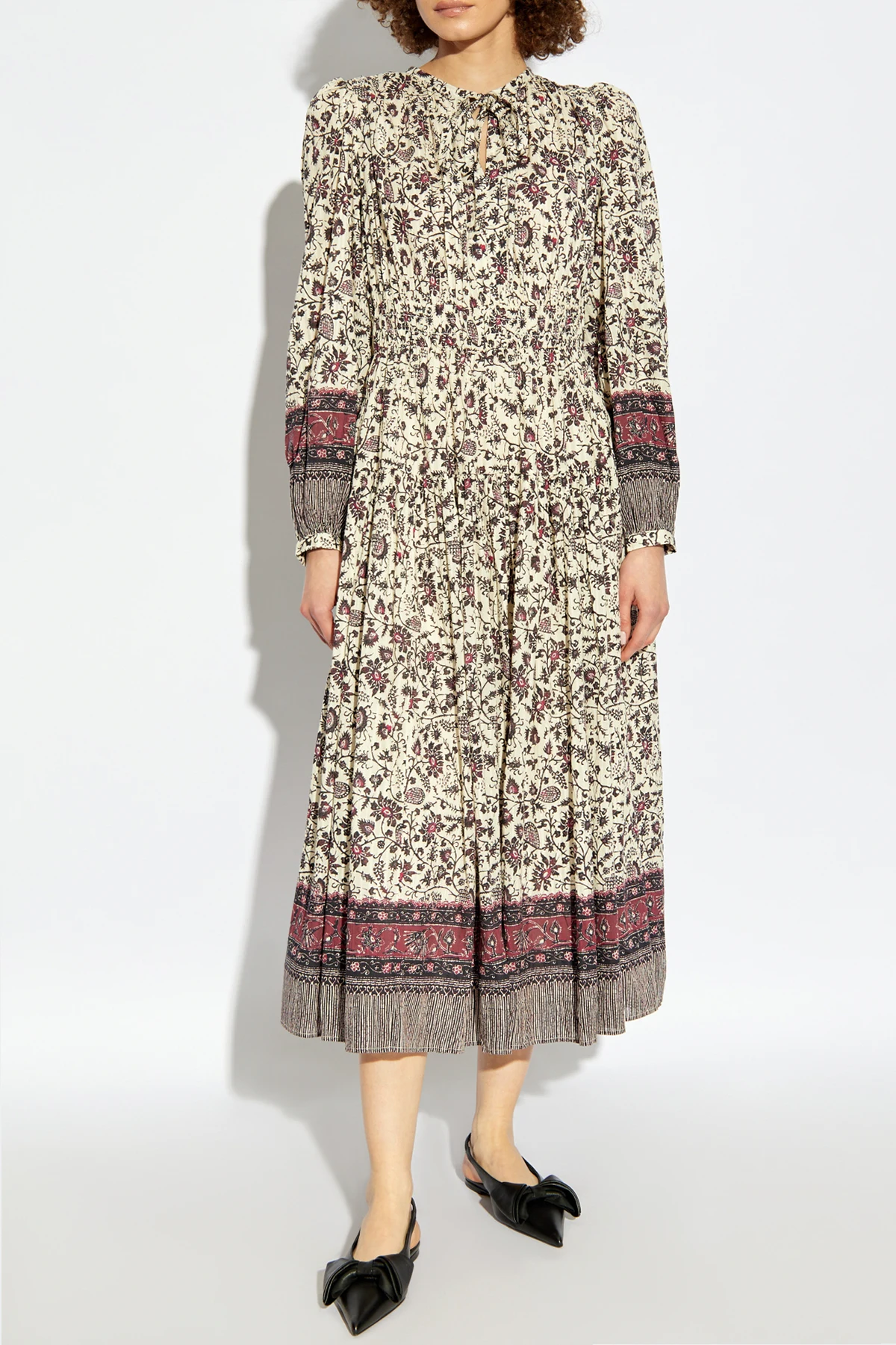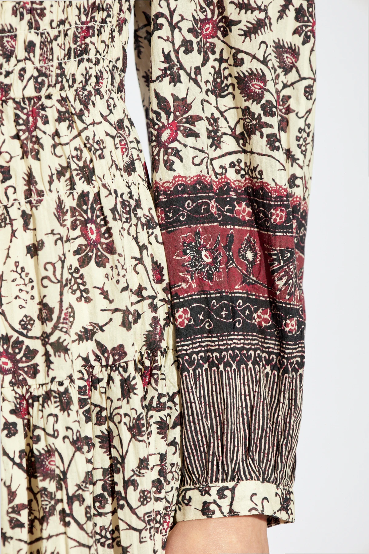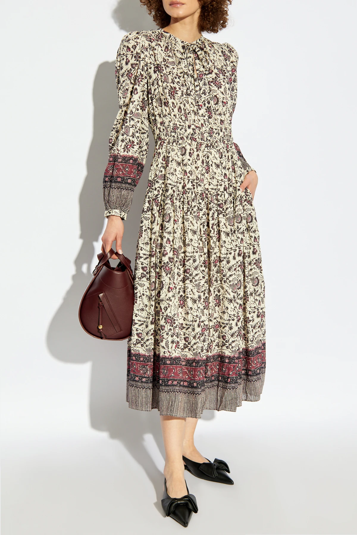 Przedstawiamy sukienkę Mona od renomowanej projektantki Ulli Johnson, której kosmopolityczny styl odzwierciedla się w unikalnej estetyce tego dzieła. Ta elegancka, midi sukienka zachwyca wielokolorowym, florystycznym wzorem z dominującymi odcieniami kremowymi, bordo i ciemnymi.