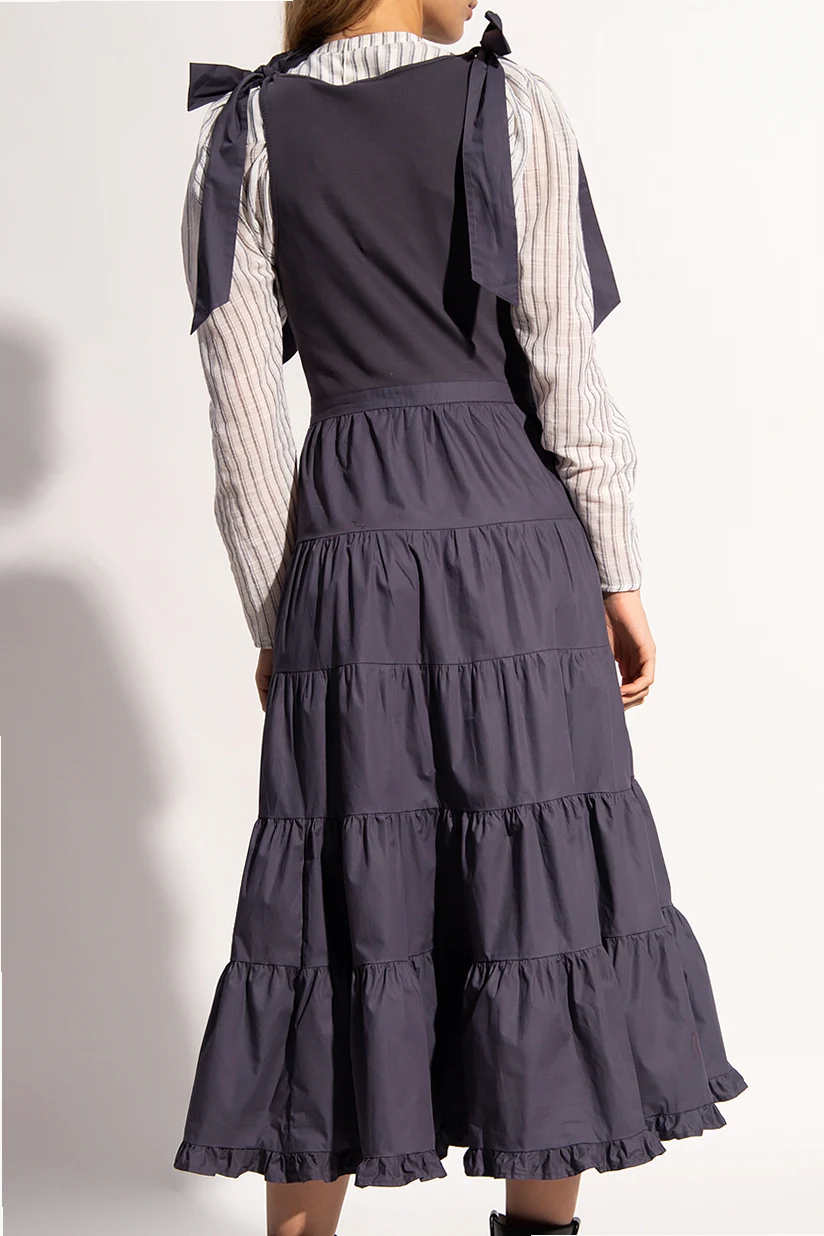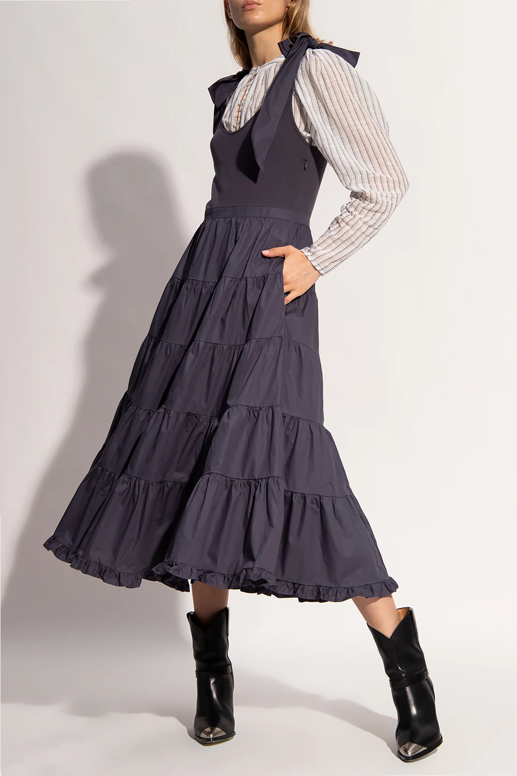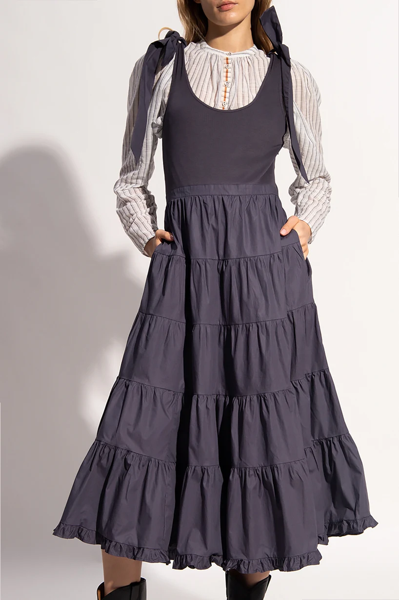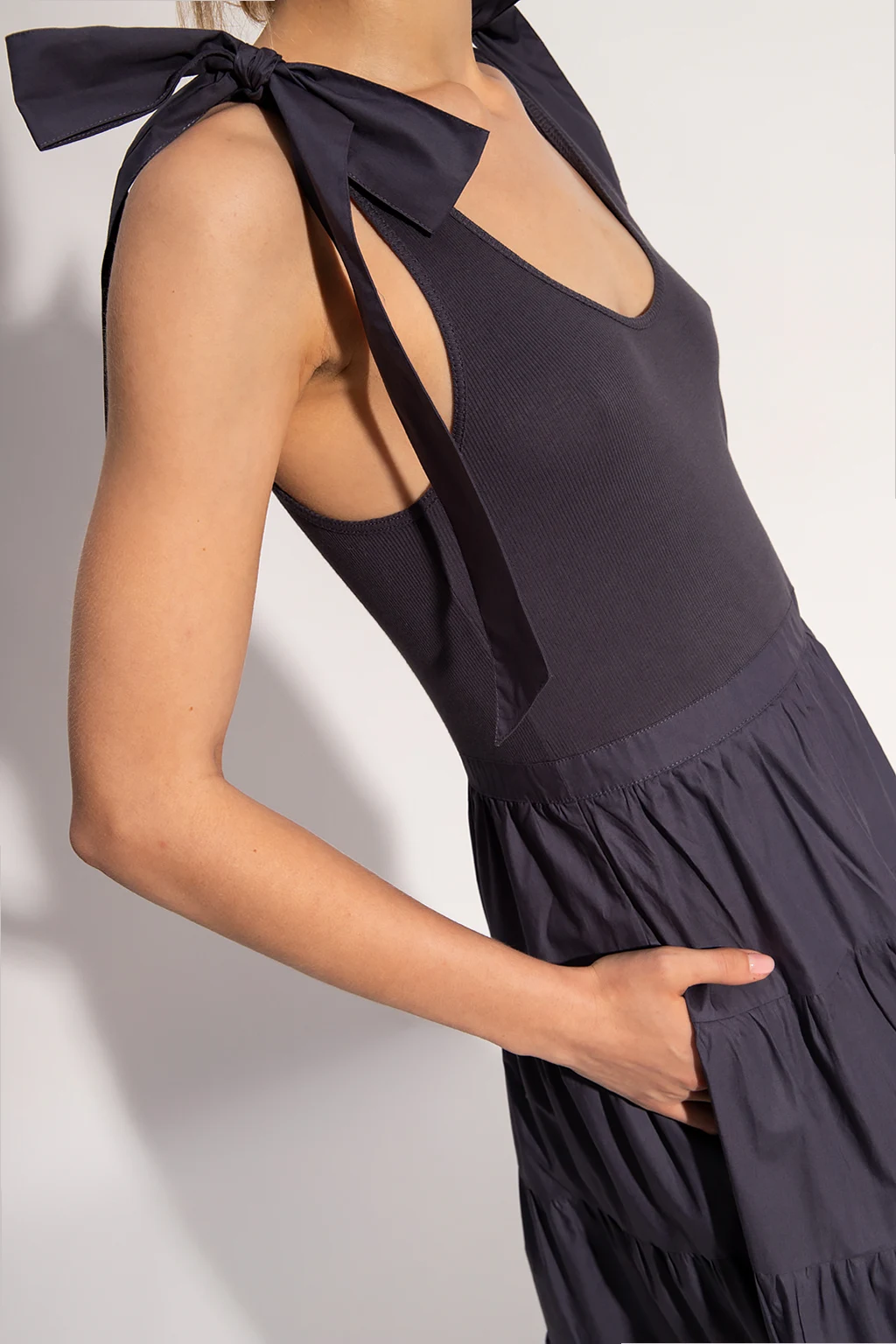 Szara, bawełniana sukienka na ramiączkach Ulla Johnson. Zapinana z boku na zamek. Po bokach kieszeń. Zakończona falbaną.