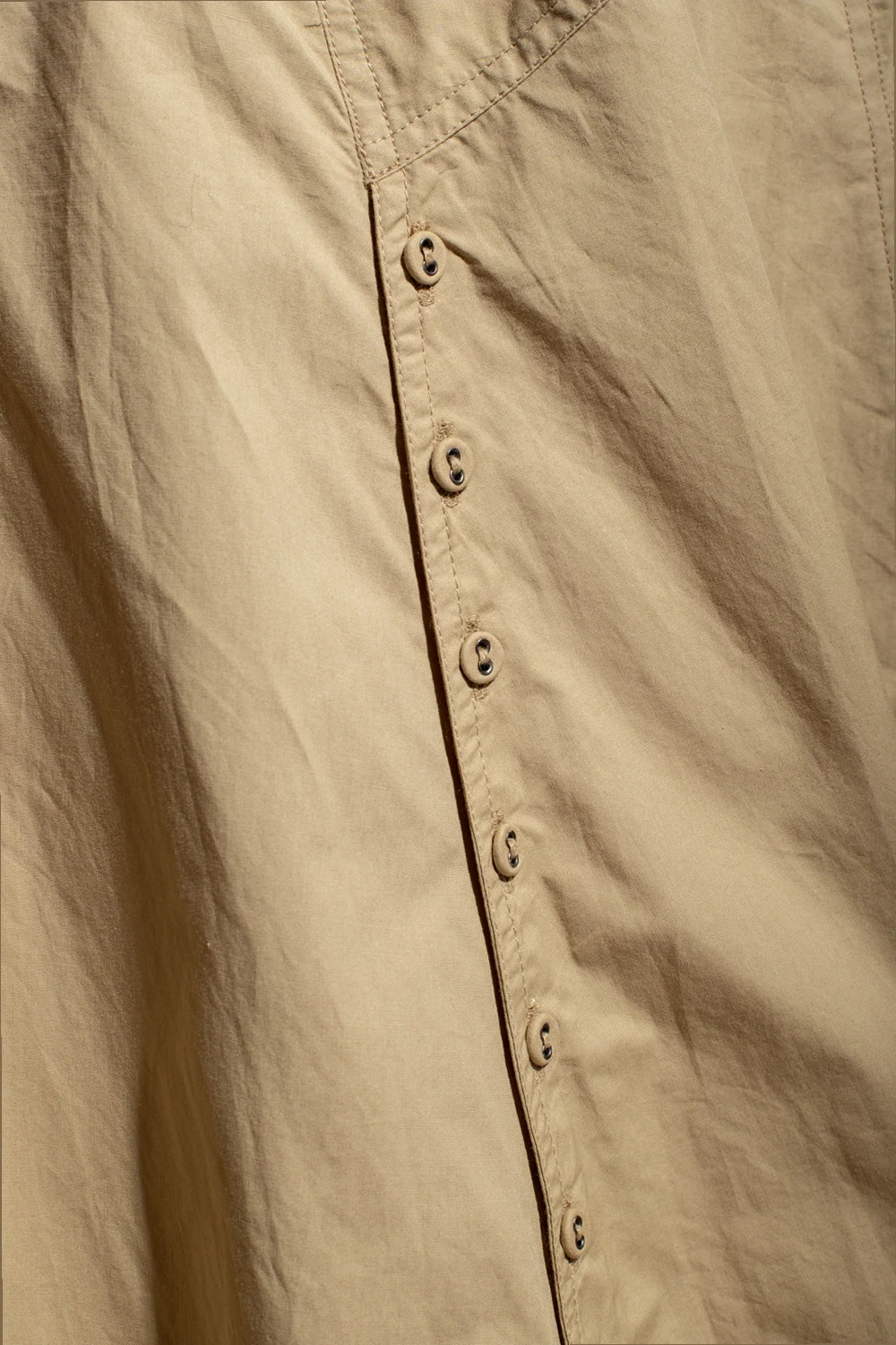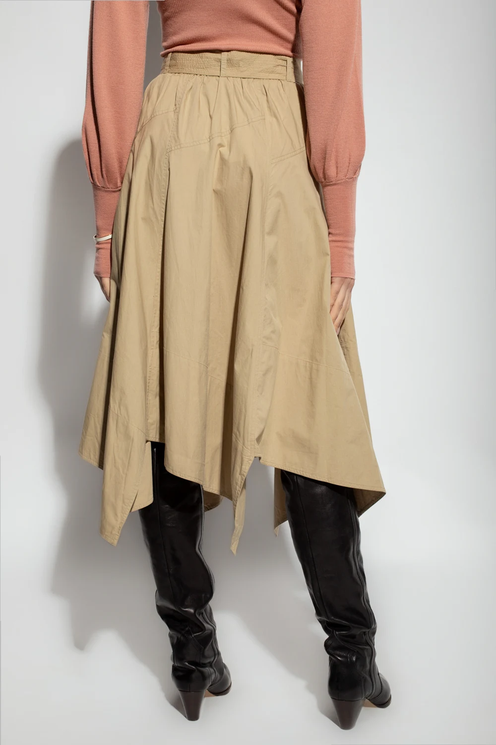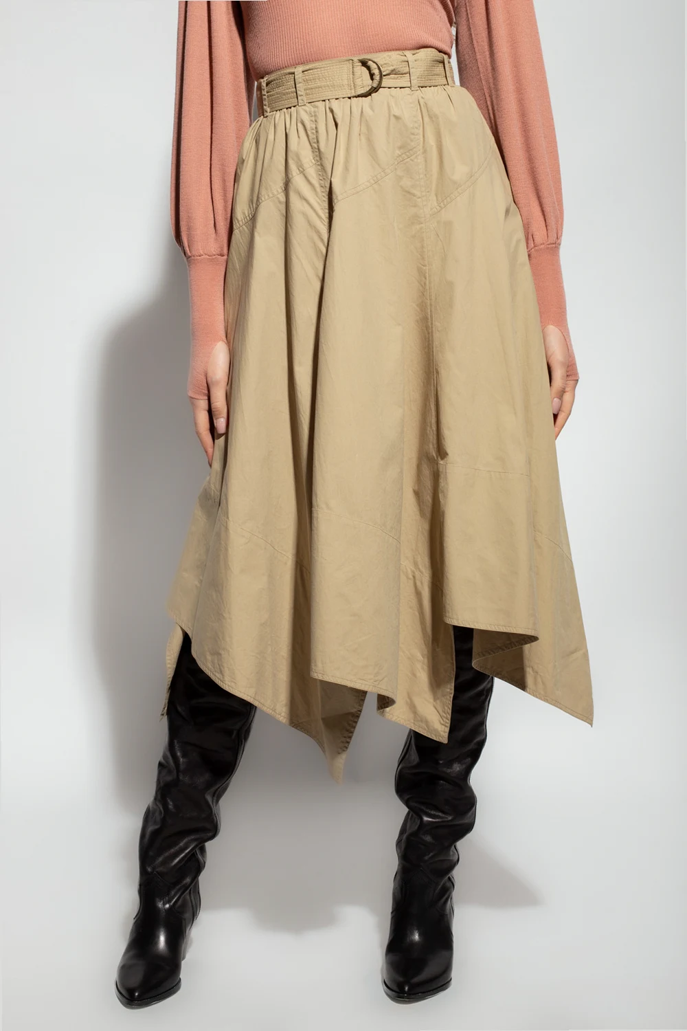 Beżowa, bawełniana, rozkloszowana spódnica, model ‘Helaine’ Ulla Johnson. Zapinana na guziki i zamek z haftką. W pasie pasek z klamrą. Asymetryczny dół.