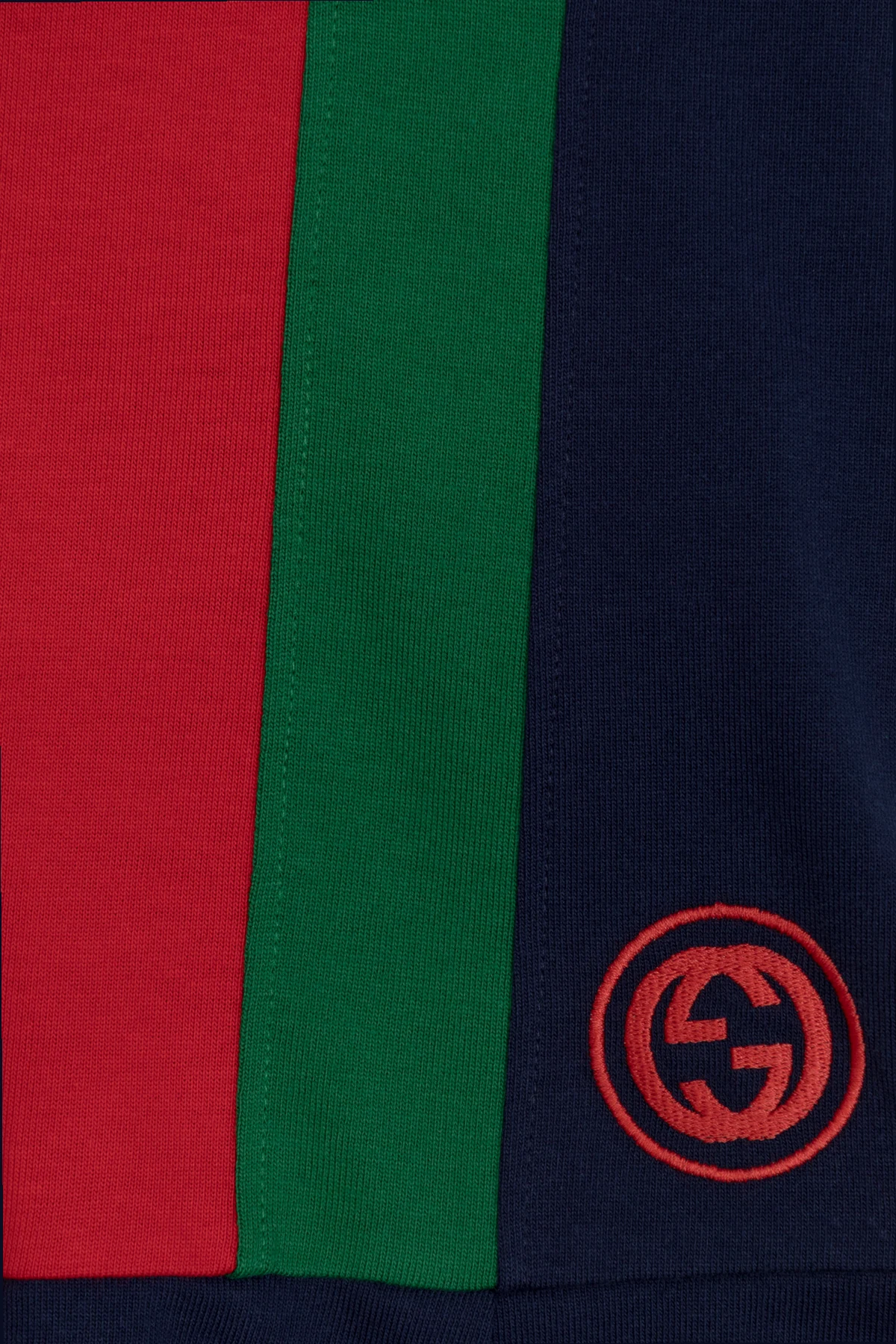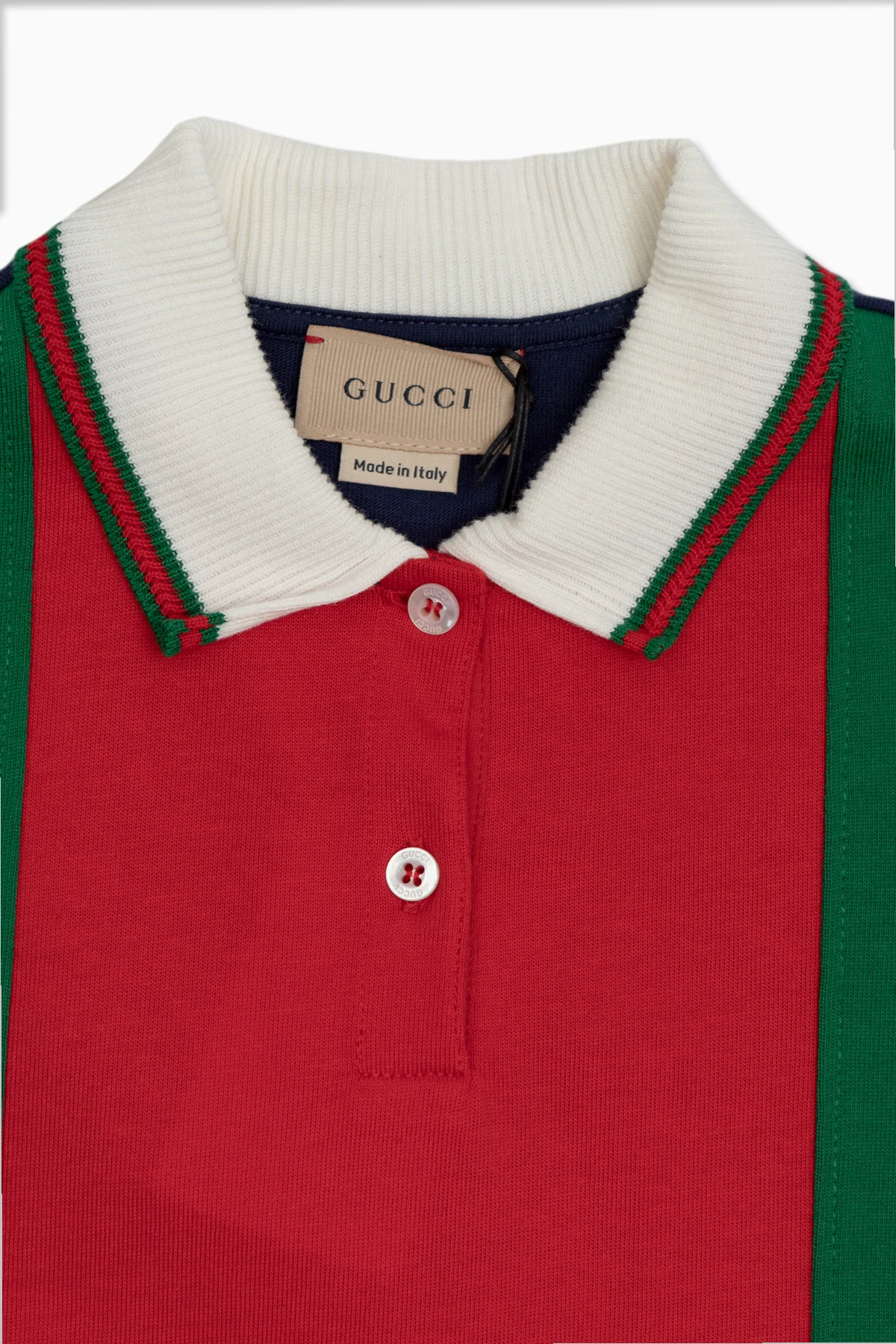 Metka z napisem "GUCCI" oraz informacją "Made in Italy" umieszczona przy kołnierzyku potwierdza autentyczność produktu i dbałość o najmniejsze detale.