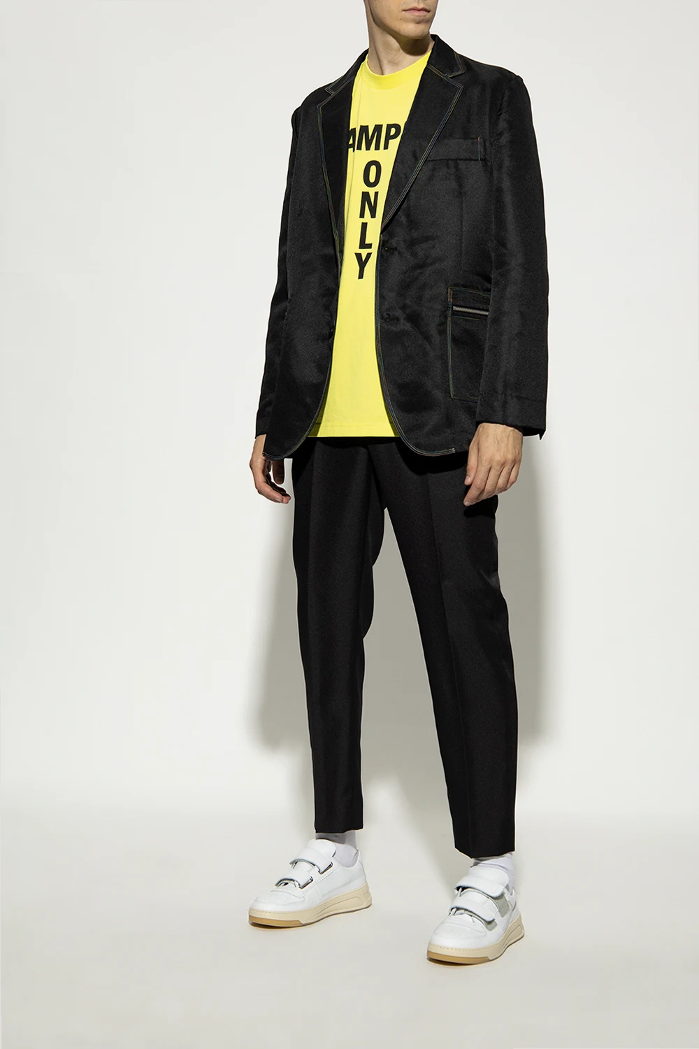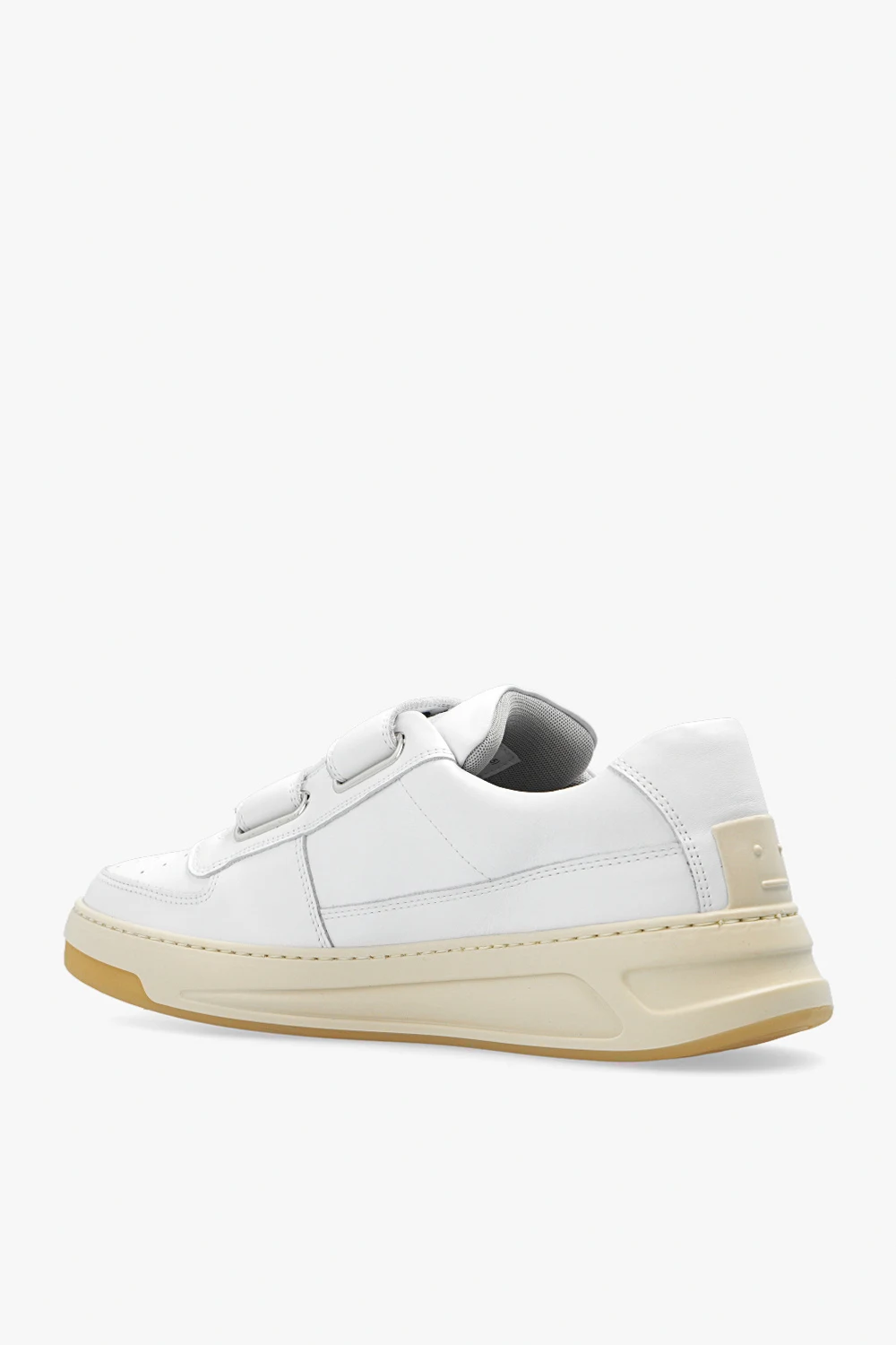 Białe, skórzane buty sportowe, model ‘Perey’ Acne Studios. Zapinane na podwójne rzepy. Przód ozdobiony perforacją. Profil z nadrukowanym logo w kolorze złotym. Z tyłu gumowa aplikacja z logo ‘Face’ w kolorze kremowym. Kremowo-beżowa podeszwa wykonana z gumy.