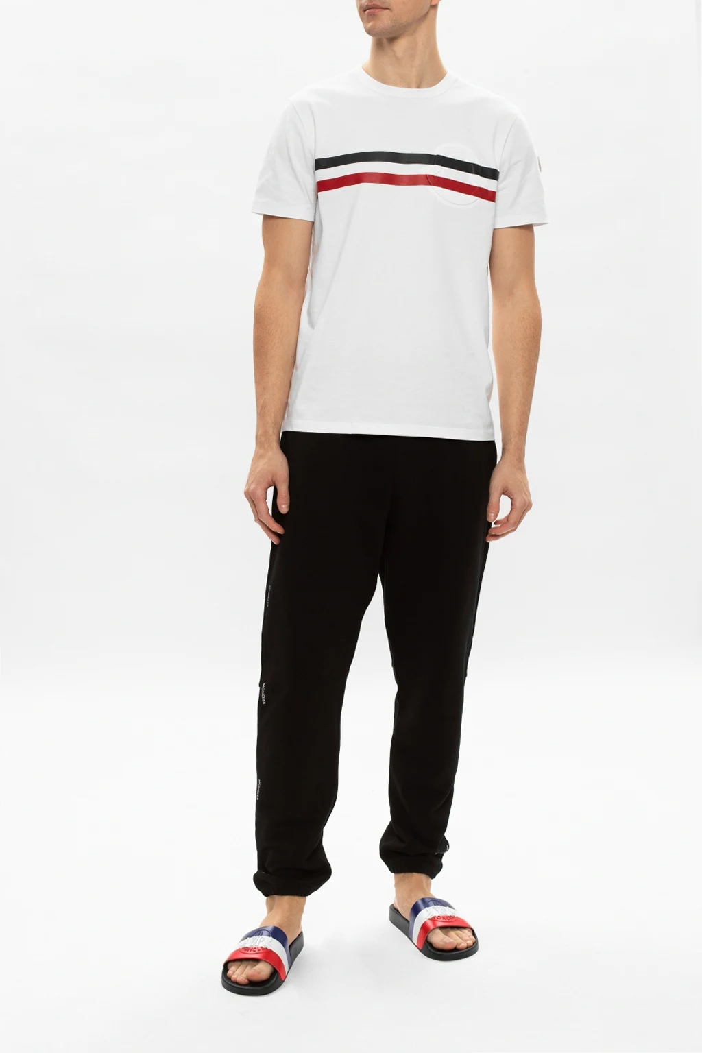 Granatowo-biało-czerwone klapki, model ‘Basile’ Moncler. Wypukłe logo. Czarna, gumowa podeszwa.