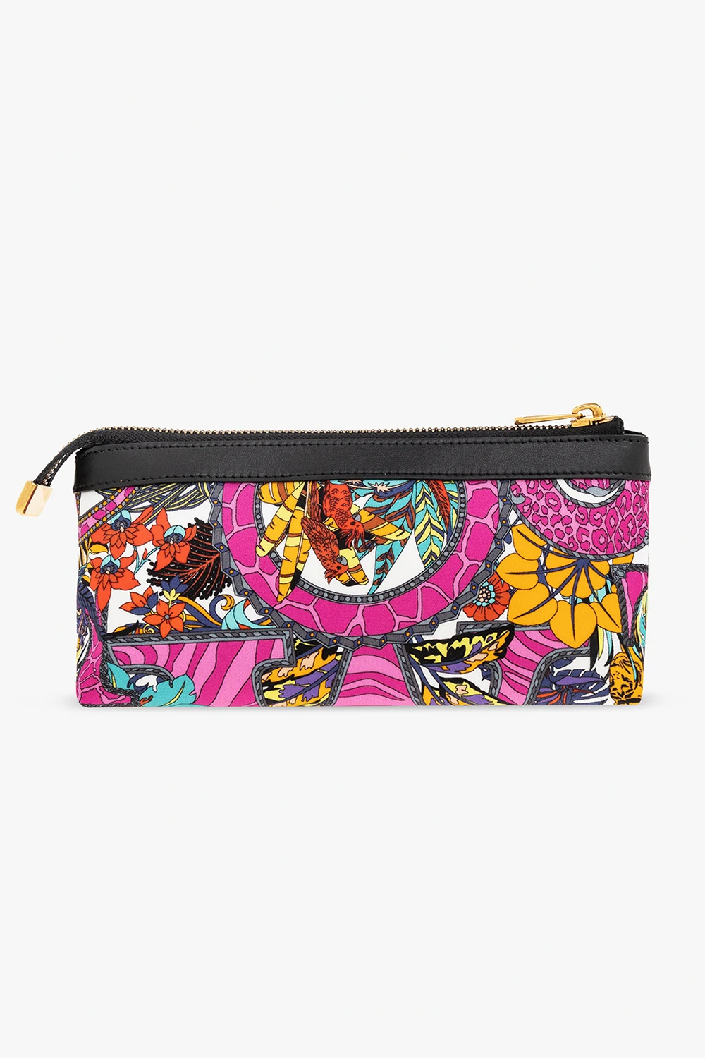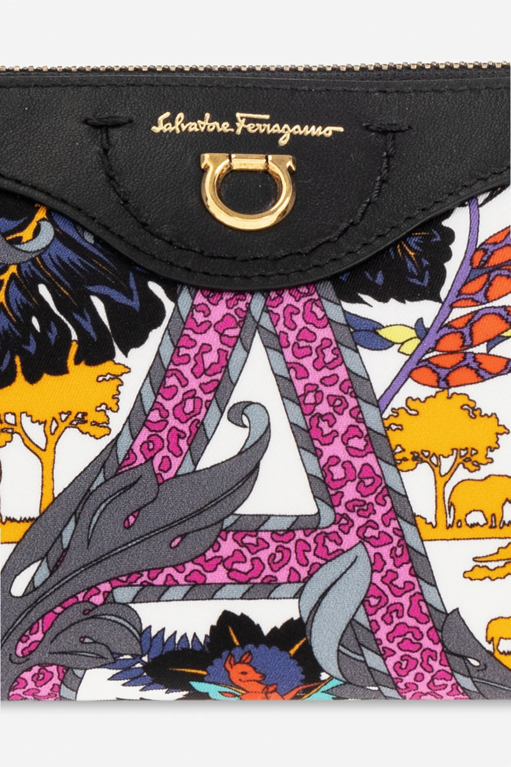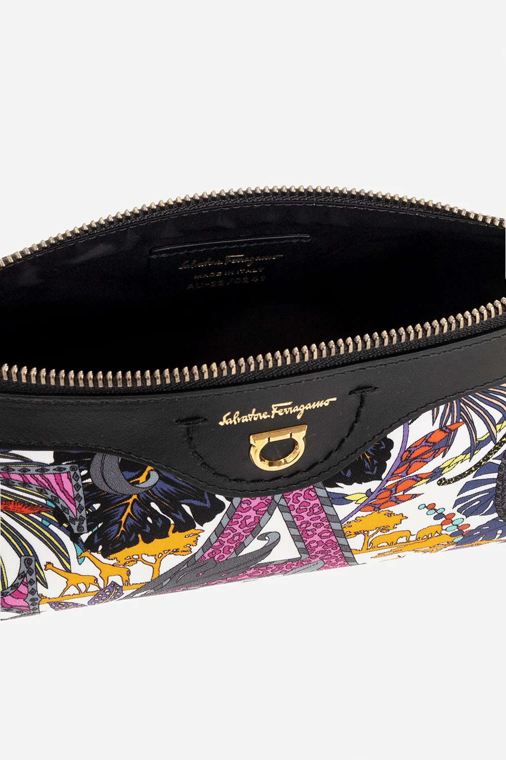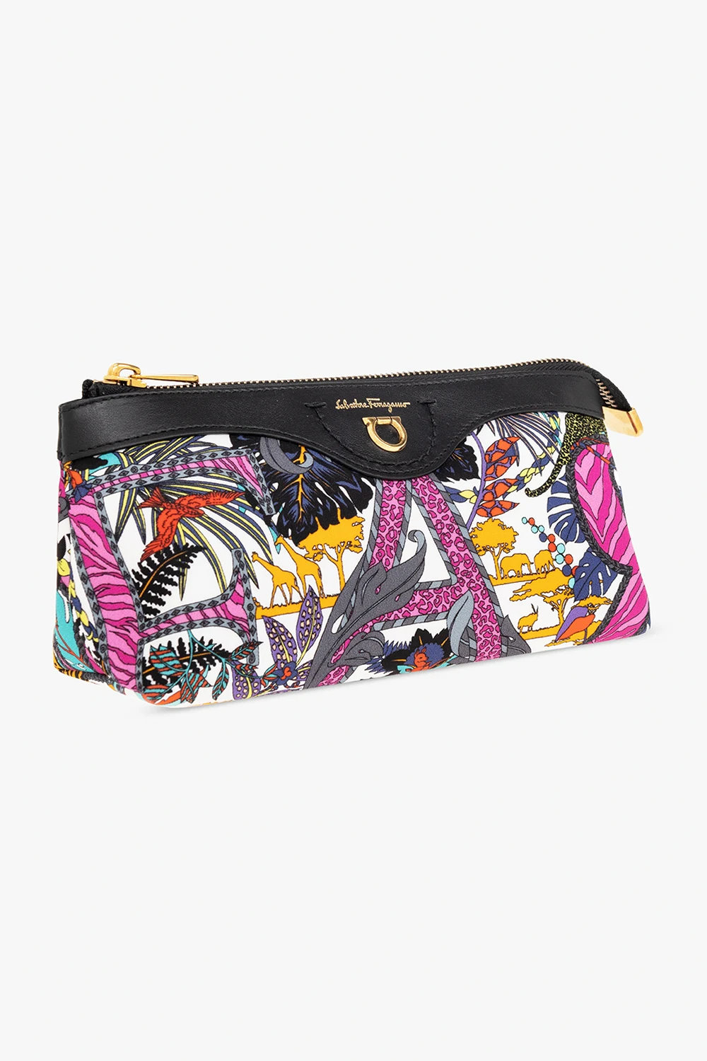 Kolorowa kosmetyczka Salvatore Ferragamo. wykonana z ECONYL®- włókna w 100% zregenerowanego z odpadów nylonowych, takich jak sieci rybackie. Zamykana na zamek. Ozdobiona wzorem ‘Vimini’. Z przodu metalowa aplikacja ‘Gancini’ i logo. Wewnątrz komora. Metalowe elementy w kolorze złotym.