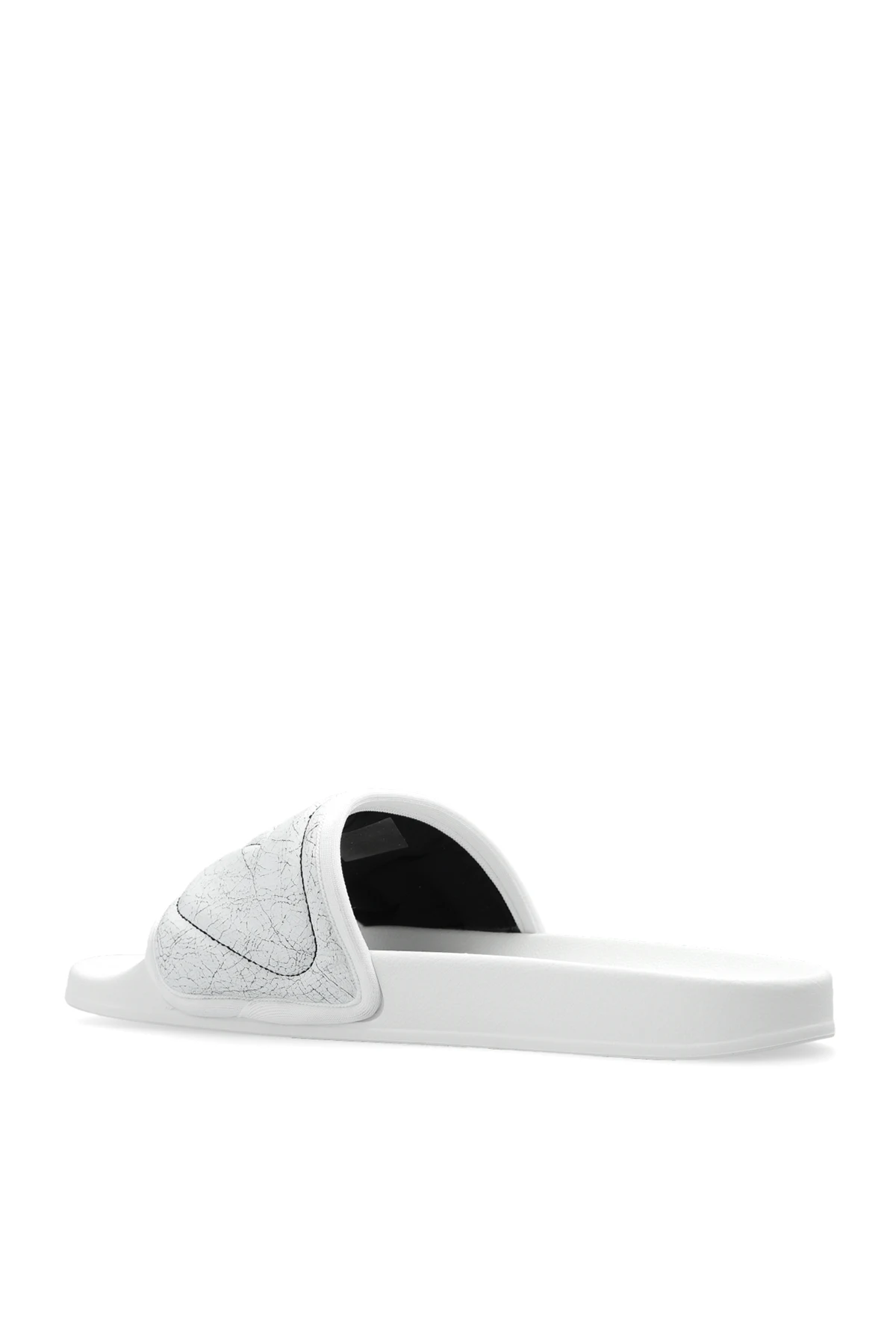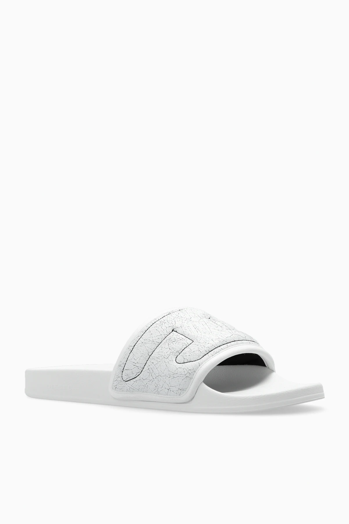 Biało-czarne klapki, model ‘MAYEMI’ Diesel. Wykonane z materiału z efektem pęknięć. Ozdobione pikowanym logo. Biała, gumowa podeszwa.