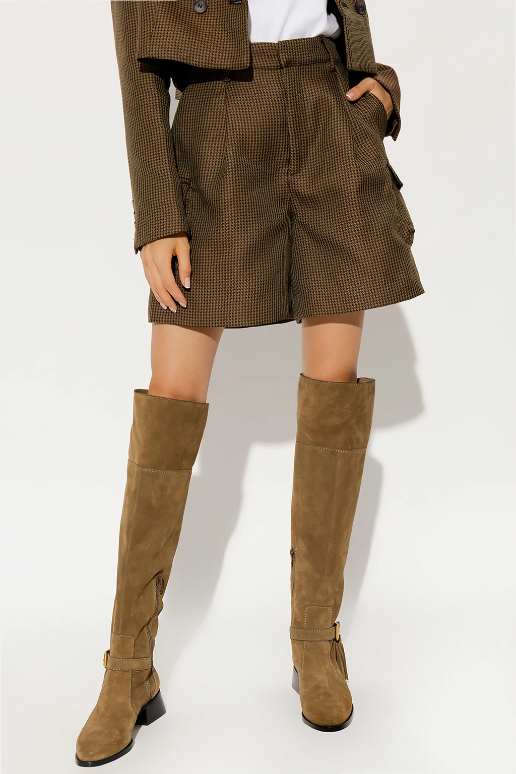 Brązowo-czarno-zielone szorty z wysokim stanem, model ‘SanaiGZ’ Gestuz. Zapinane na zaczepy, guzik oraz zamek. Ozdobione wzorem w pepitkę. Cztery kieszenie: dwie wsuwane z przodu oraz dwie z patkami zapinanymi na rzepy po bokach. Krótkie, szerokie nogawki.