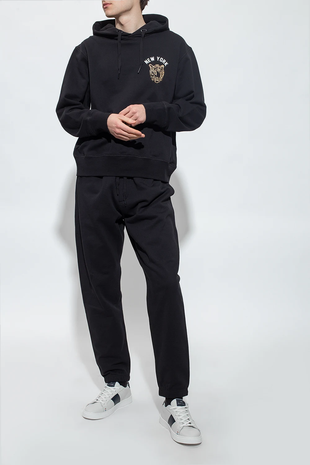 Kremowo-granatowe, sznurowane buty sportowe, model ‘Zach’ PS Paul Smith. Wykonane ze skóry krowiej. Ozdobione nadrukiem z motywem zwierzęcym oraz wytłoczonym logo. Biała, gumowa podeszwa.