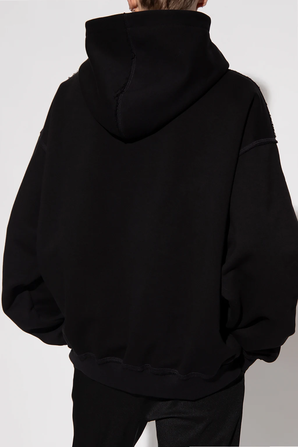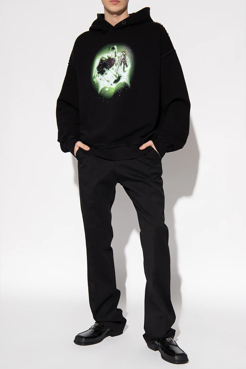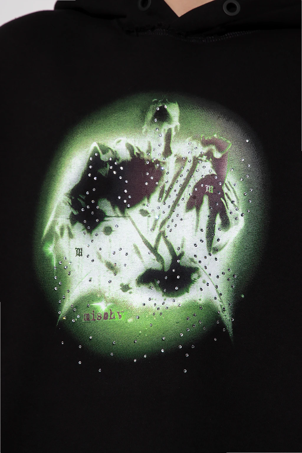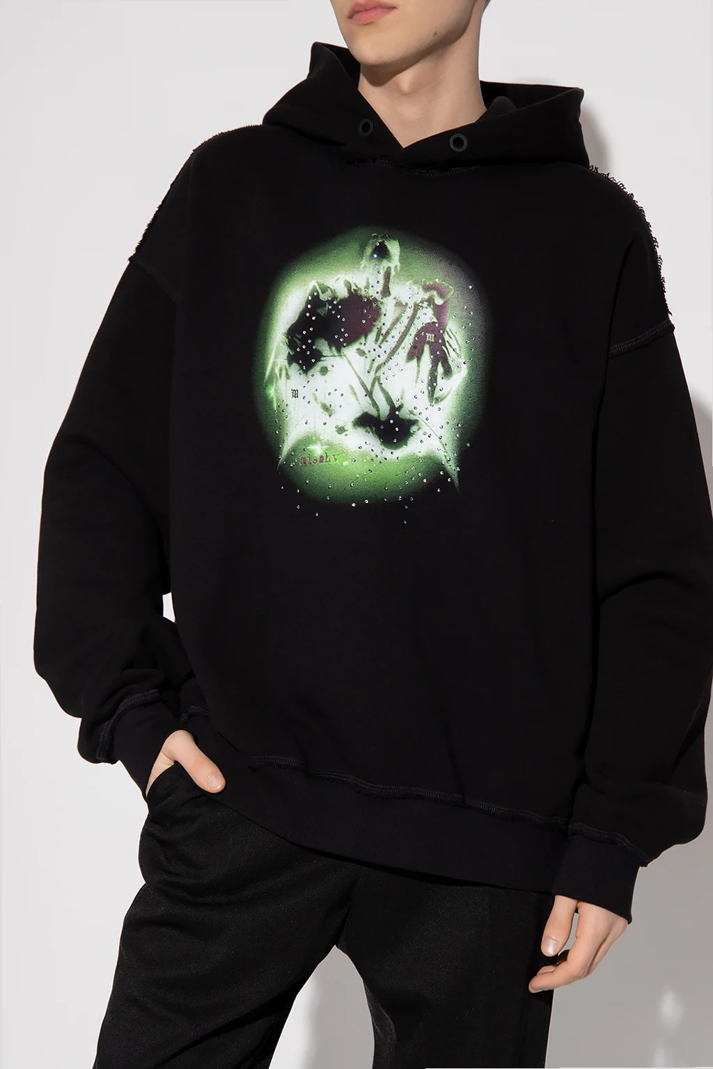 Czarna bluza z kapturem MISBHV, z kolekcji ‘Metamorphosis 1993’. Ozdobiona zielono-białym, połyskującym nadrukiem oraz wyszytym logo. Dół i długie rękawy wykończone ściągaczem. Surowe wykończenie.