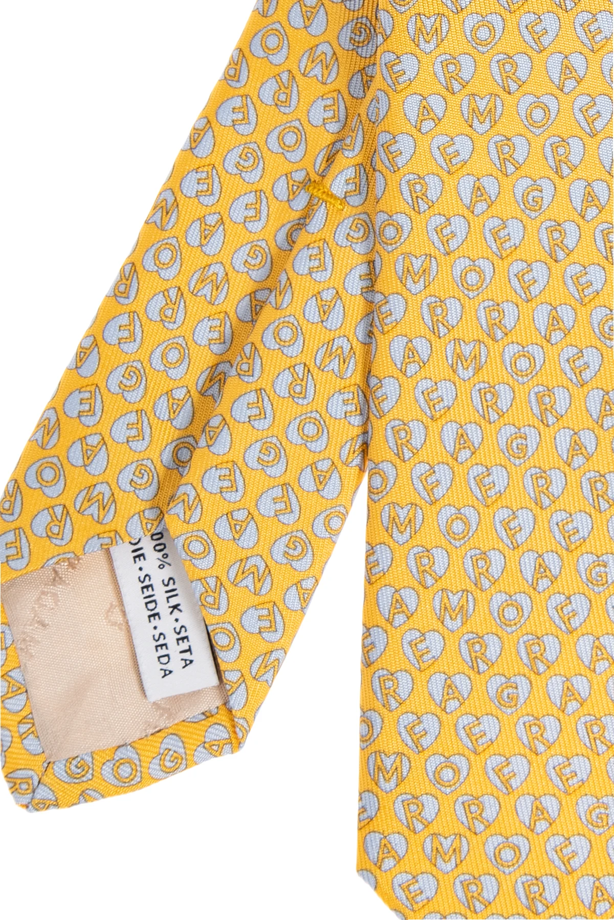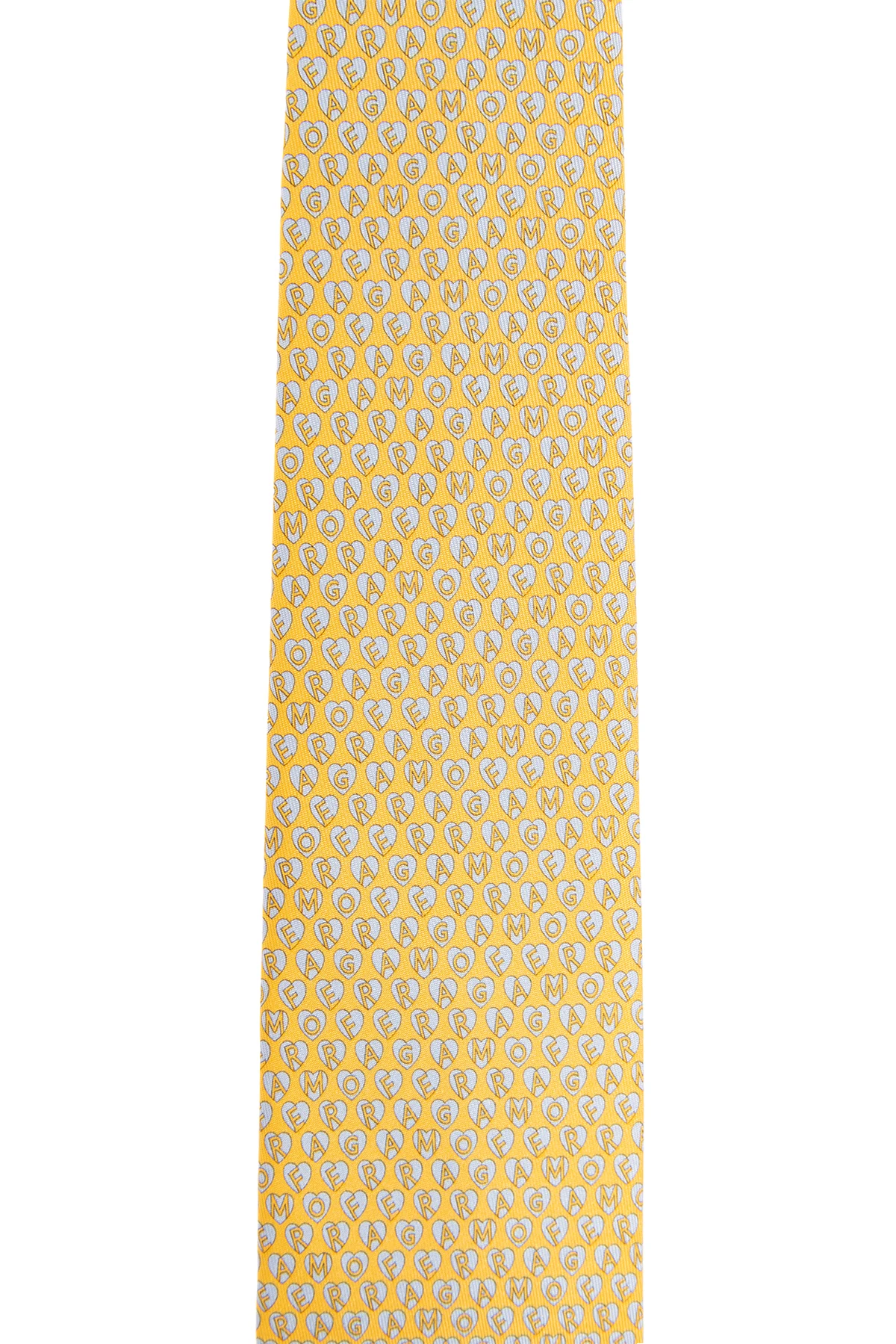 Żółty krawat FERRAGAMO. Wykonany z jedwabiu. Ozdobiony jasnoniebieskim wzorem z logo.