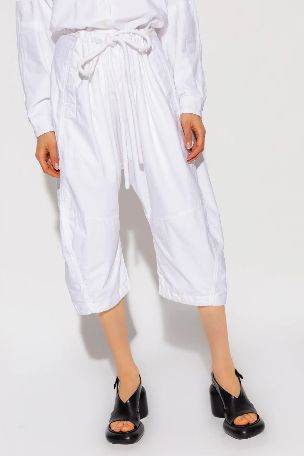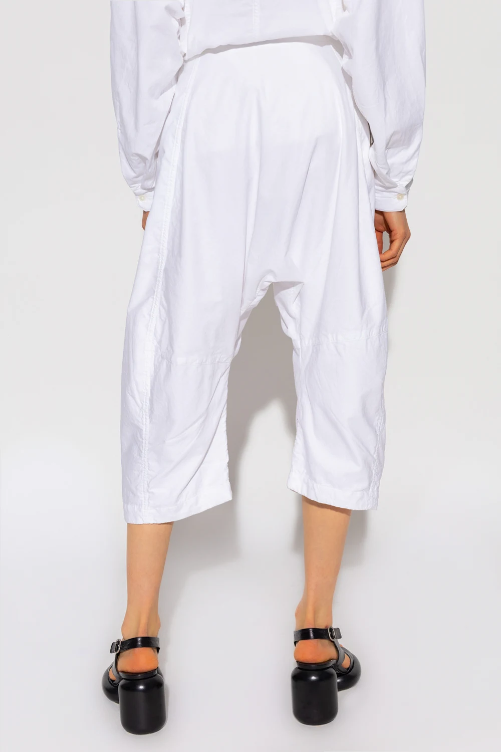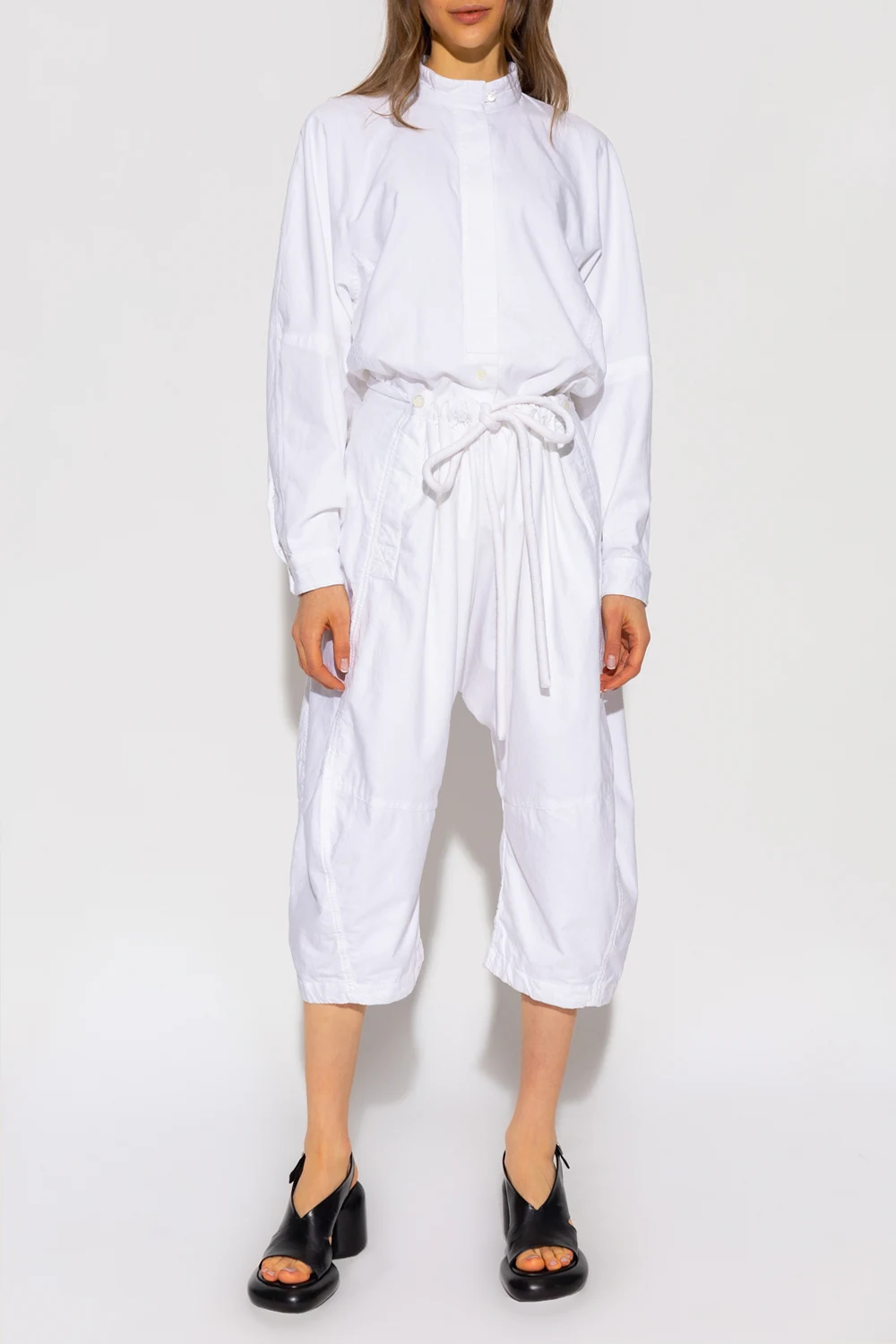 Białe, bawełniane spodnie o luźnym kroju Lemaire. W pasie wszyta guma wiązana grubymi trokami. Dwie wsuwane kieszenie. Luźne nogawki o długości trzy czwarte.