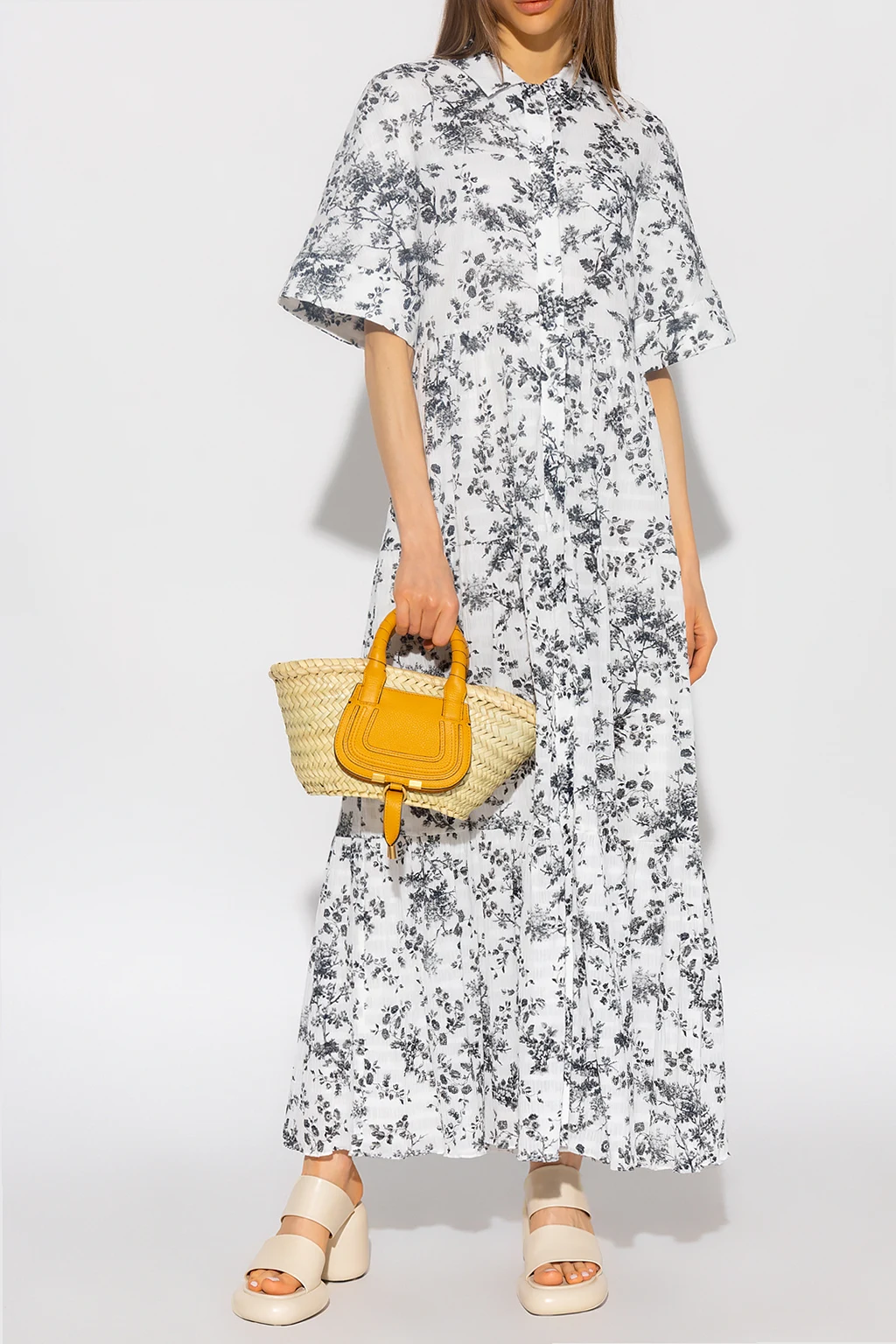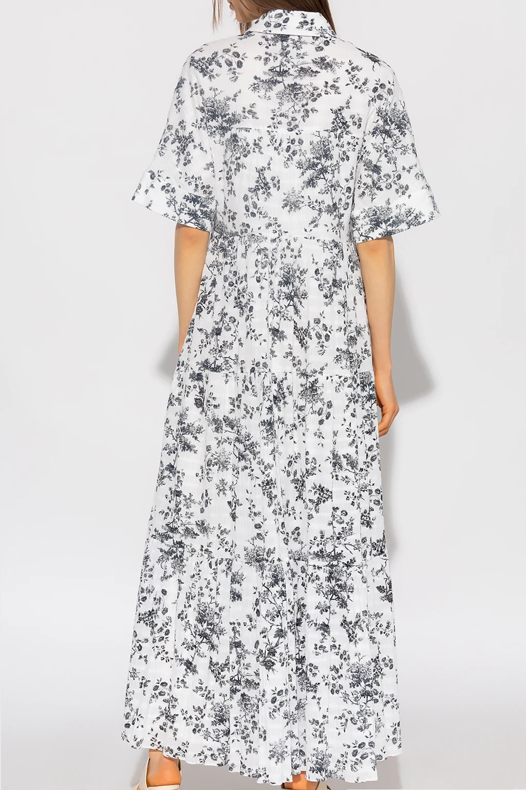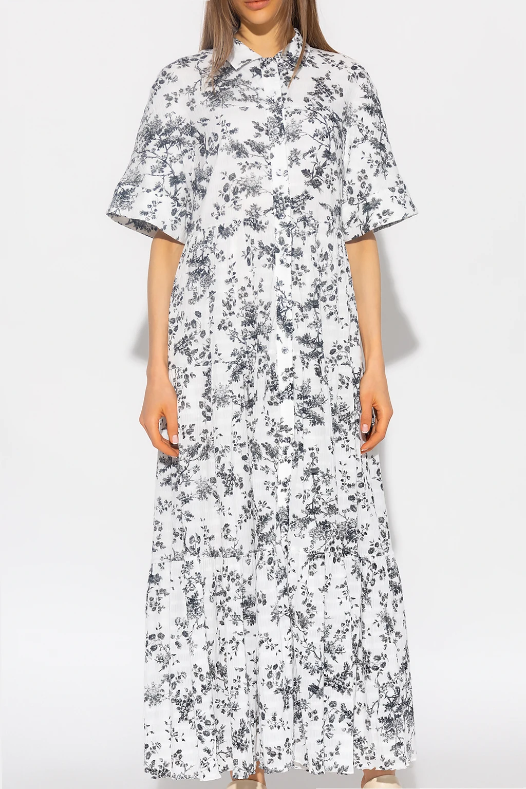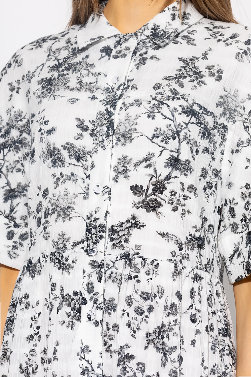 Biała, bawełniana sukienka z kołnierzem, model ‘Kate’ Erdem. Zapinana z przodu na guziki. W talii wszyta guma. Ozdobiona szaro-czarnym wzorem z motywem kwiatowym oraz delikatnymi marszczeniami na całej długości. Krótkie rękawy zakończone mankietami. Rozszerzany dół wykończony falbanami.