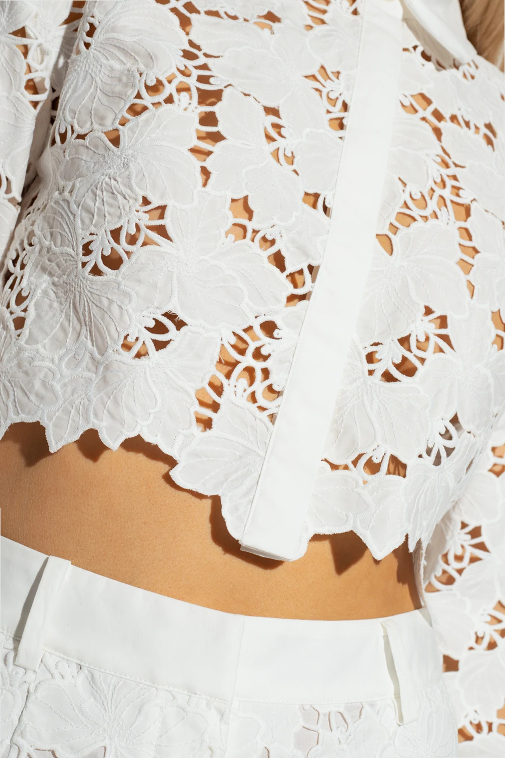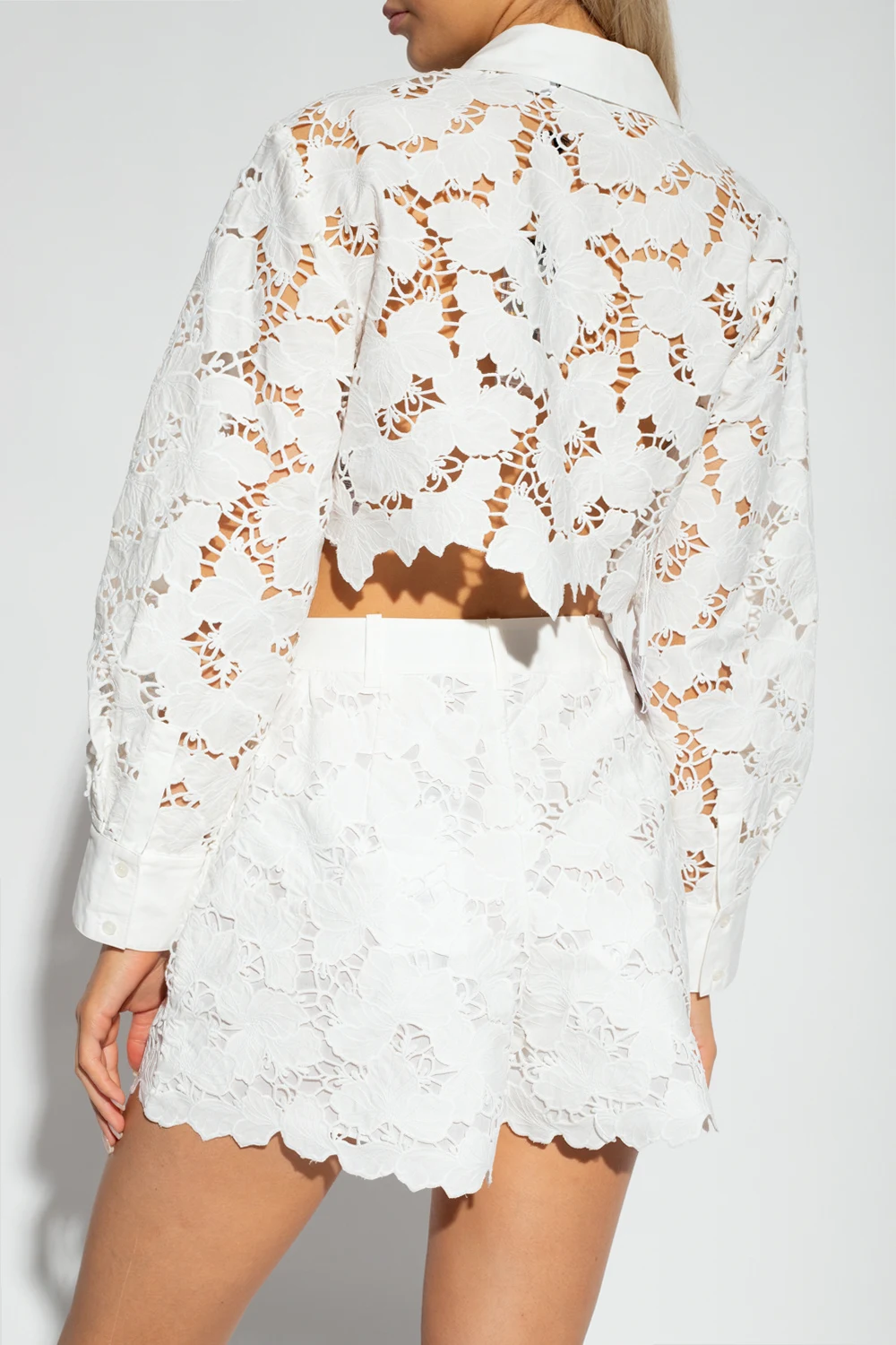 Krótki, biały, bawełniany top o luźnym kroju Self Portrait. Zapinany z przodu na guziki. Długie rękawy, mankiety zapinane na guziki.