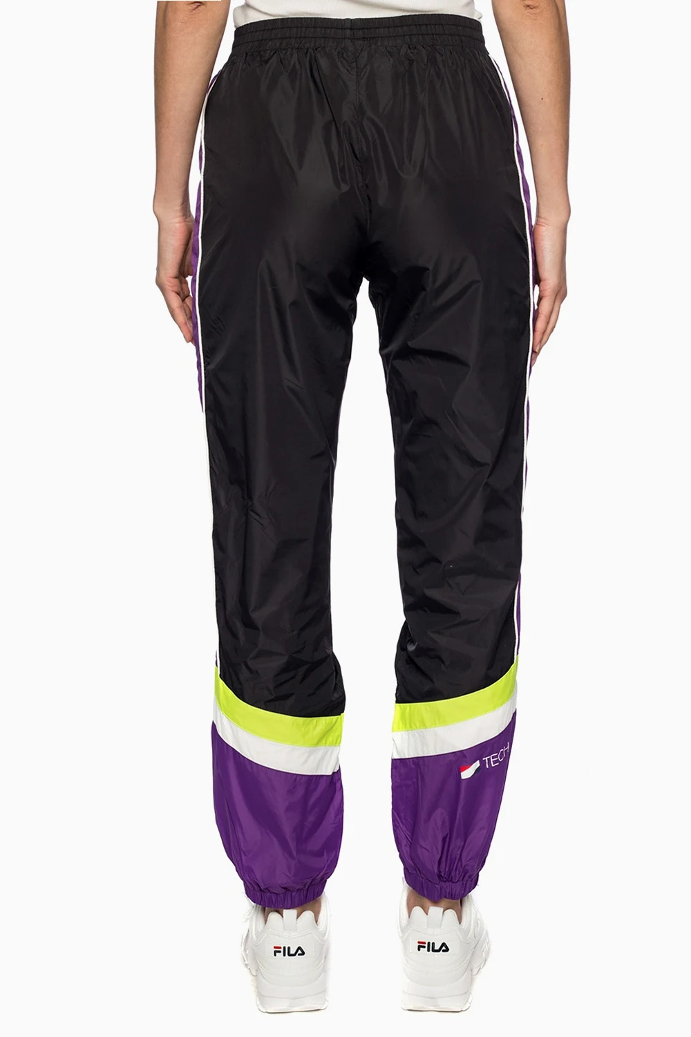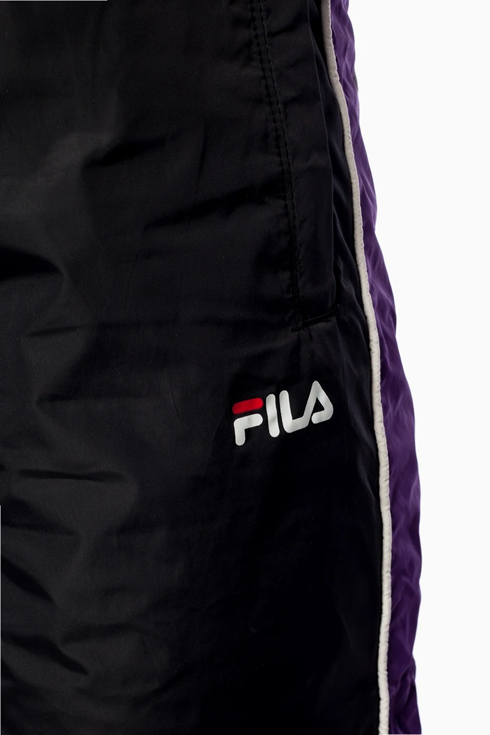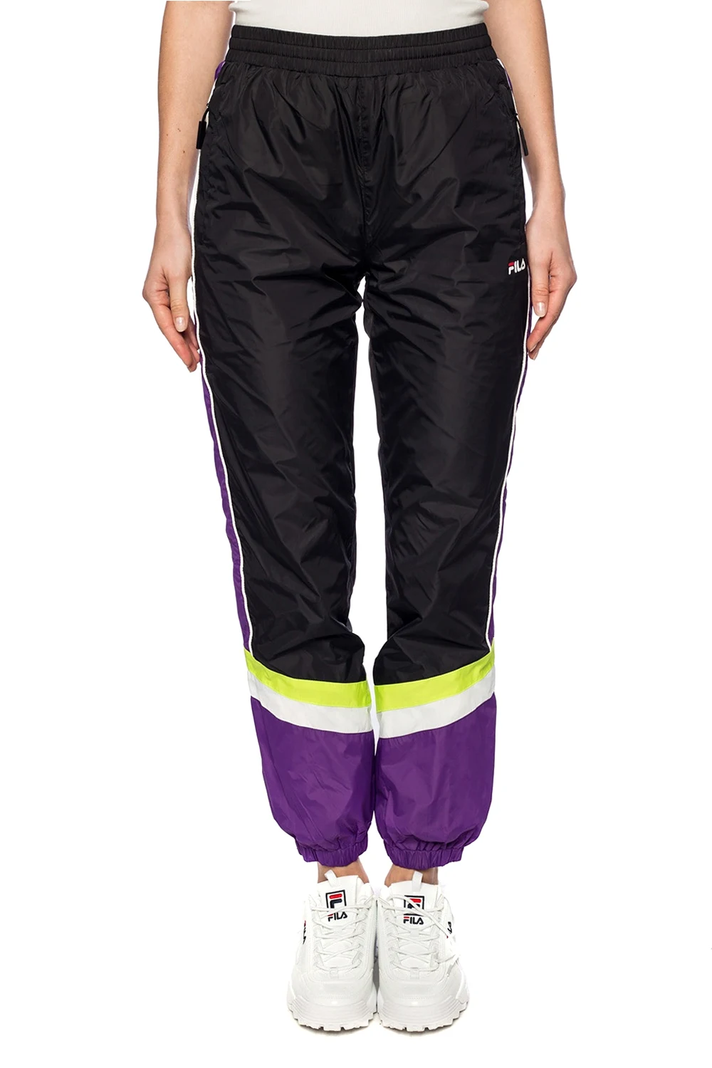 Czarne spodnie dresowe Fila. W pasie ściągane trokami. Z przodu nadrukowane logo. Kolorowe wstawki. Dwie kieszenie zapinane na zamek.