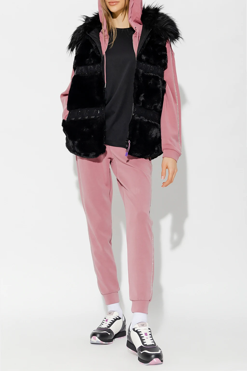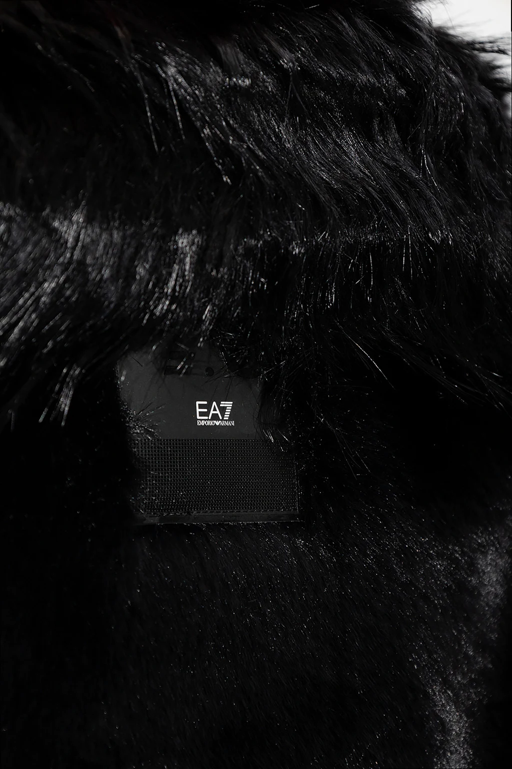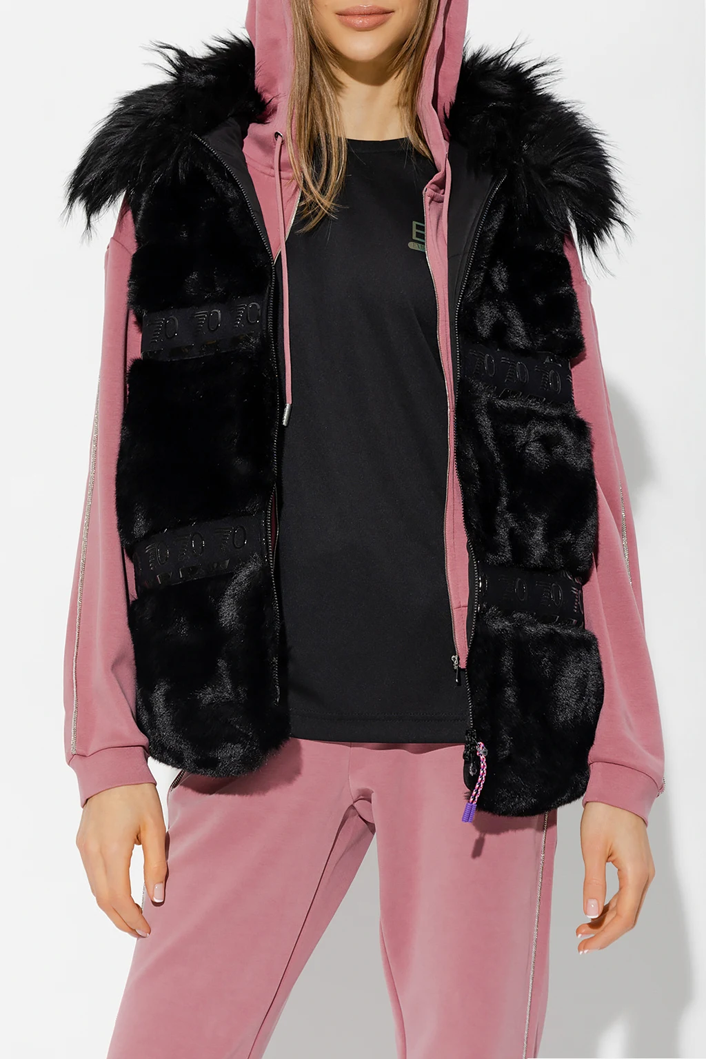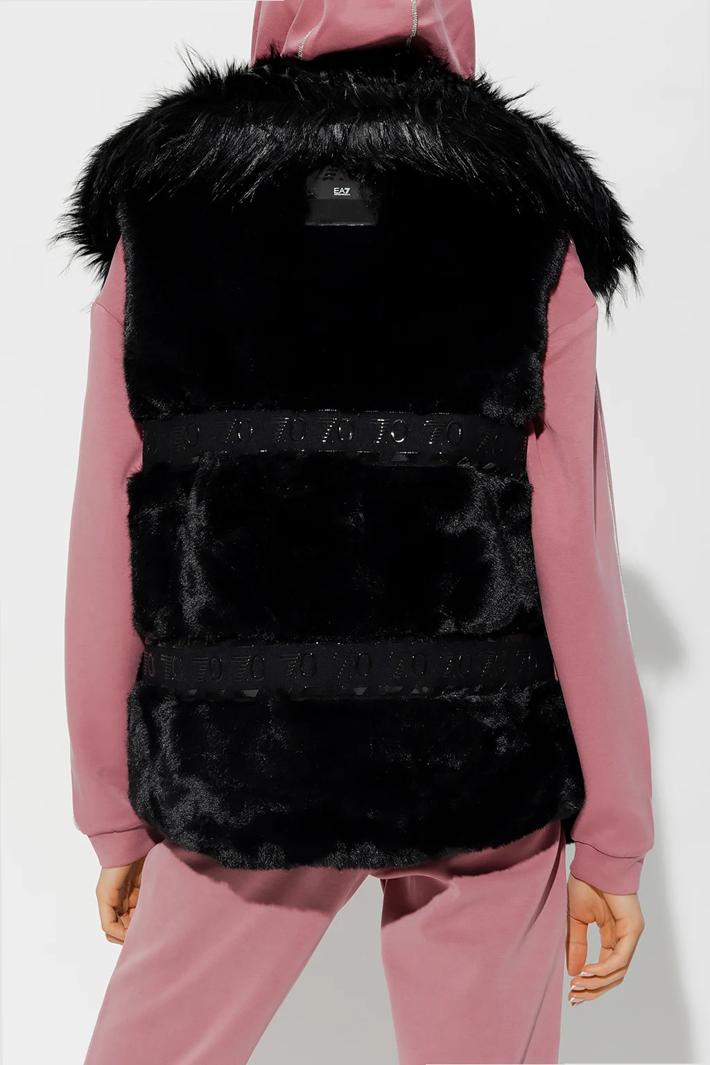 Czarna kamizelka EA7 Emporio Armani. Wykonana z imitacji futra. Zapinana na dwubiegunowy zamek. Ozdobiona elastycznymi taśmami z aplikacją z logo. Dwie wsuwane kieszenie.