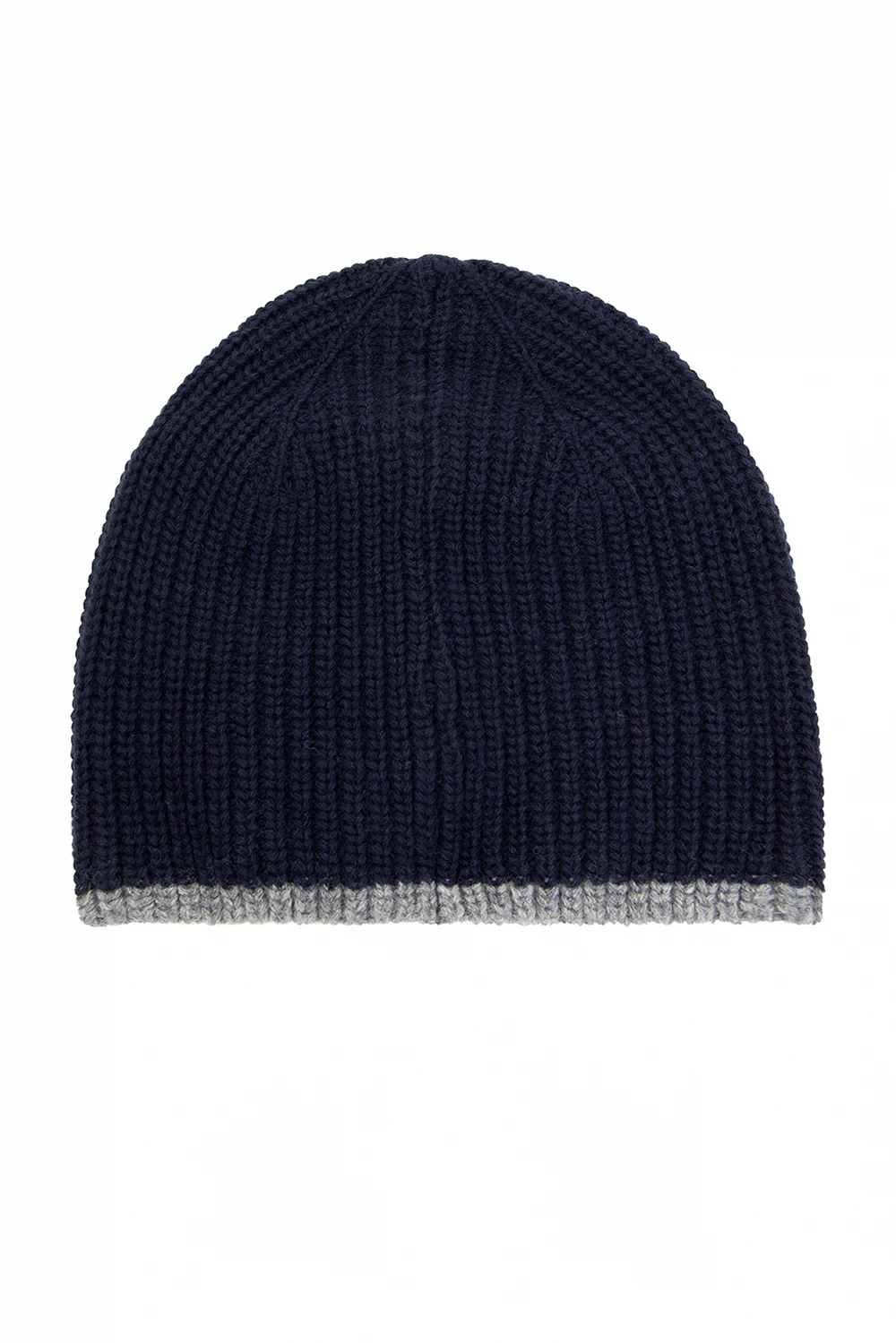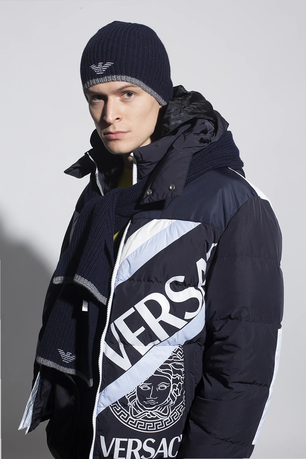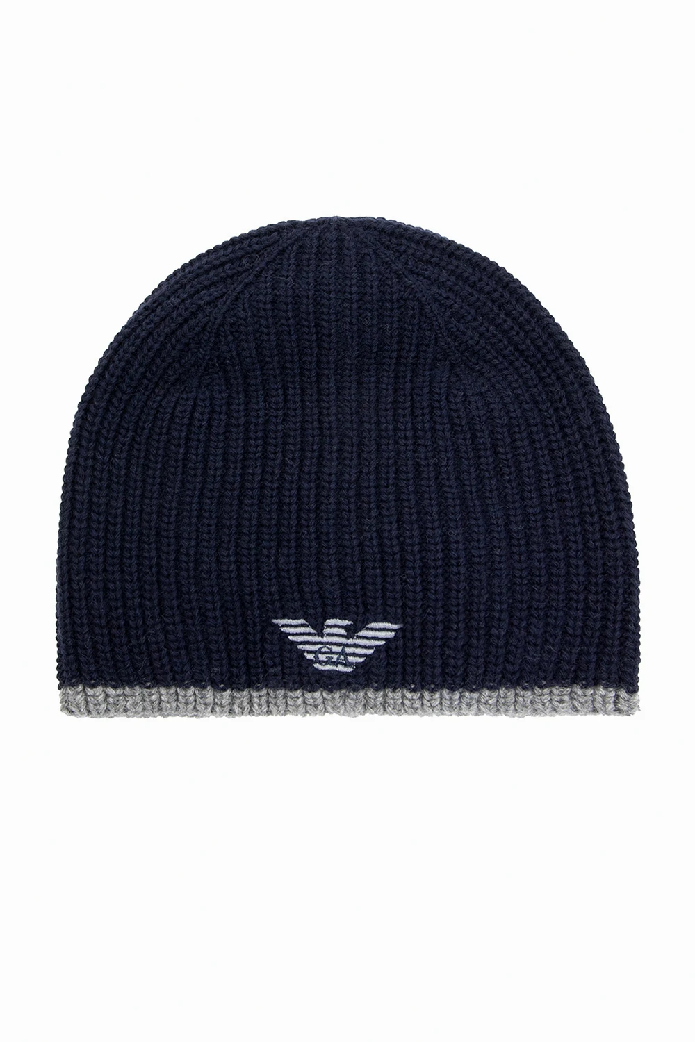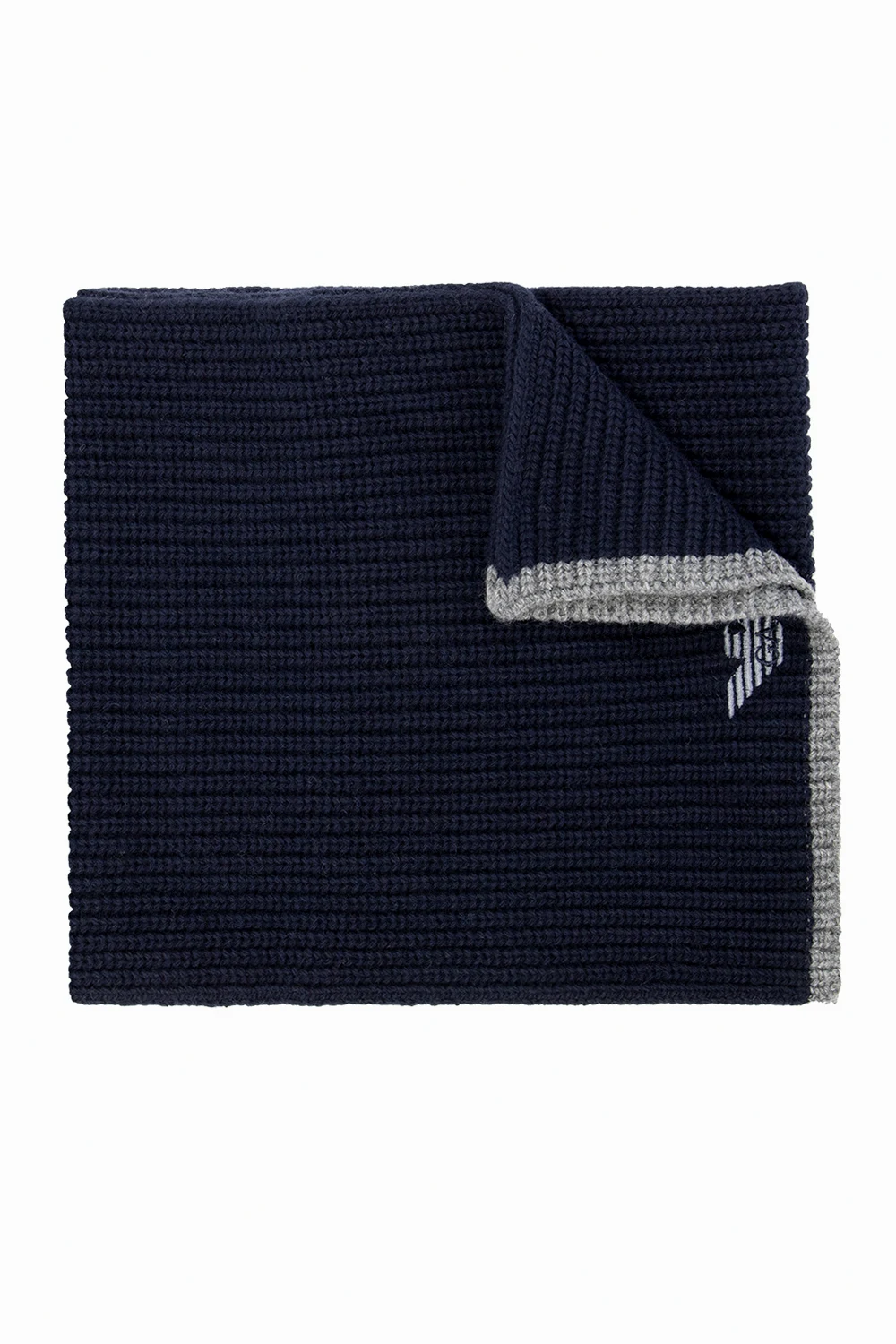 Granatowo-szary, pleciony komplet: szalik i czapka Emporio Armani. Ozdobione wyszytym logo.
