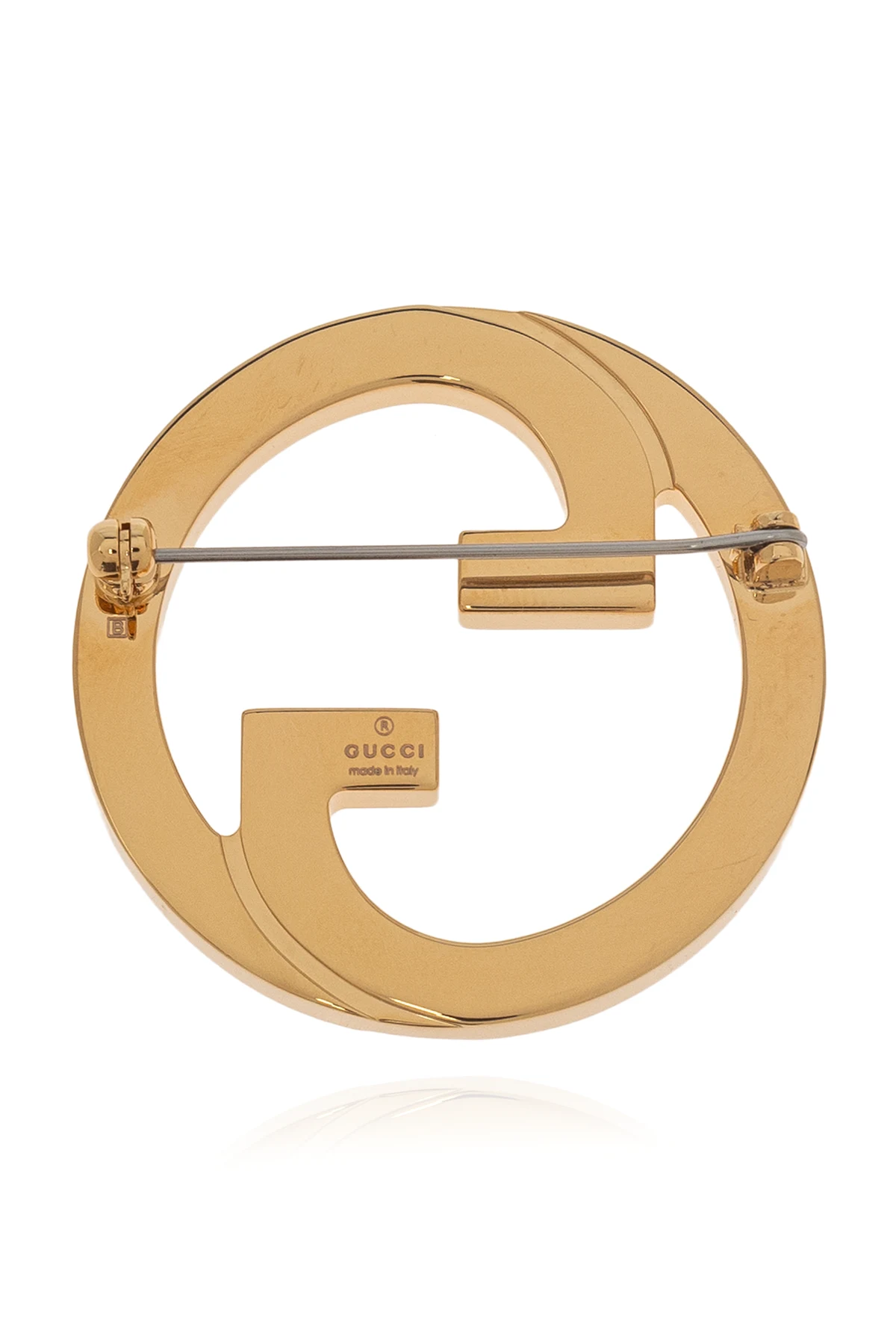 Powierzchnia przypinki jest gładka, a złoty kolor podkreśla jej ekskluzywny charakter. Na tylnej stronie znajduje się mechanizm zapięcia, umożliwiający bezpieczne przypięcie do odzieży. Dodatkowo, wygrawerowane logo "GUCCI" oraz napis "Made in Italy" potwierdzają autentyczność produktu.