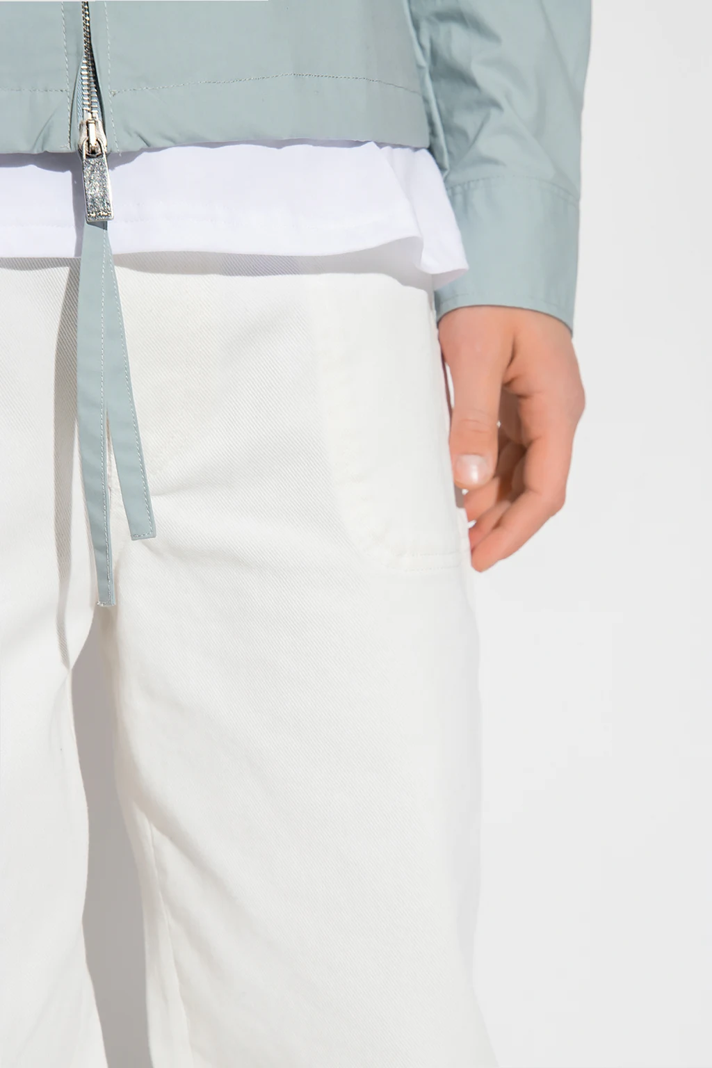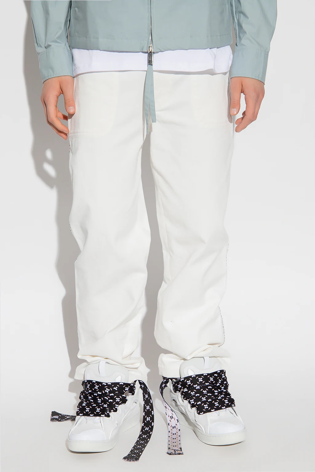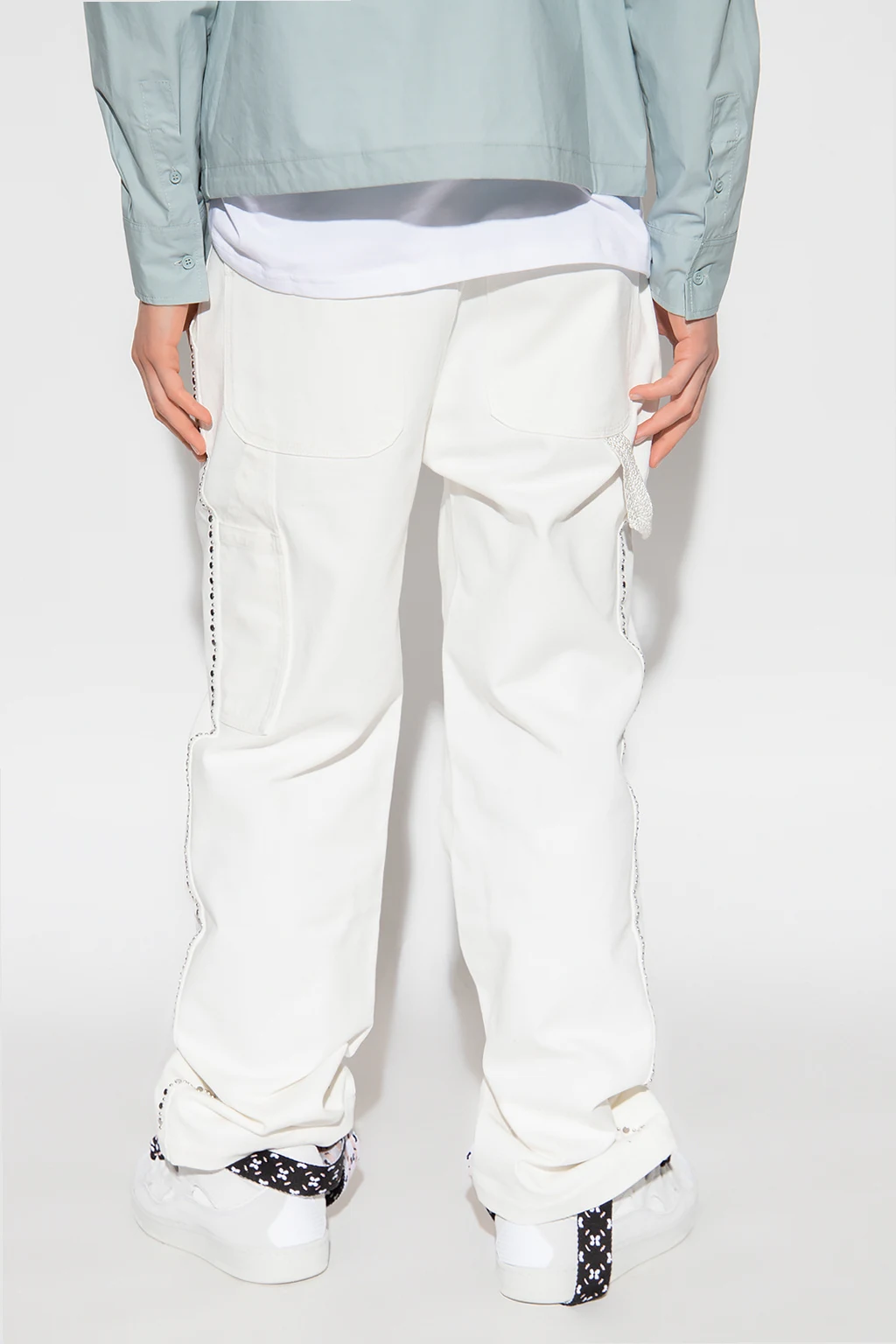 Białe jeansy Wales Bonner. Wykonane z bawełny. Zapinane na zamek oraz guzik. Pięć kieszeni wsuwanych. Ozdobione ćwiekami w kolorze srebrnym. Z tyłu naszywka z logo. Proste nogawki.