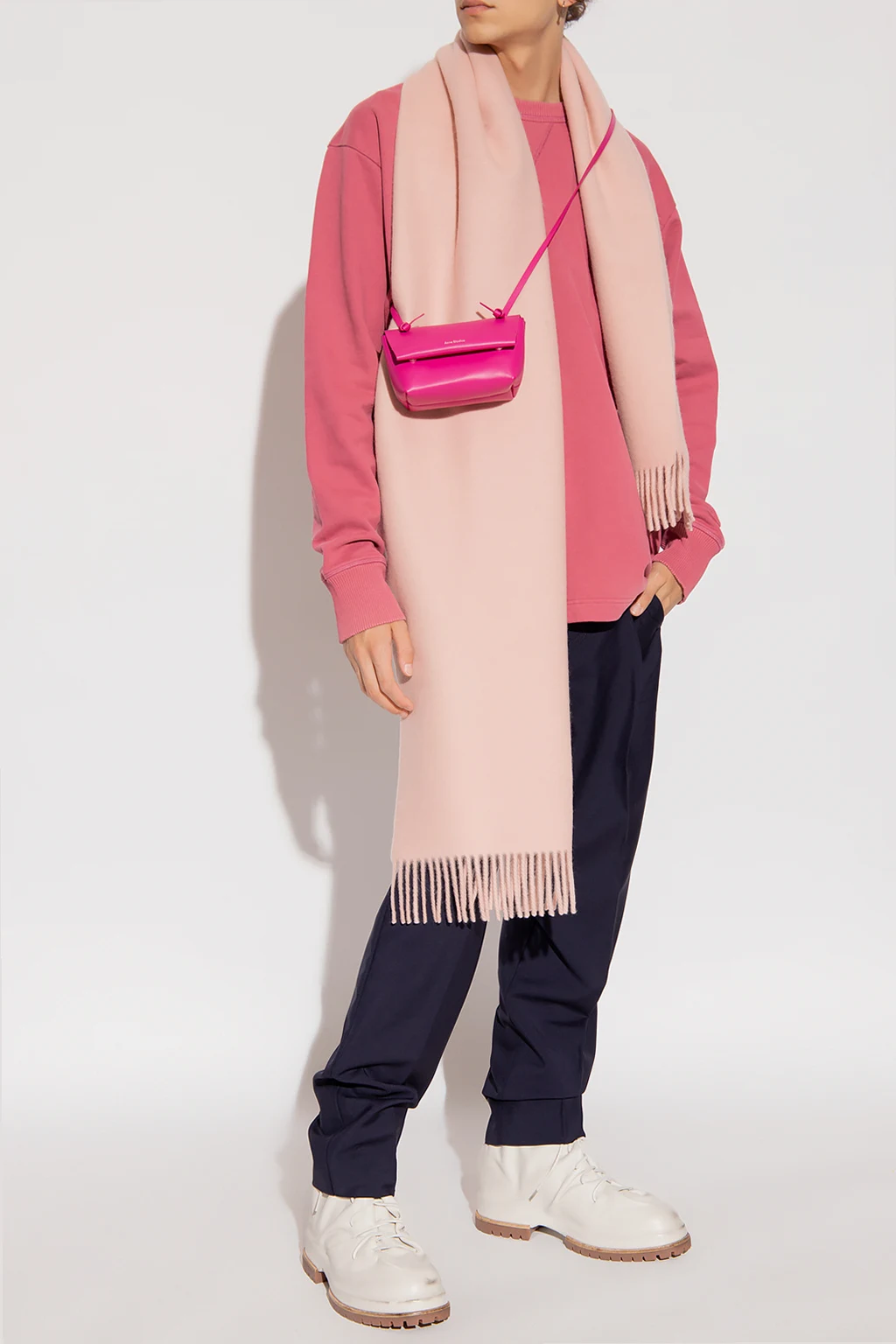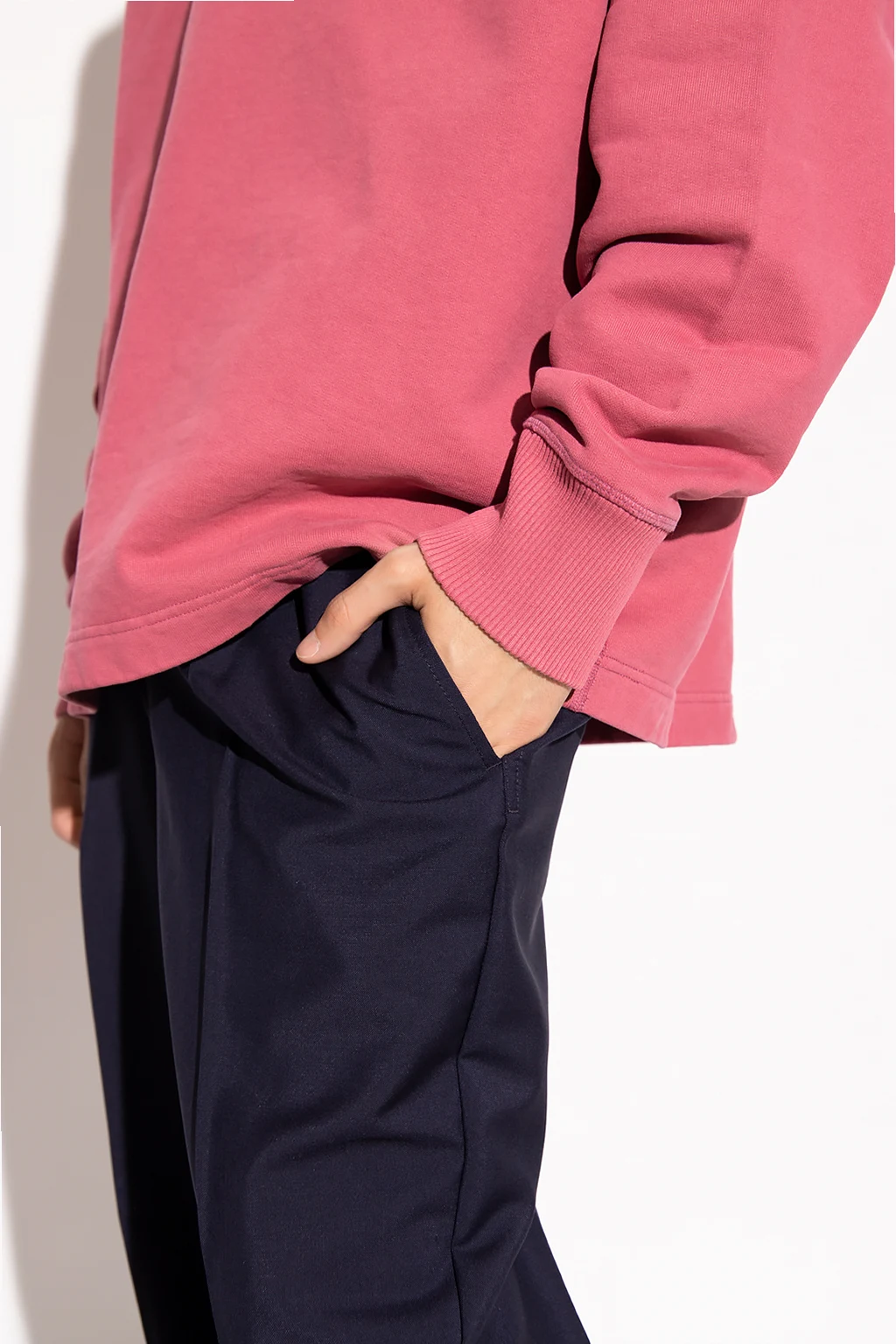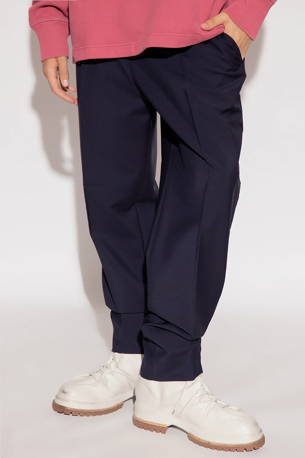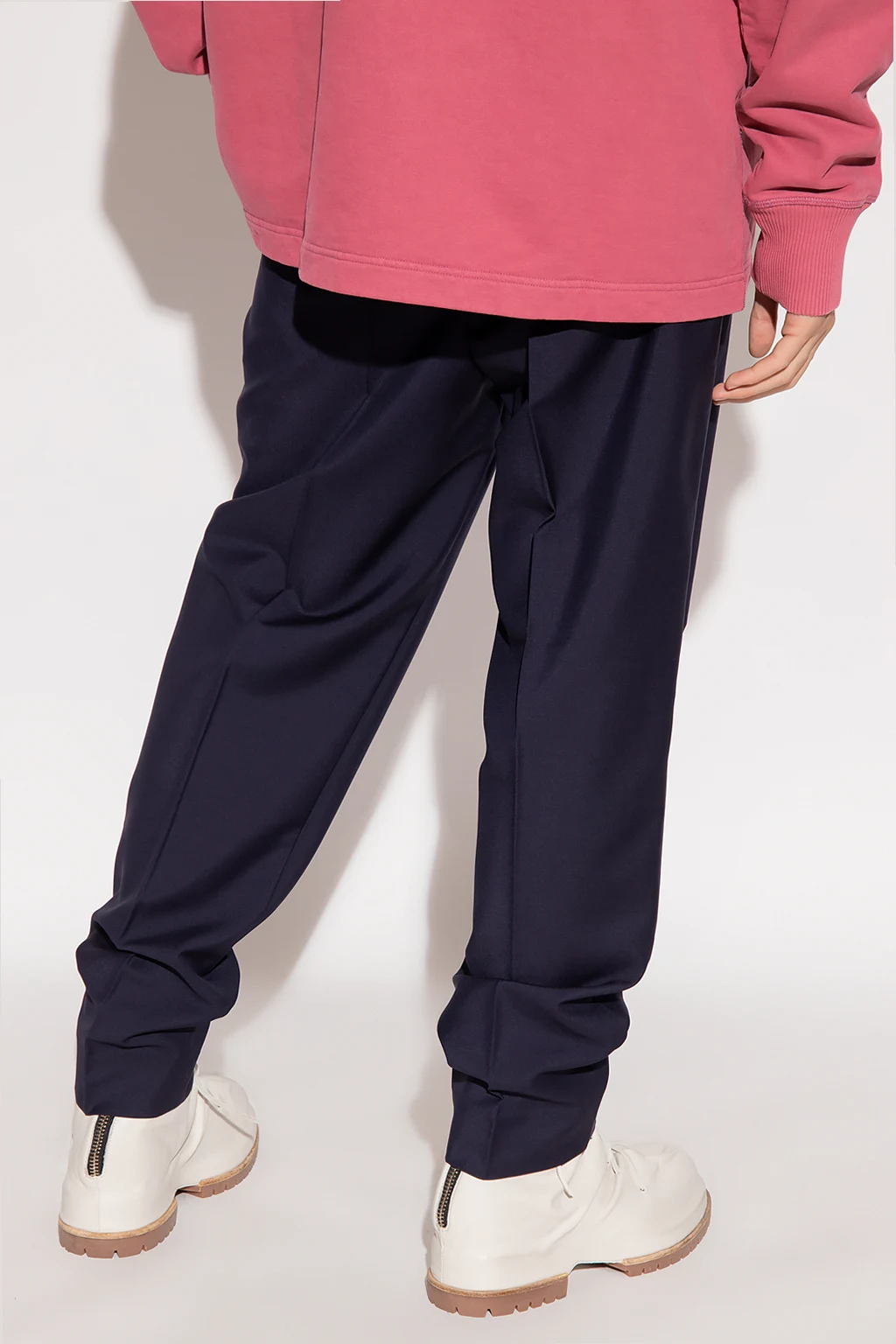 Granatowe spodnie w kant Acne Studios. Wykonane z mieszanki wełny i moheru. Zapinane na guzik, zamek oraz zaczep. Cztery wsuwane kieszenie: po dwie z przodu oraz z tyłu. Długie nogawki o prostym kroju.