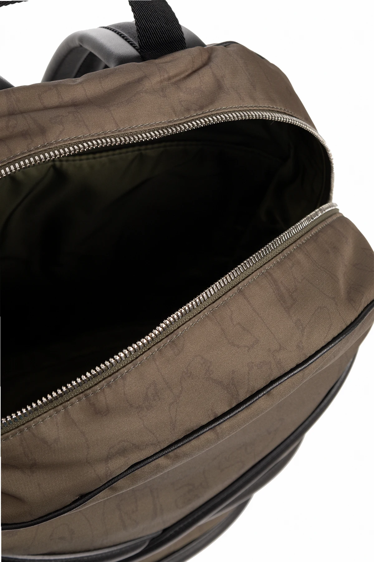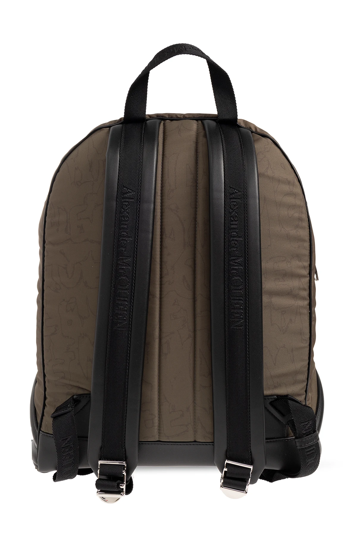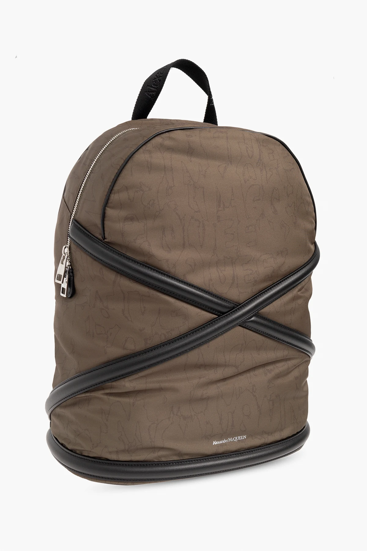 Ciemnozielony plecak, model ‘Harness’ Alexander McQueen. Wykonany z technicznej tkaniny i imitacji skóry. Zamykany na dwubiegunowy zamek. Ozdobiony wzorem z logo oraz naszytymi, krzyżującymi się paskami. Z przodu nadruk z logo. Na górze półokrągły uchwyt, z tyłu regulowane szelki. Wewnątrz komora z dwiema wsuwanymi kieszeniami. Metalowe wykończenie w kolorze srebrnym.