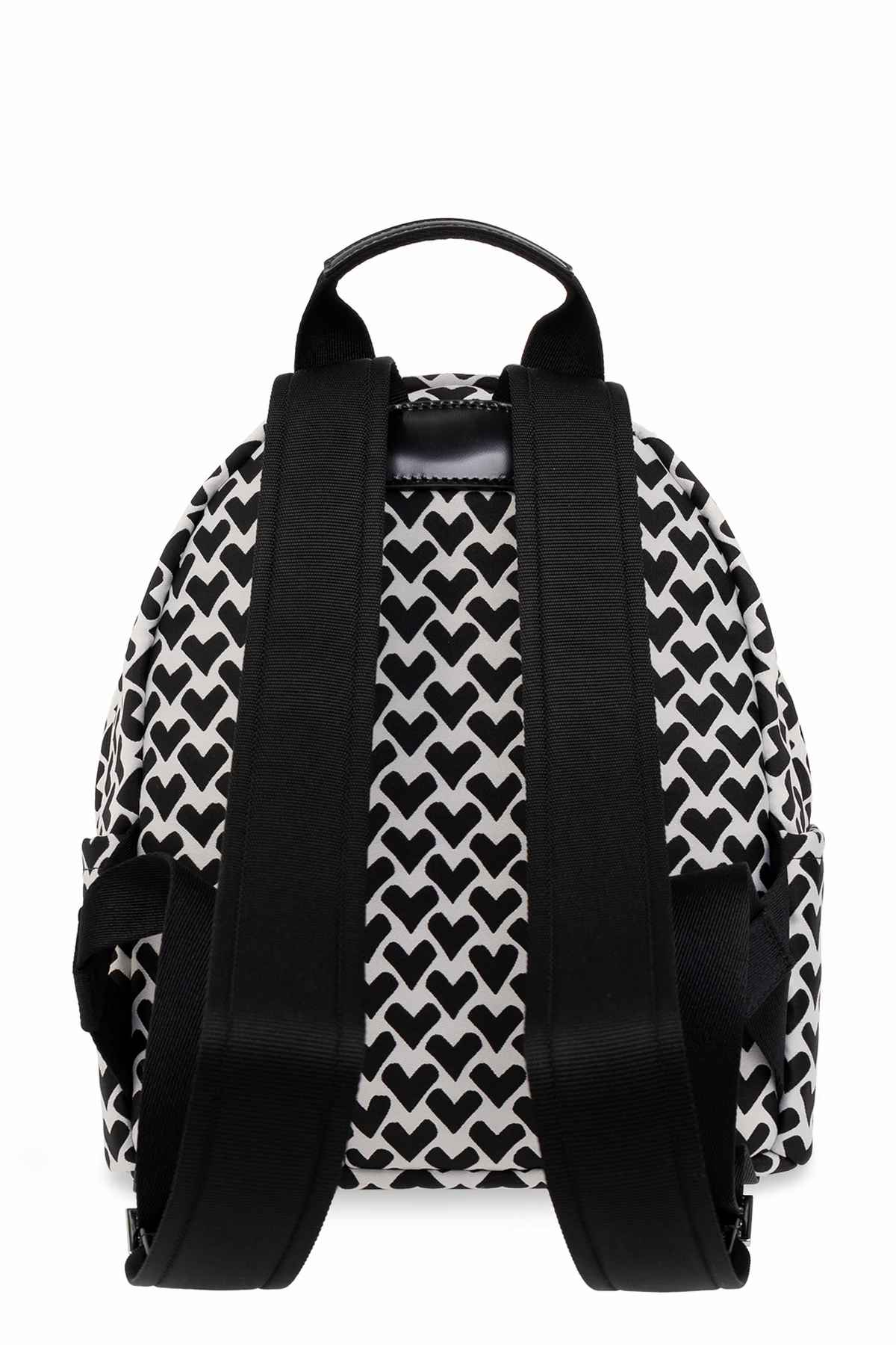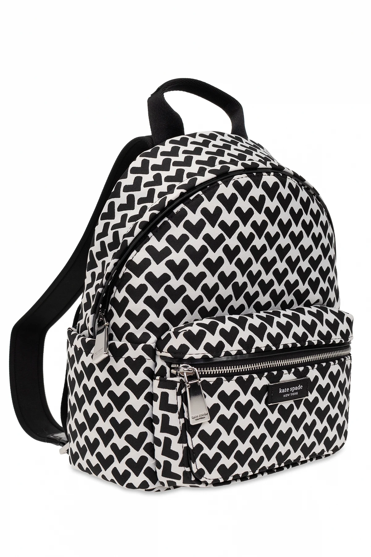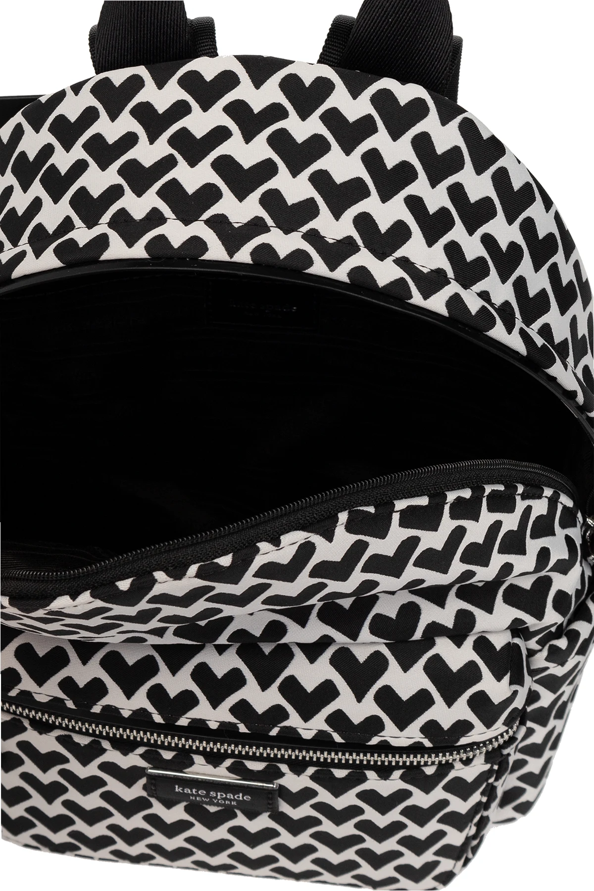 Czarno-biały plecak, model ‘Sam Icon’ Kate Spade. Wykonany z materiału pozyskanego z recyklingu. Główna komora i przednia kieszeń zamykane na zamek. Ozdobiony żakardowym wzorem z motywem serc. Z przodu naszywka z logo. Po bokach dwie wsuwane kieszenie. Na górze uchwyt, z tyłu regulowane szelki. Wewnątrz wsuwana kieszeń. Metalowe wykończenie w kolorze srebrnym.