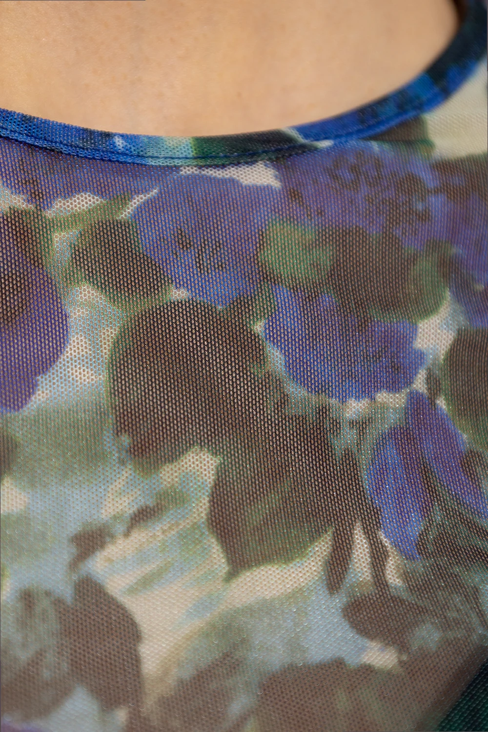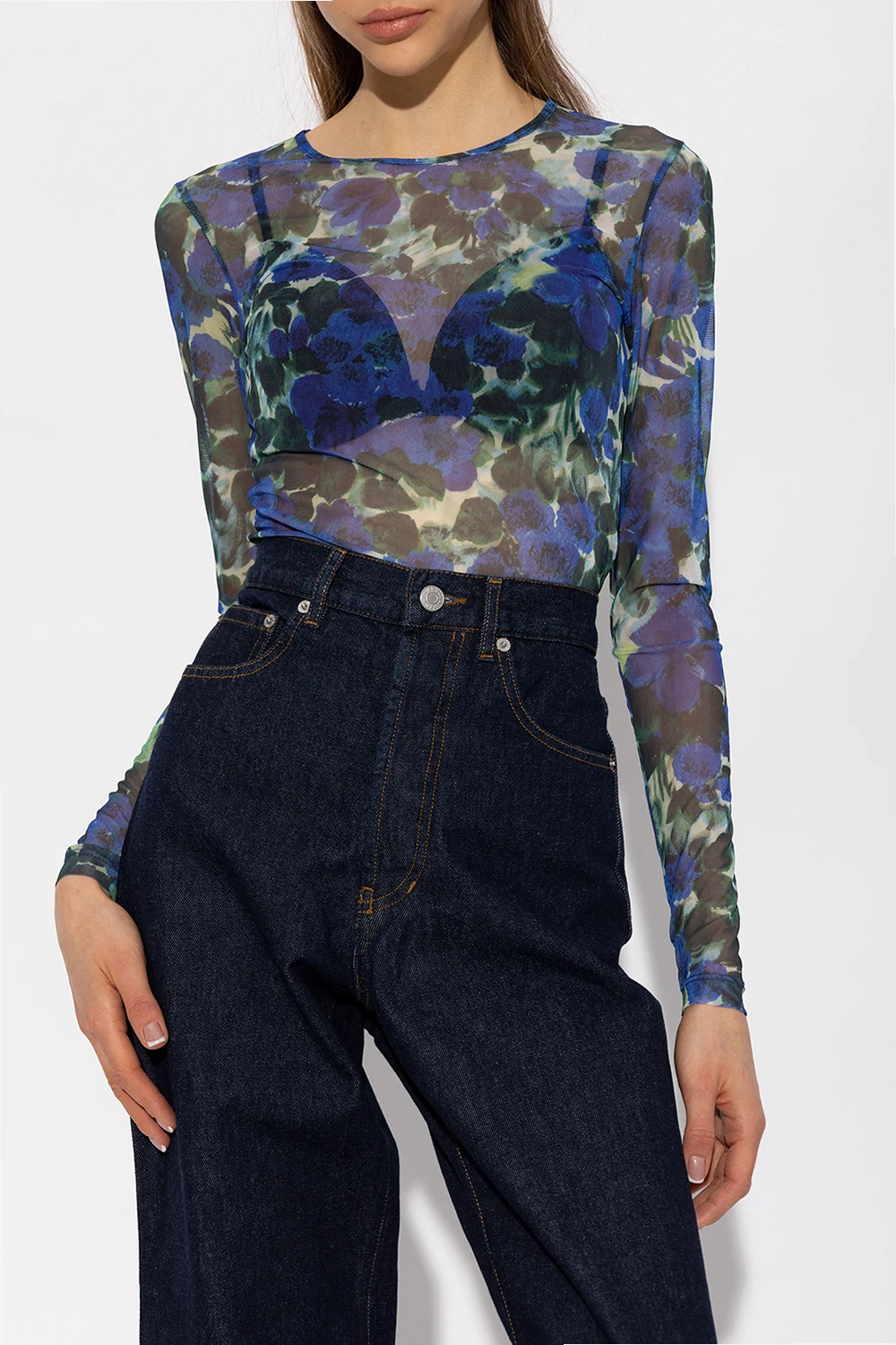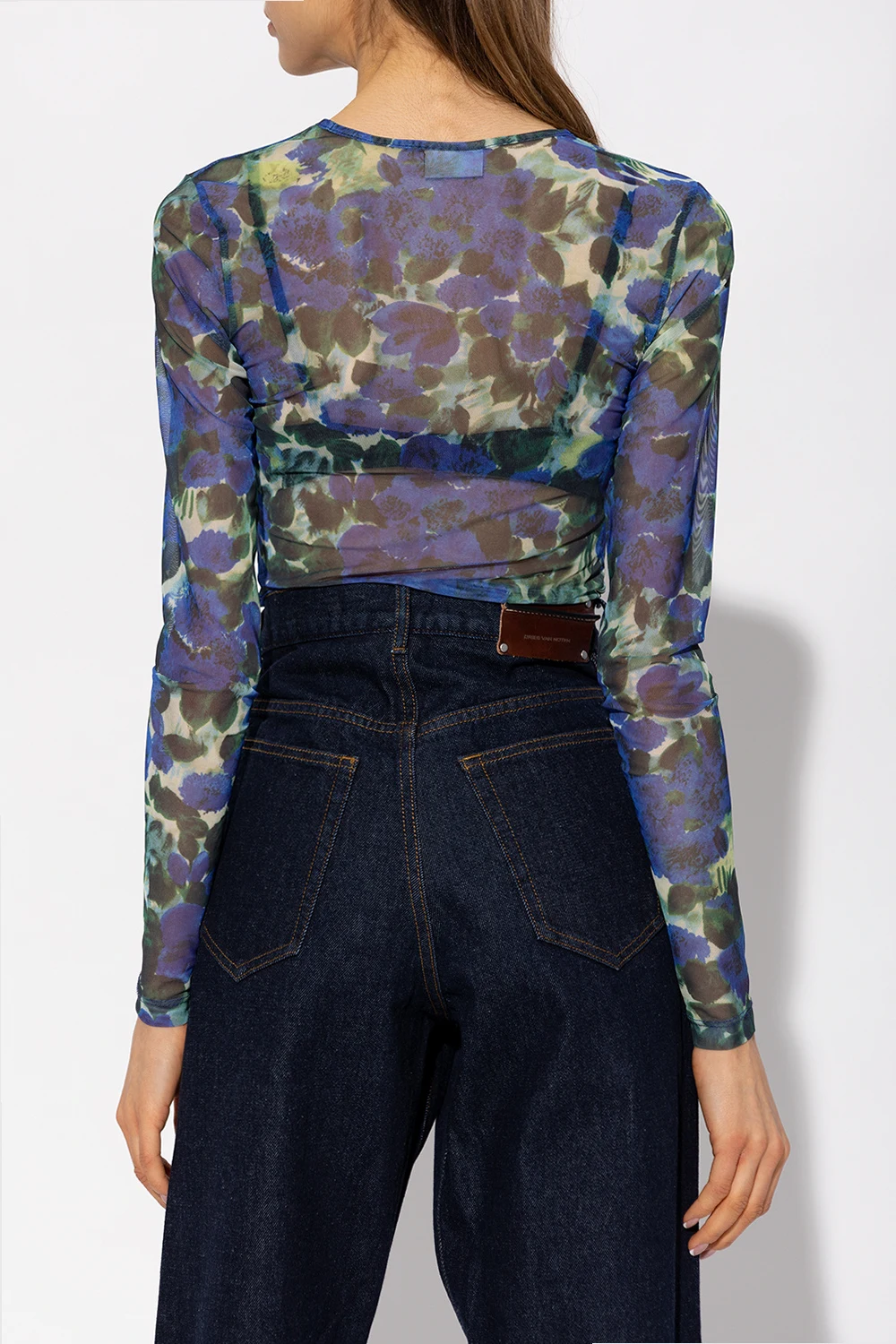 Niebiesko-zielono-beżowy, transparentny top Dries Van Noten. Ozdobiony motywem kwiatowym. Okrągły dekolt. Długie rękawy.