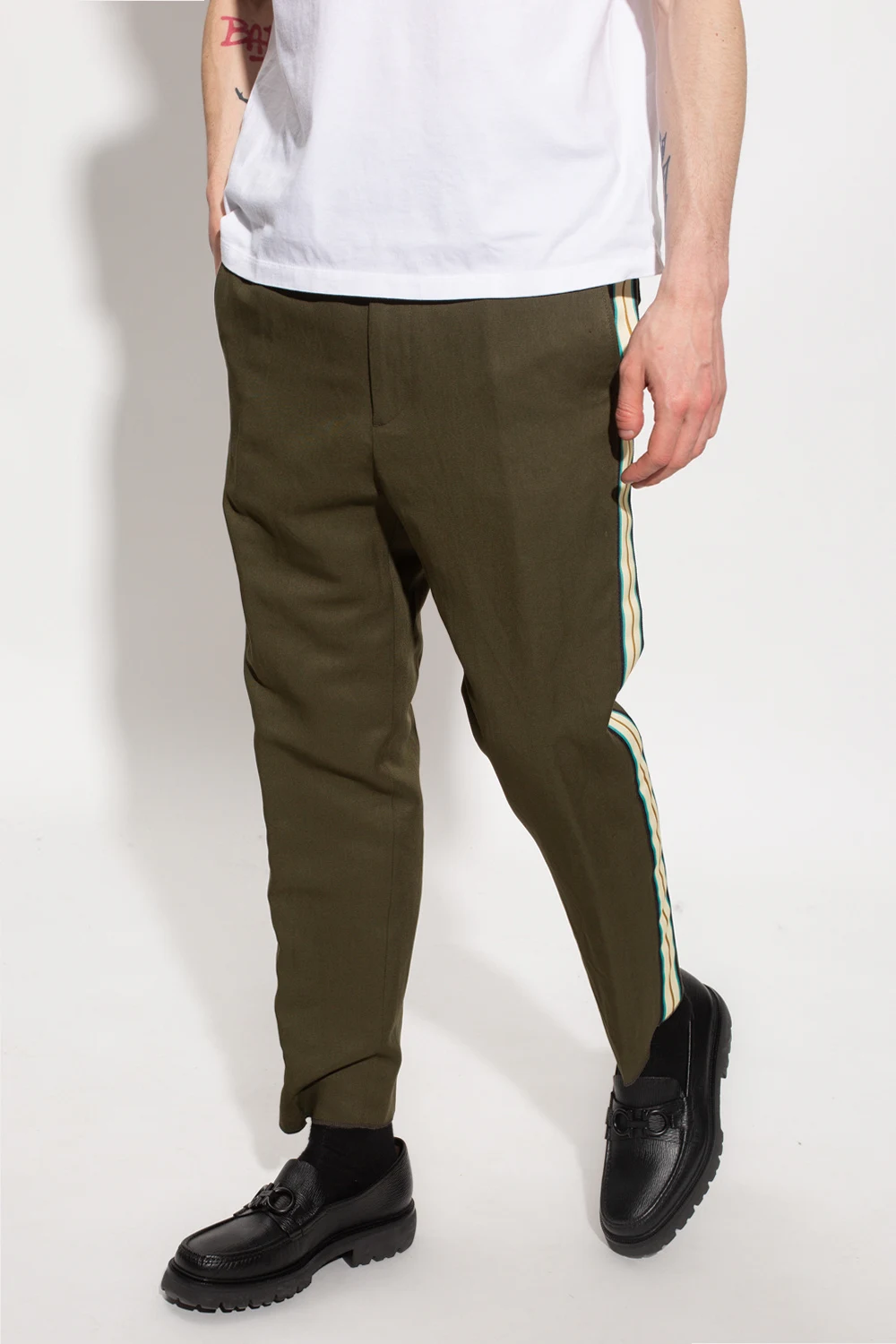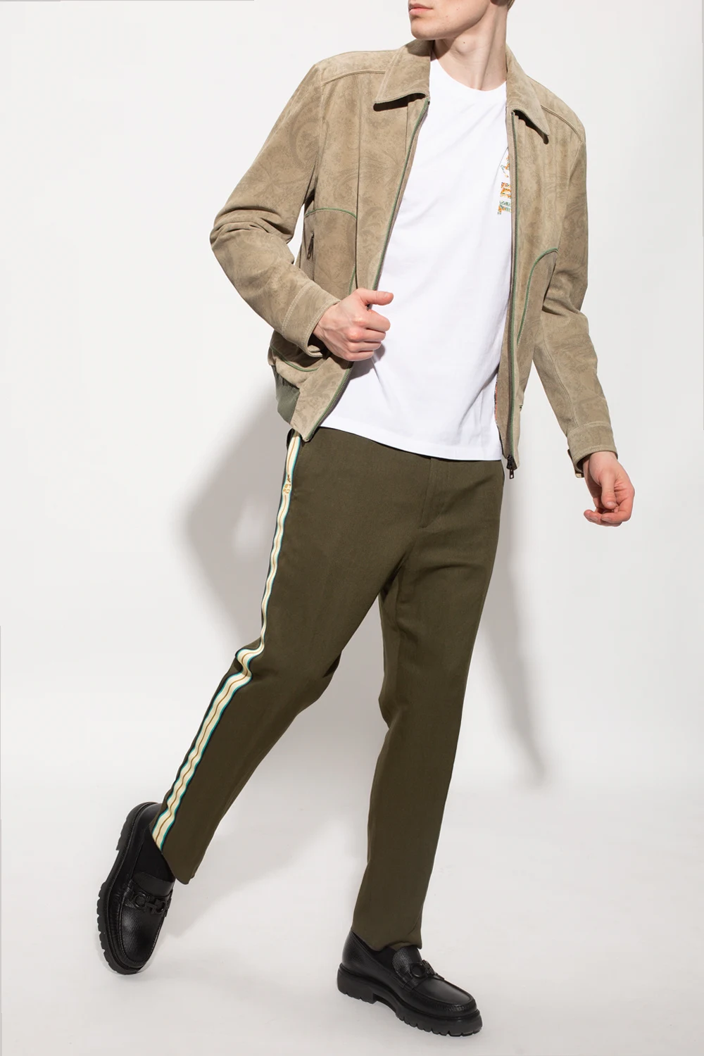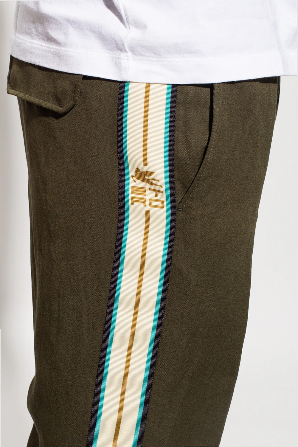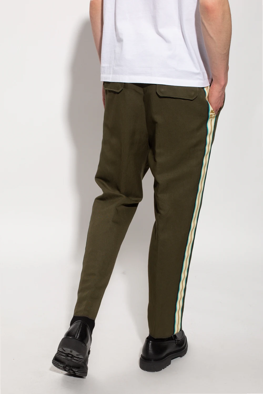 Spodnie w kolorze khaki Etro. W pasie wszyta guma ściągana trokami w kolorze białym. Zapinane na zamek. Cztery kieszenie: dwie wsuwane z przodu oraz dwie z patkami na zatrzaski z tyłu. Długie nogawki ozdobione żółto-zielono-granatowymi lampasami z wyszytym emblematem ‘Etro Cube’ w kolorze brązowym.