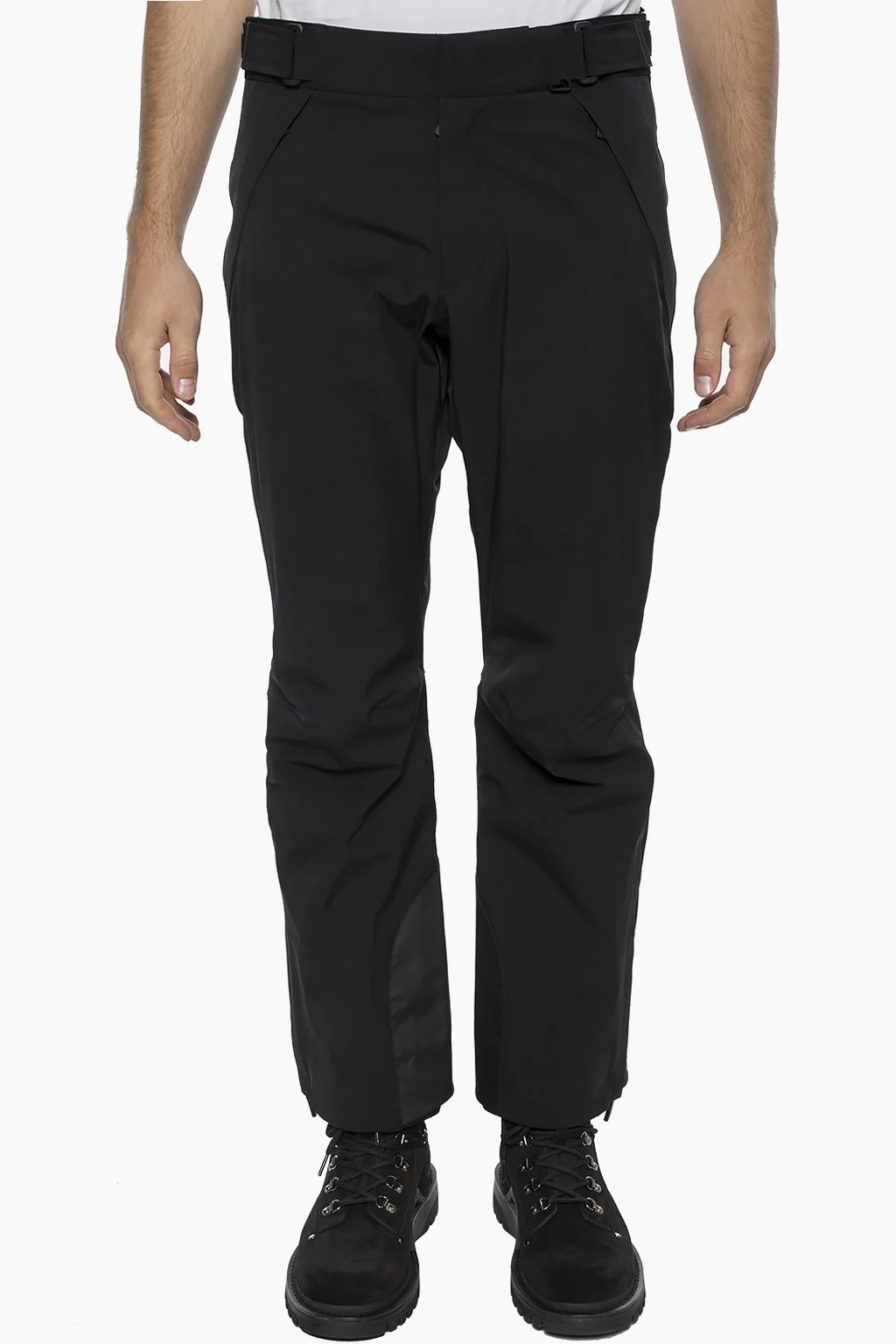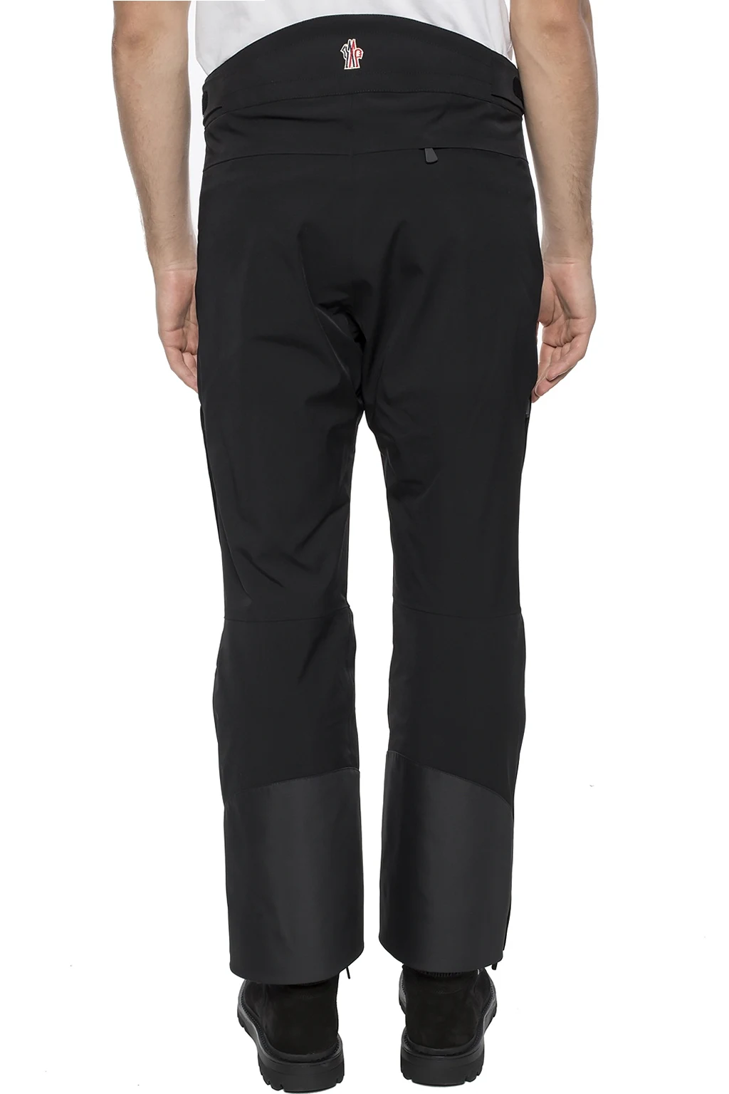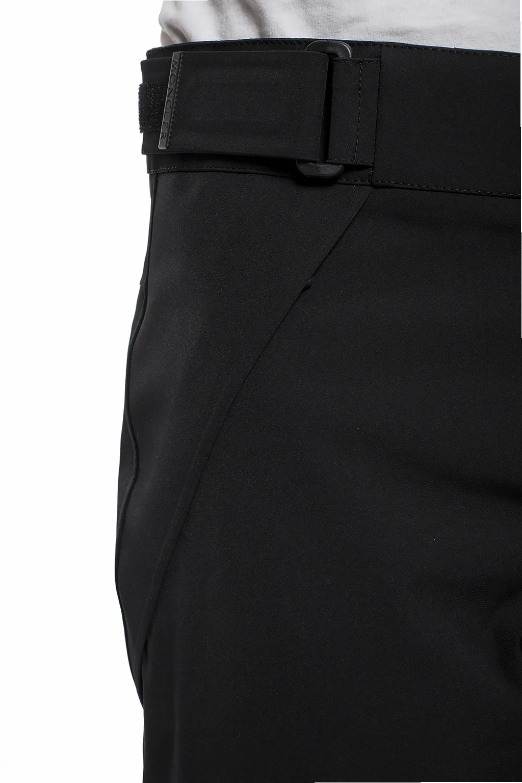 Czarne spodnie narciarskie Moncler Grenoble. Zapinane na zamek i zatrzask. Z przodu dwie kieszenie zamykane na zamek, z tyłu jedna. Nogawki z wszytymi zamkami. Wbudowany reflektor systemu Recco.