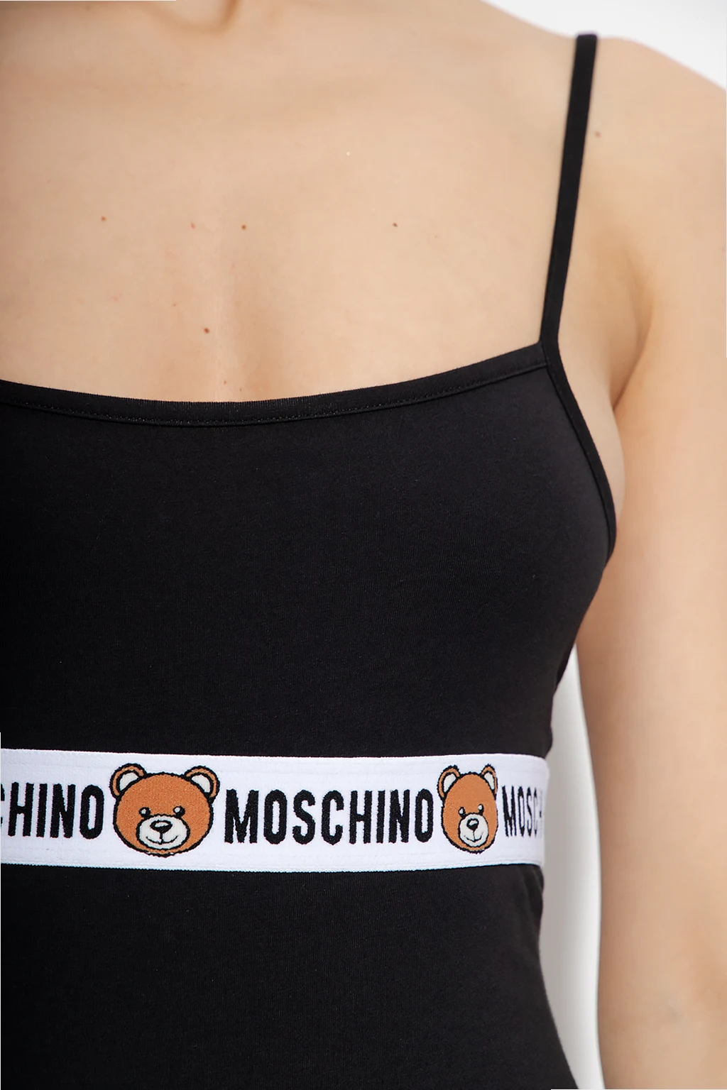 Czarne body Moschino, kolekcja ‘Underwear’. Wykonane z bawełny. Zapinane na dole na zatrzaski. Pod biustem wszyta biała guma ozdobiona wyszytym logo i charakterystycznym dla marki motywem głowy misia. Regulowane ramiączka.
