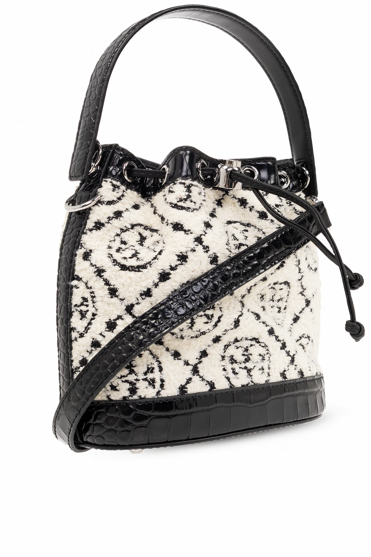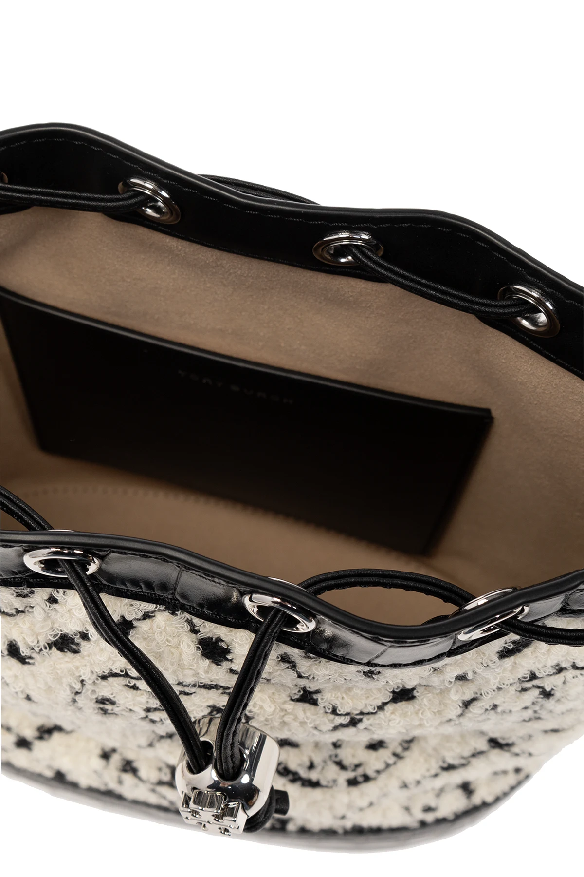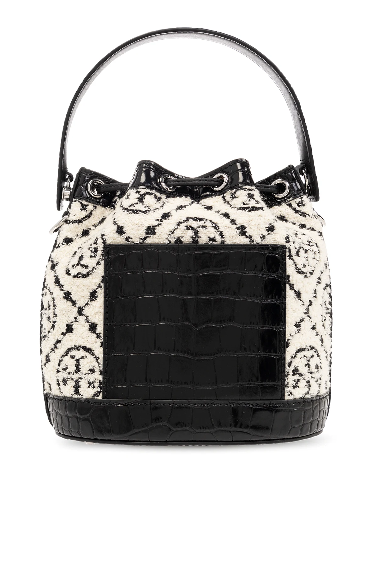 Biało-czarna torba na ramię typu ‘bucket’, model ‘T Monogram’ Tory Burch. Wykonana z materiału typu ‘frotte’ i skóry. Ściągana trokami. Ozdobiona wzorem z monogramem. Z tyłu wsuwana kieszeń. Półokrągła rączka oraz odpinany pas na ramię z możliwością regulacji długości. Wewnątrz komora ze wsuwaną kieszenią. Metalowe wykończenie w kolorze srebrnym.