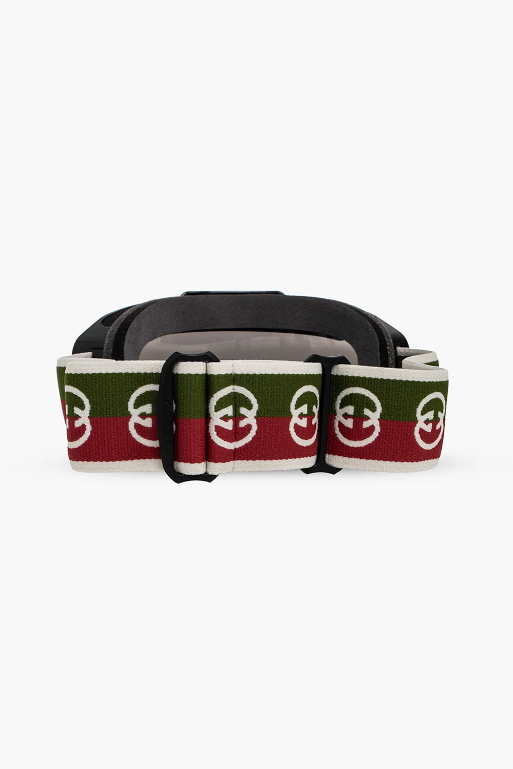 Czarne gogle narciarskie Gucci. Oprawka z wypukłym logo. Zielono-czerwono-biały, elastyczny pasek mocujący z regulacją długości i silikonowymi elementami zapobiegającymi zsuwaniu, ozdobiony wyszytym wzorem z logo. Pianka od wewnętrznej strony dopasowuje się do konturów twarzy. Otwory zapobiegające parowaniu. Szare soczewki z efektem lustrzanym w kolorze srebrnym. Ochrona przed promieniowaniem UVA/UVB. Dołączone etui w losowo wybranym kolorze.