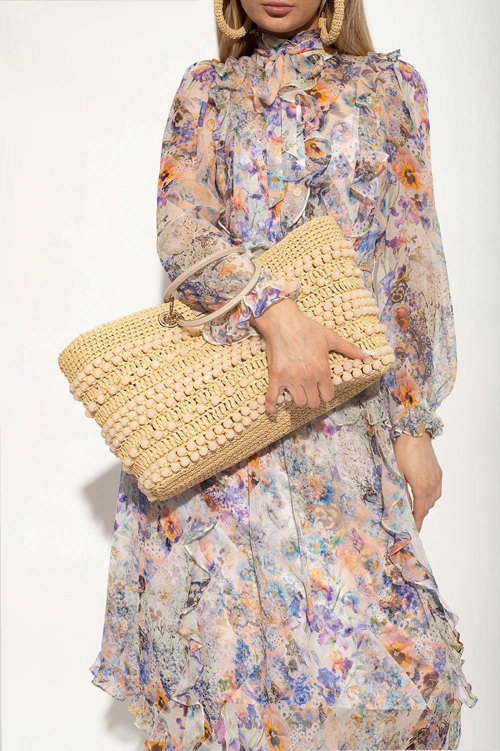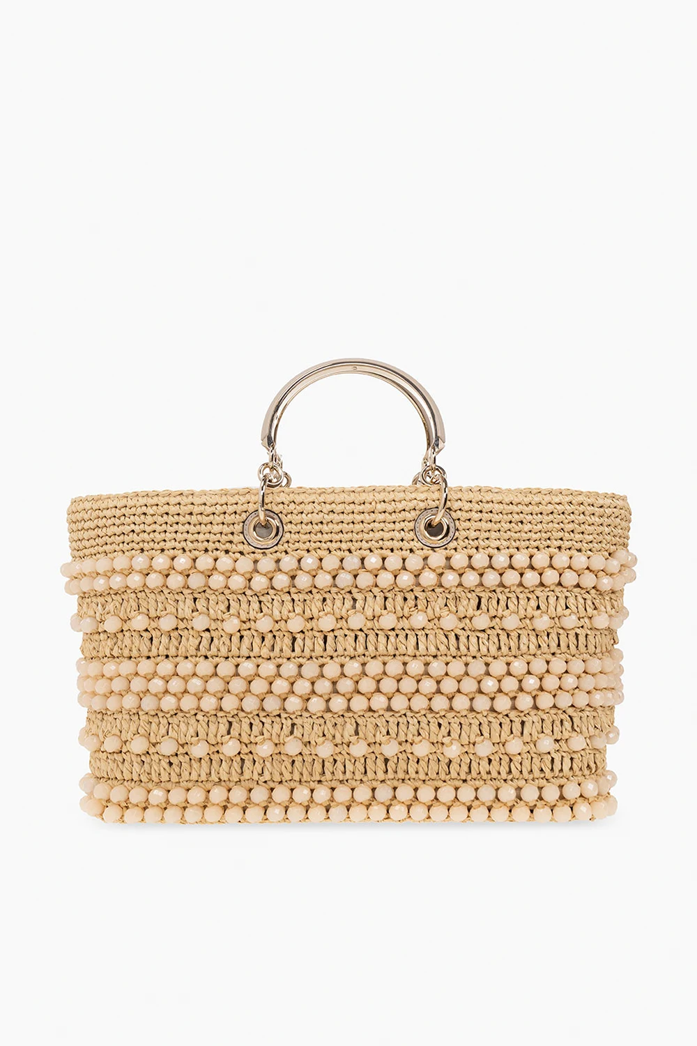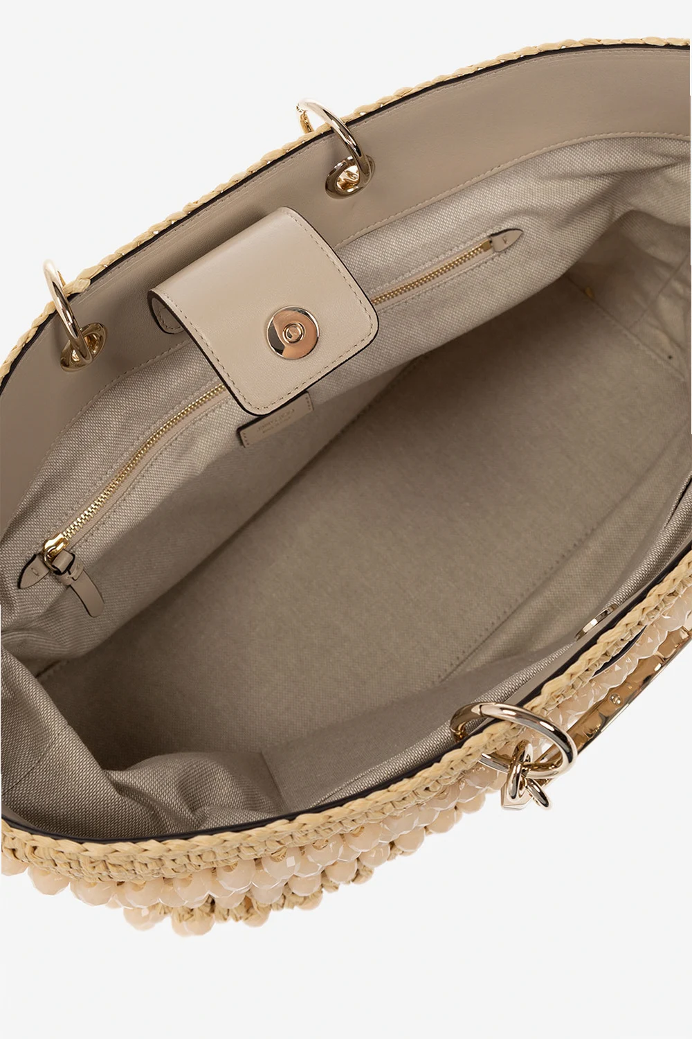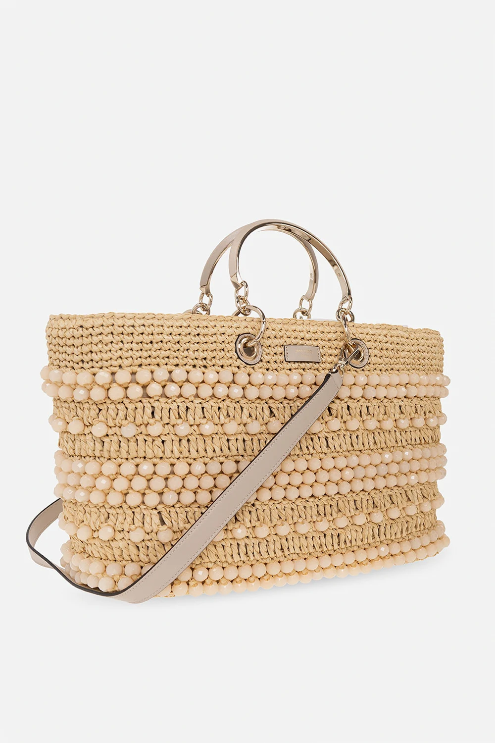 Beżowa torba typu ‘shopper’, model ‘Bon Bon Large’ Jimmy Choo. Wykonana z plecionej rafii i wykończona skórą jagnięcą. Zamykana na zatrzask. Ozdobiona połyskującymi koralami. Z przodu naszywka z logo. Dwie półokrągłe, mosiężne rączki oraz odpinany pas na ramię. Wewnątrz komora z trzema kieszeniami: dwiema wsuwanymi i zamykaną na zamek. Metalowe wykończenie w kolorze złotym.