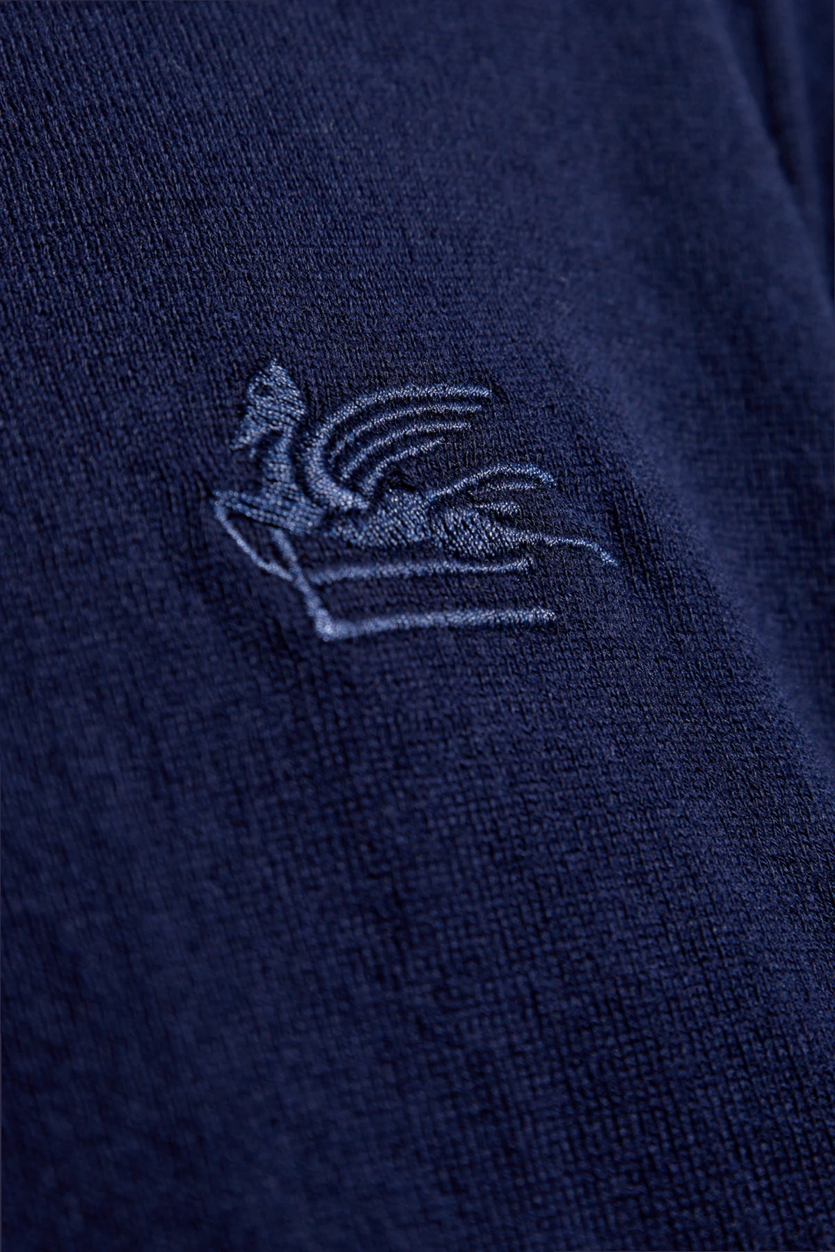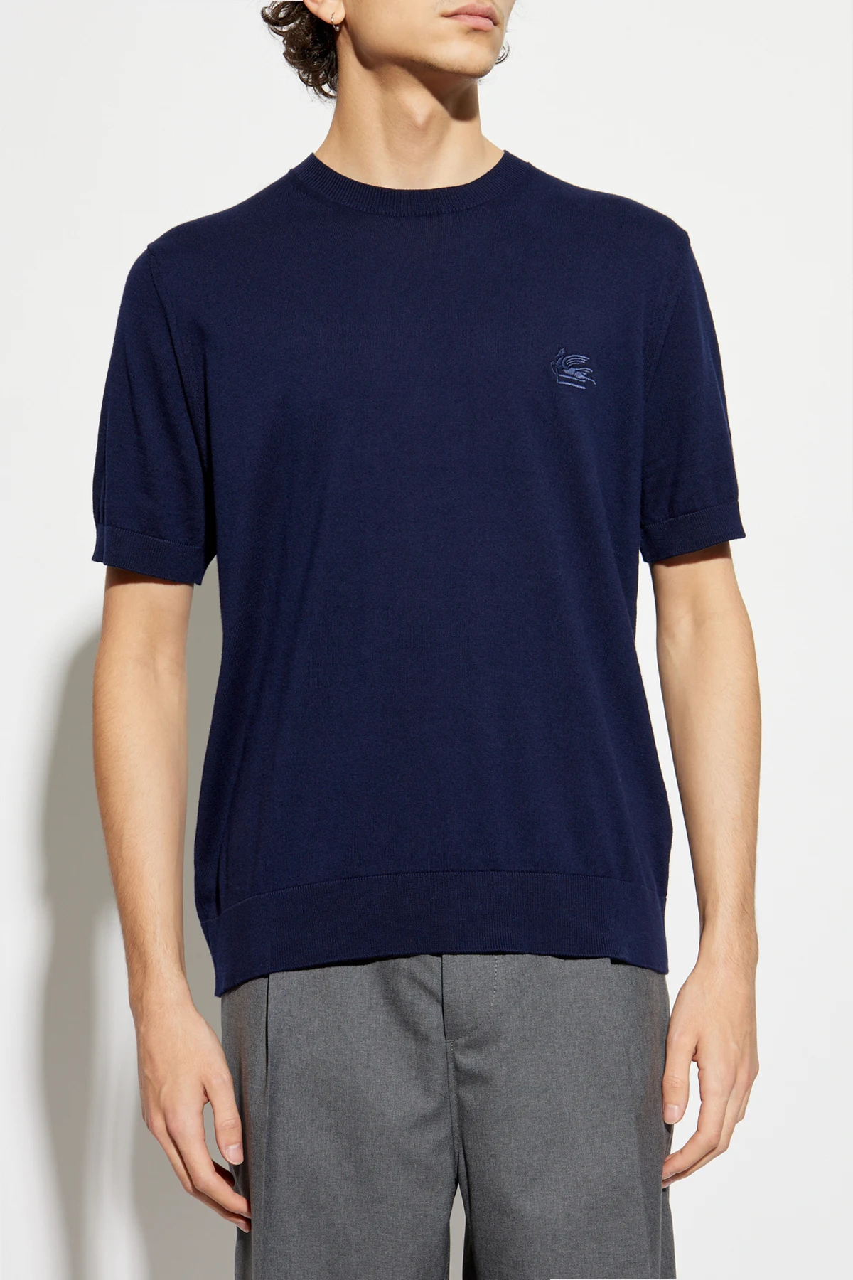 Odkryj bawełniany sweter z krótkimi rękawami od renomowanej włoskiej marki Etro , w kolorze głębokiego granatu. Wykonany z najwyższej jakości bawełny, ten elegancki sweter zachwyca prostotą formy i subtelnością wzoru. Okrągły dekolt oraz dyskretne logo w postaci stylizowanego pegaza, umieszczonego po lewej stronie na piersi, dodają mu wyjątkowego charakteru.