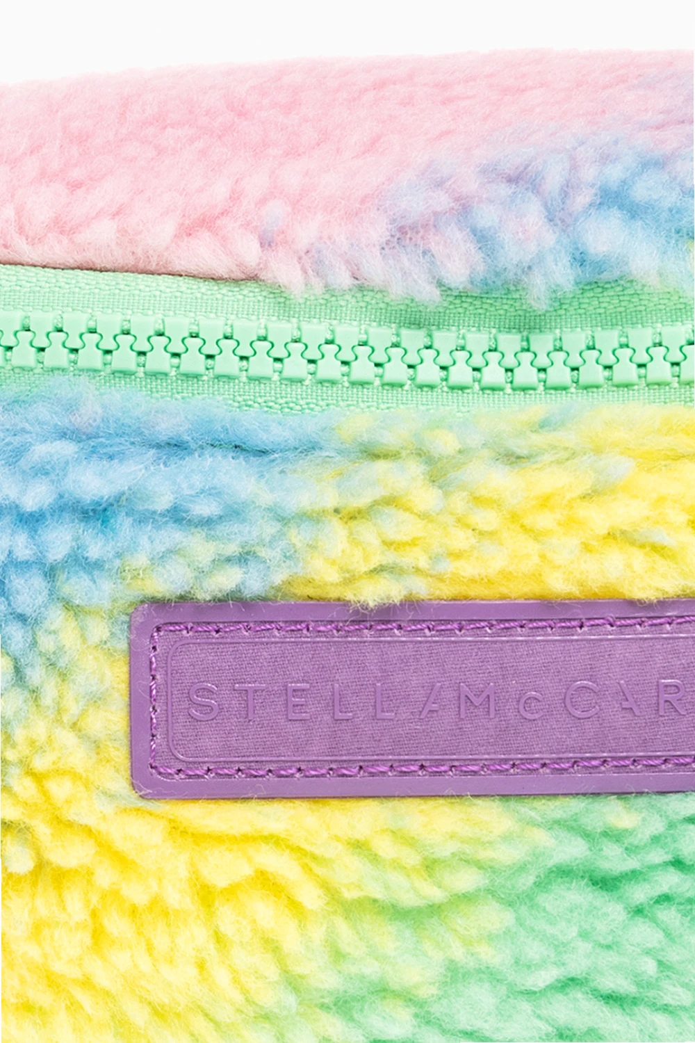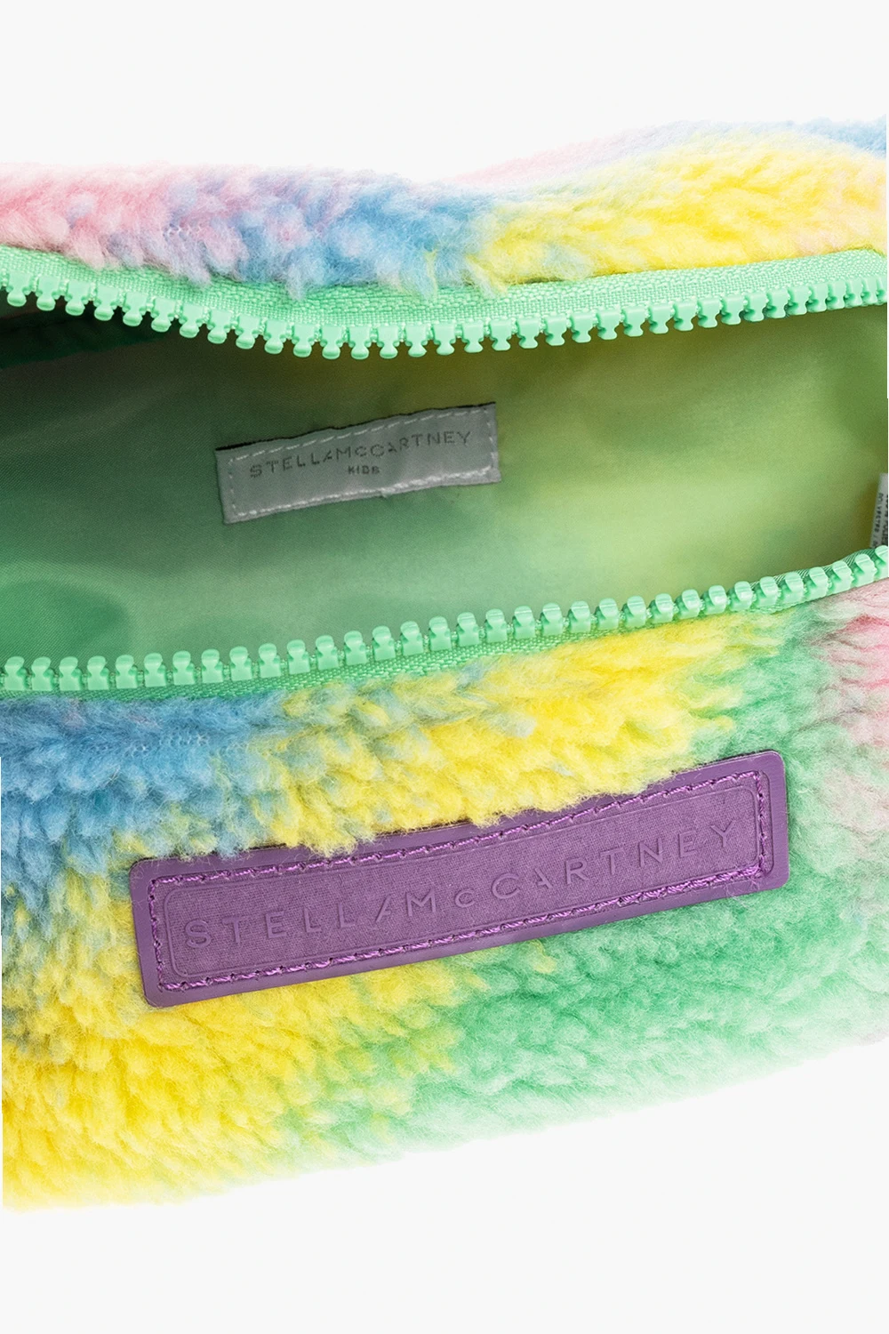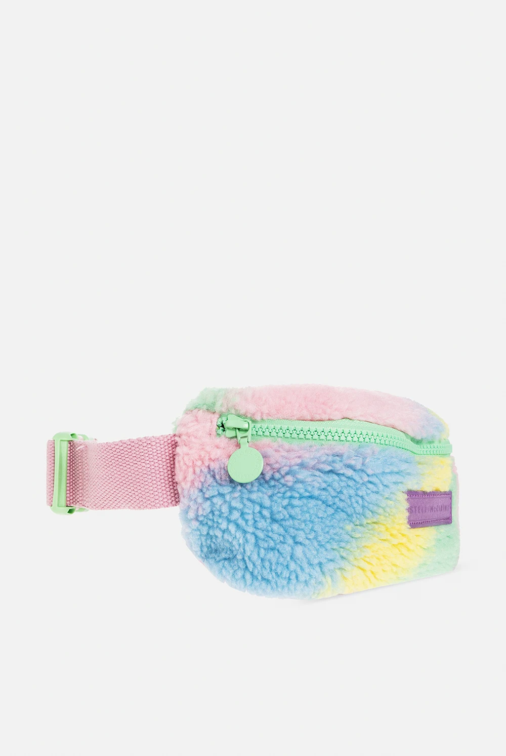 Kolorowa torba na pas Stella McCartney Kids. Wykonana z polaru z recyklingu. Zapinana na zamek. Z przodu naszywka z logo. Pas na pas z możliwością regulacji długości. Wewnątrz komora. Metalowe elementy w kolorze zielonym.