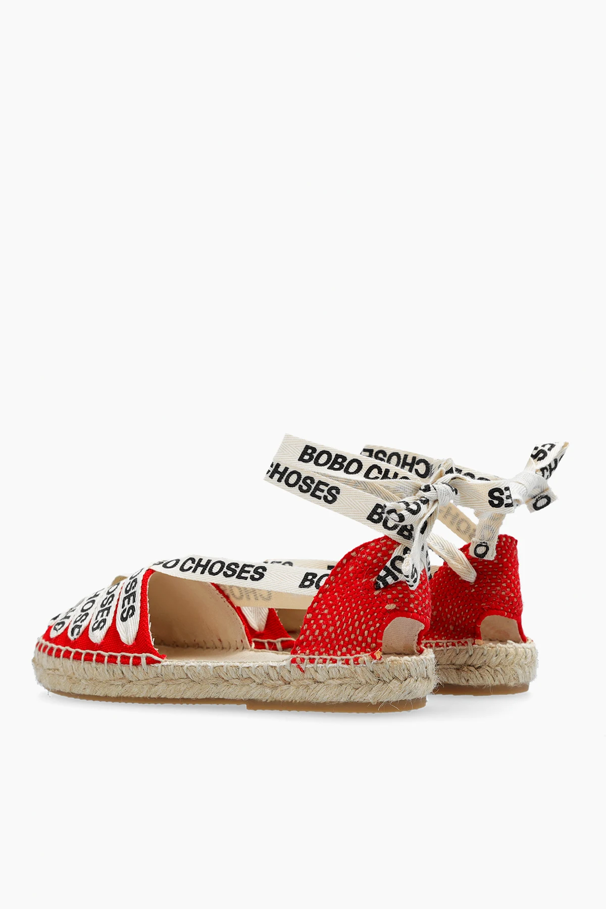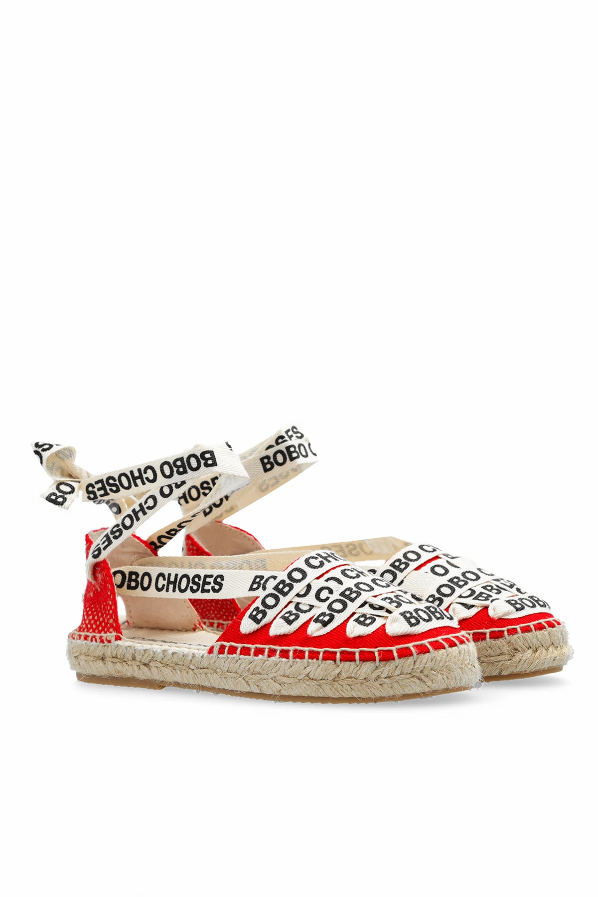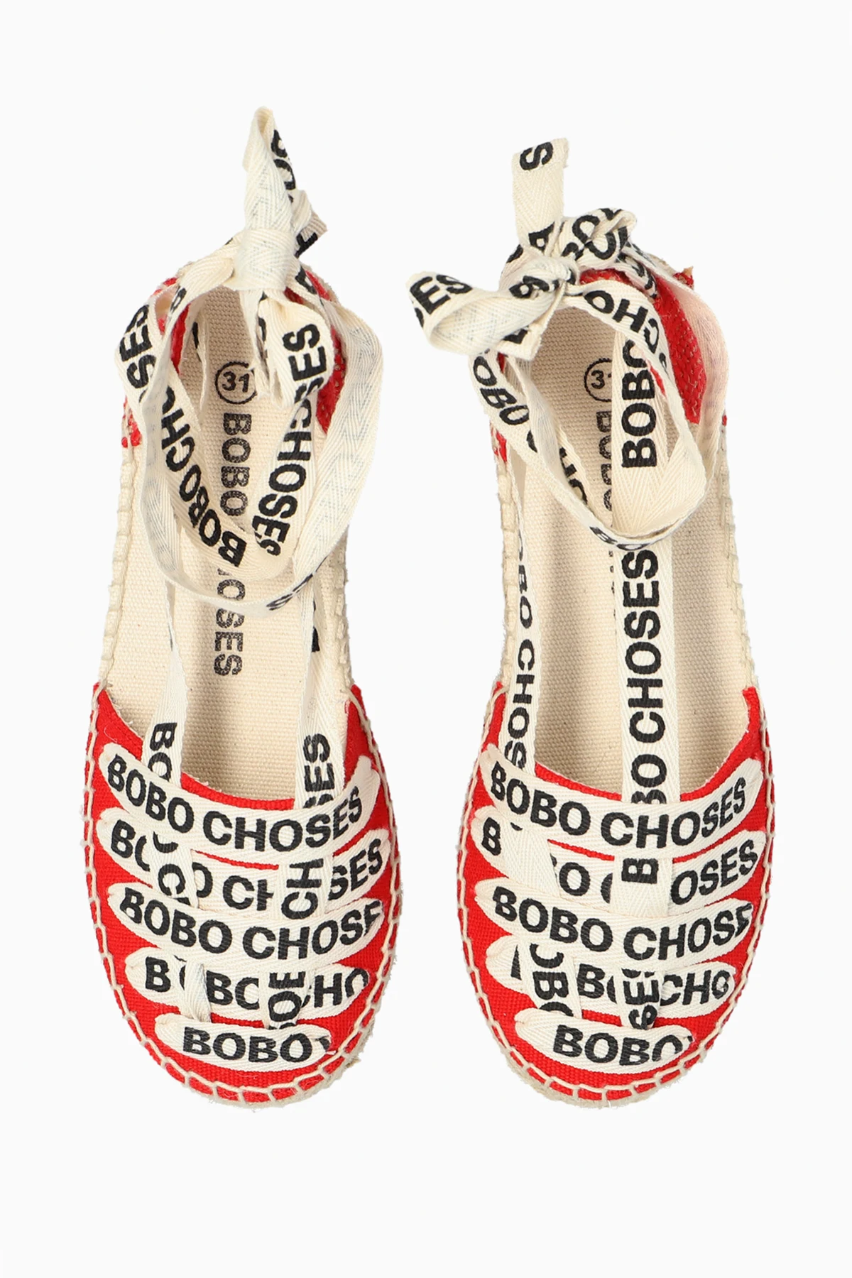 Czerwono-kremowe espadryle Bobo Choses. Wykonane z materiału. Wiązane wokół kostki. Ozdobione nadrukowanym monogramem w kolorze czarnym. Beżowa, gumowa podeszwa wykończona jutą.