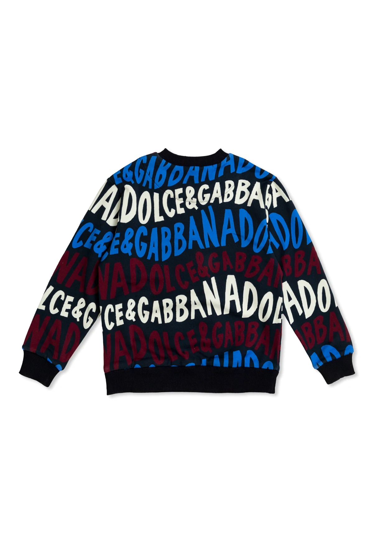 Granatowa powierzchnia bluzy zdobiona jest dynamicznym, nieregularnym wzorem z powtarzającym się napisem "DOLCE & GABBANA" w odcieniach bieli, czerwieni i niebieskiego. Klasyczny krój, długie rękawy oraz czarne ściągacze przy mankietach, dolnym brzegu i dekolcie nadają jej wyjątkowego, eleganckiego wyglądu.