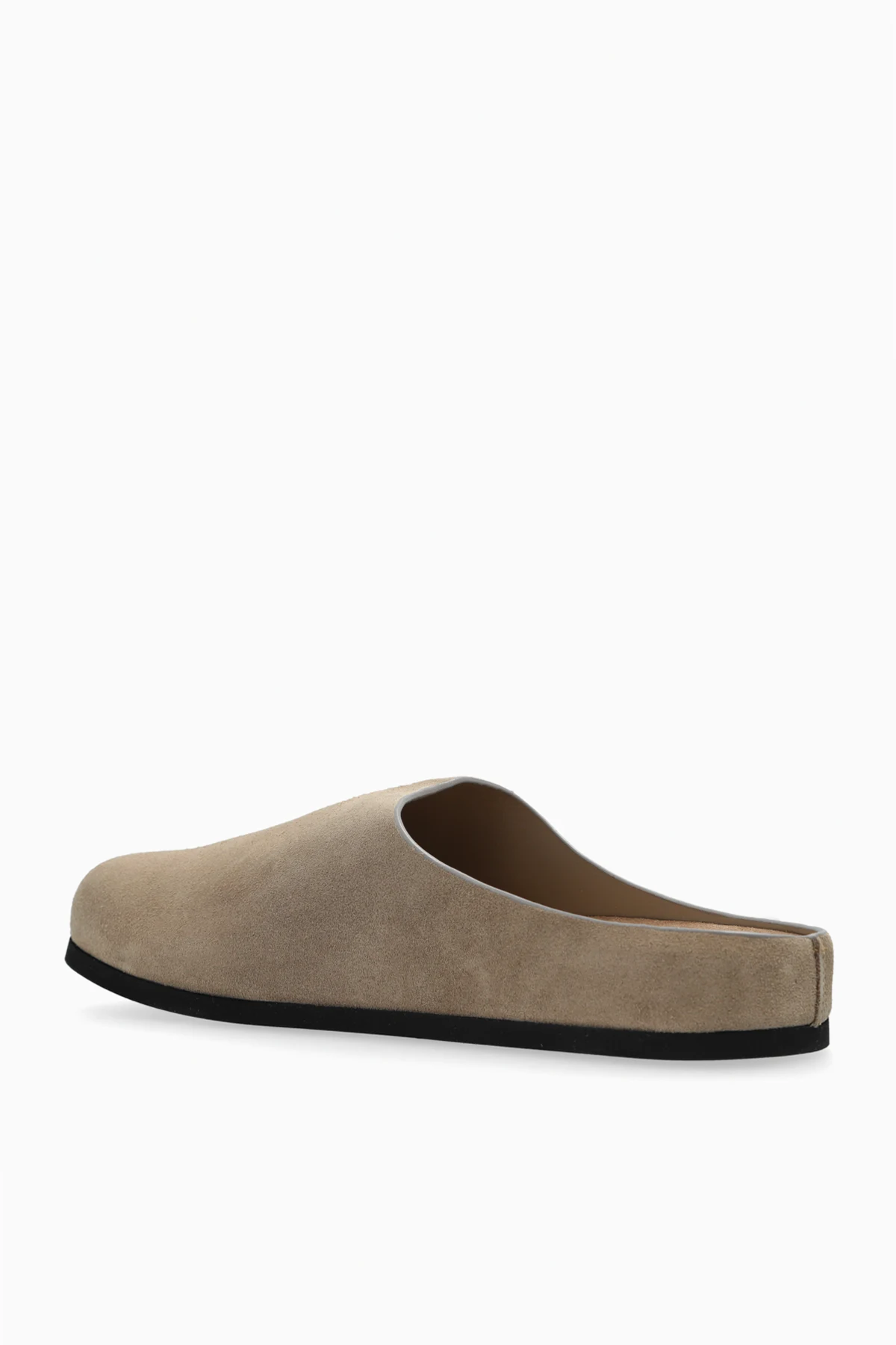 Klapki charakteryzują się prostą, minimalistyczną konstrukcją z zakrytymi palcami i otwartą piętą. Wykonane z delikatnej skóry zamszowej w eleganckim beżowym kolorze, zapewniają nie tylko stylowy wygląd, ale również komfort noszenia dzięki wyściełanemu wnętrzu.