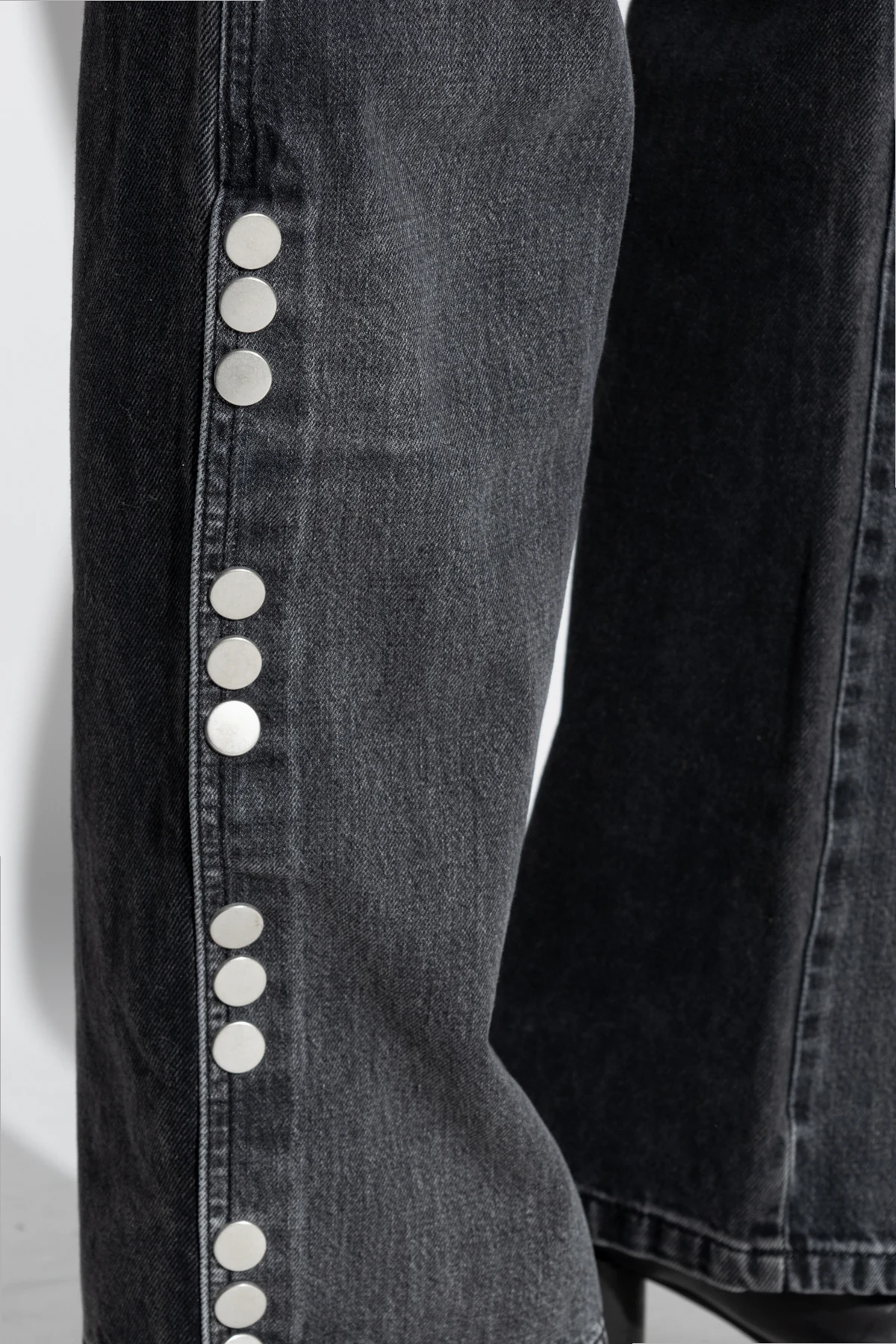 W dominującym szarym kolorze, z regularnym krojem i prostymi nogawkami, stanowią idealne uzupełnienie każdej garderoby. Na bokach nogawek znajdują się rzędy ozdobnych guzików, nadających im unikalny charakter i podkreślających ich wyjątkowość.