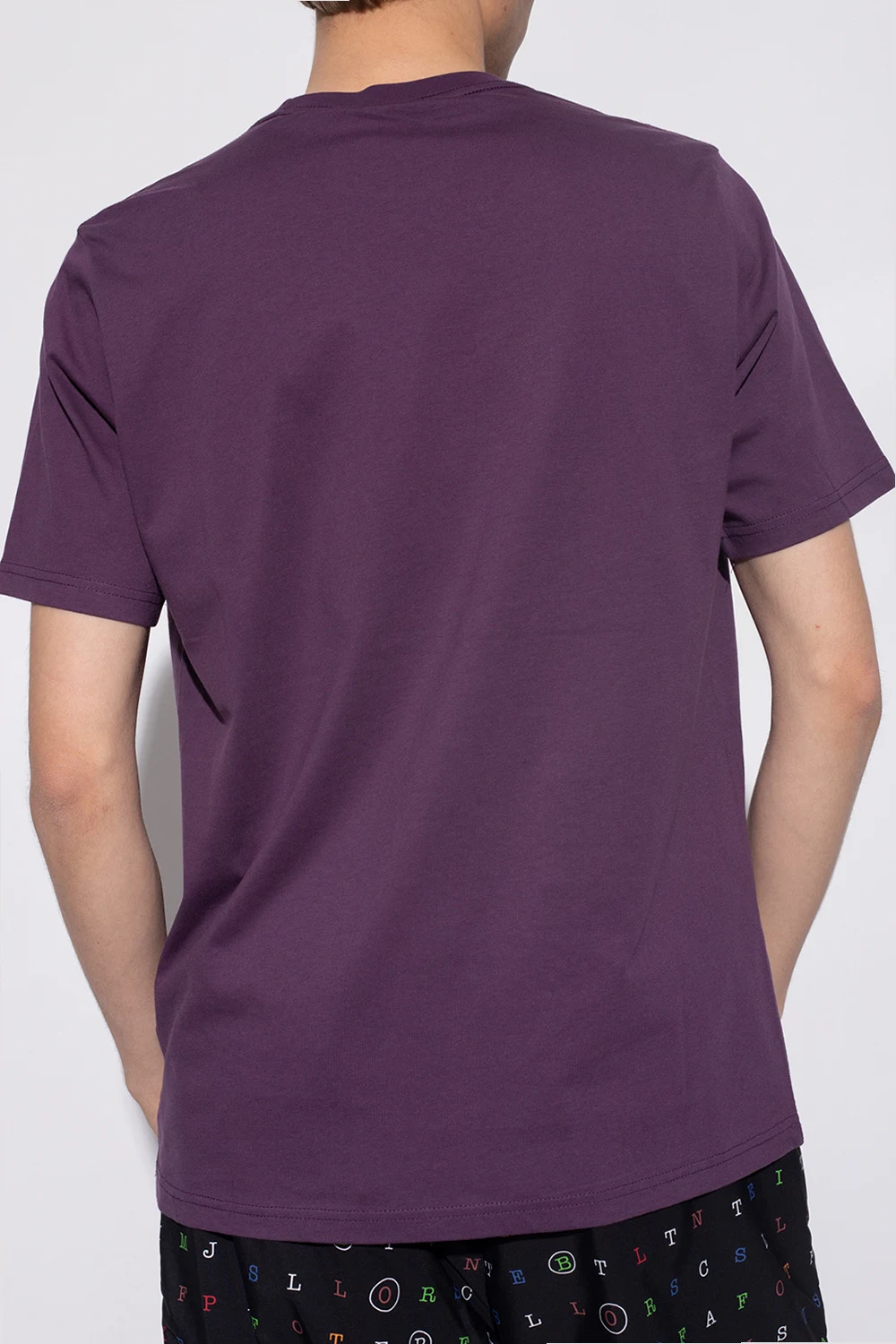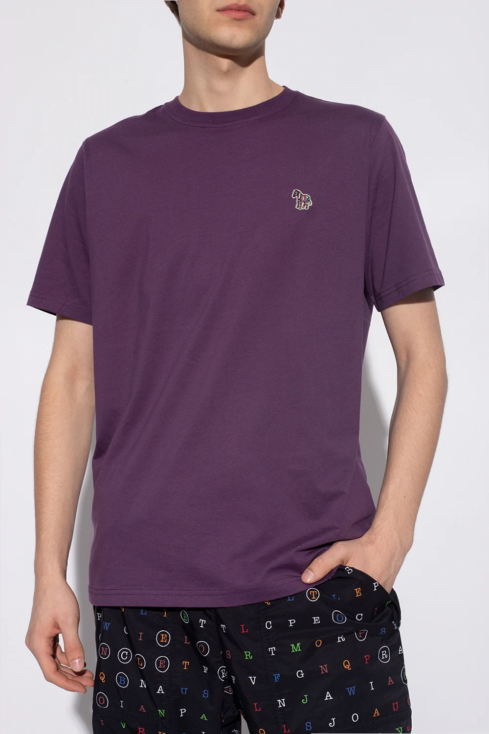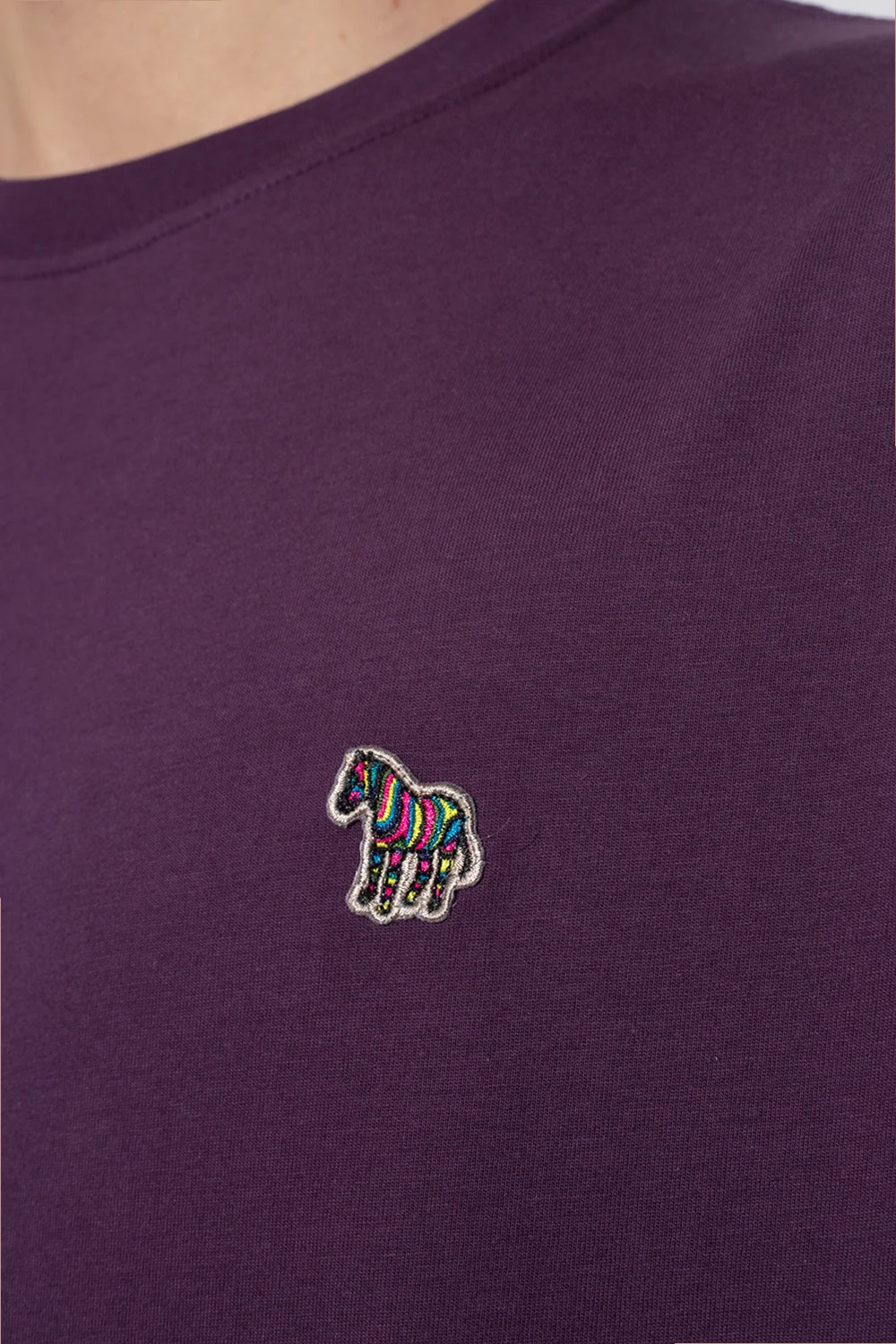 Fioletowy, bawełniany t-shirt PS Paul Smith. Z przodu ozdobiony kolorową naszywką z motywem zebry. Okrągły dekolt. Krótkie rękawy.