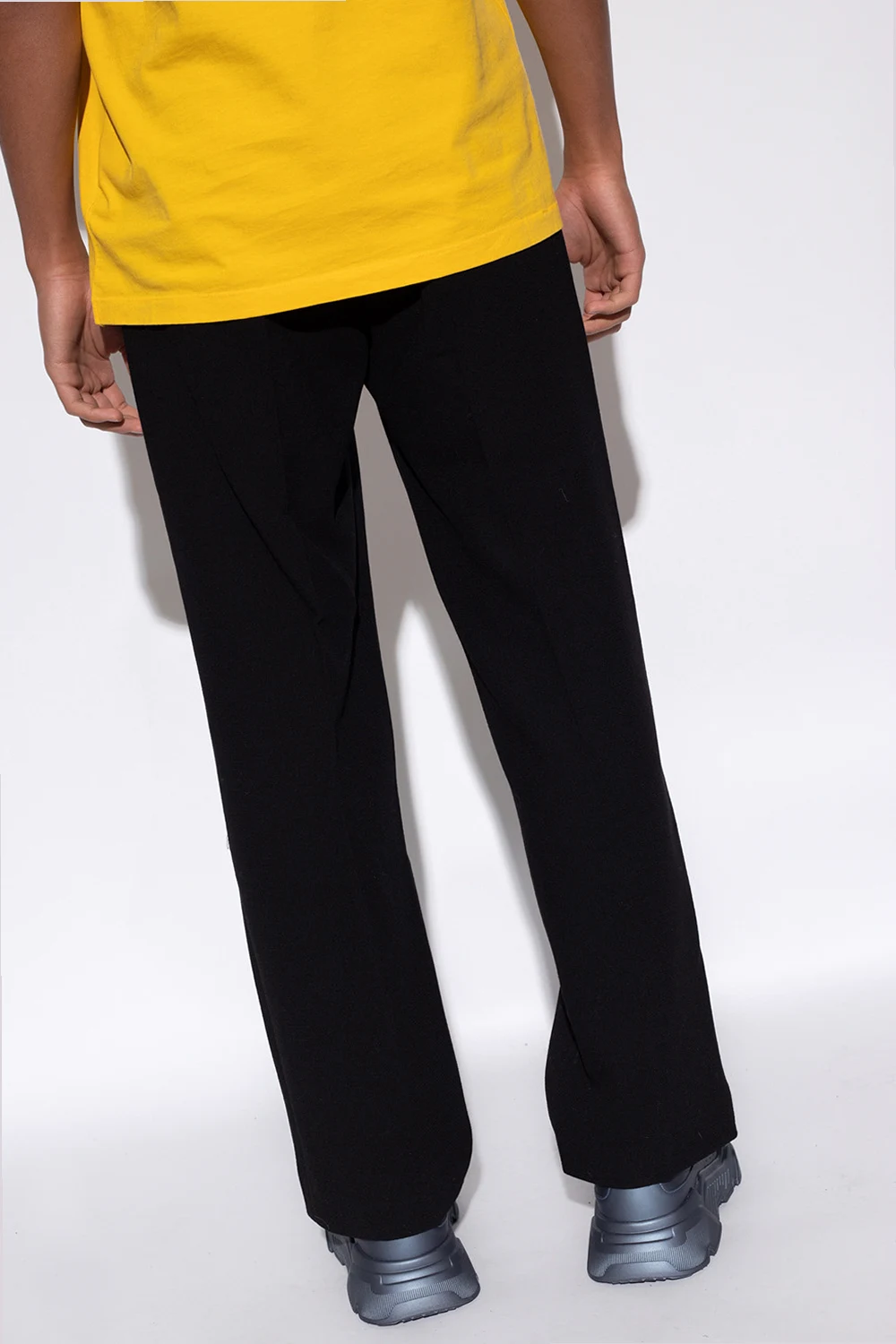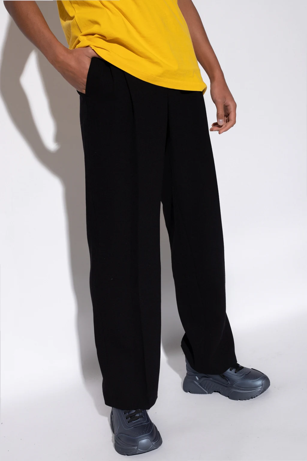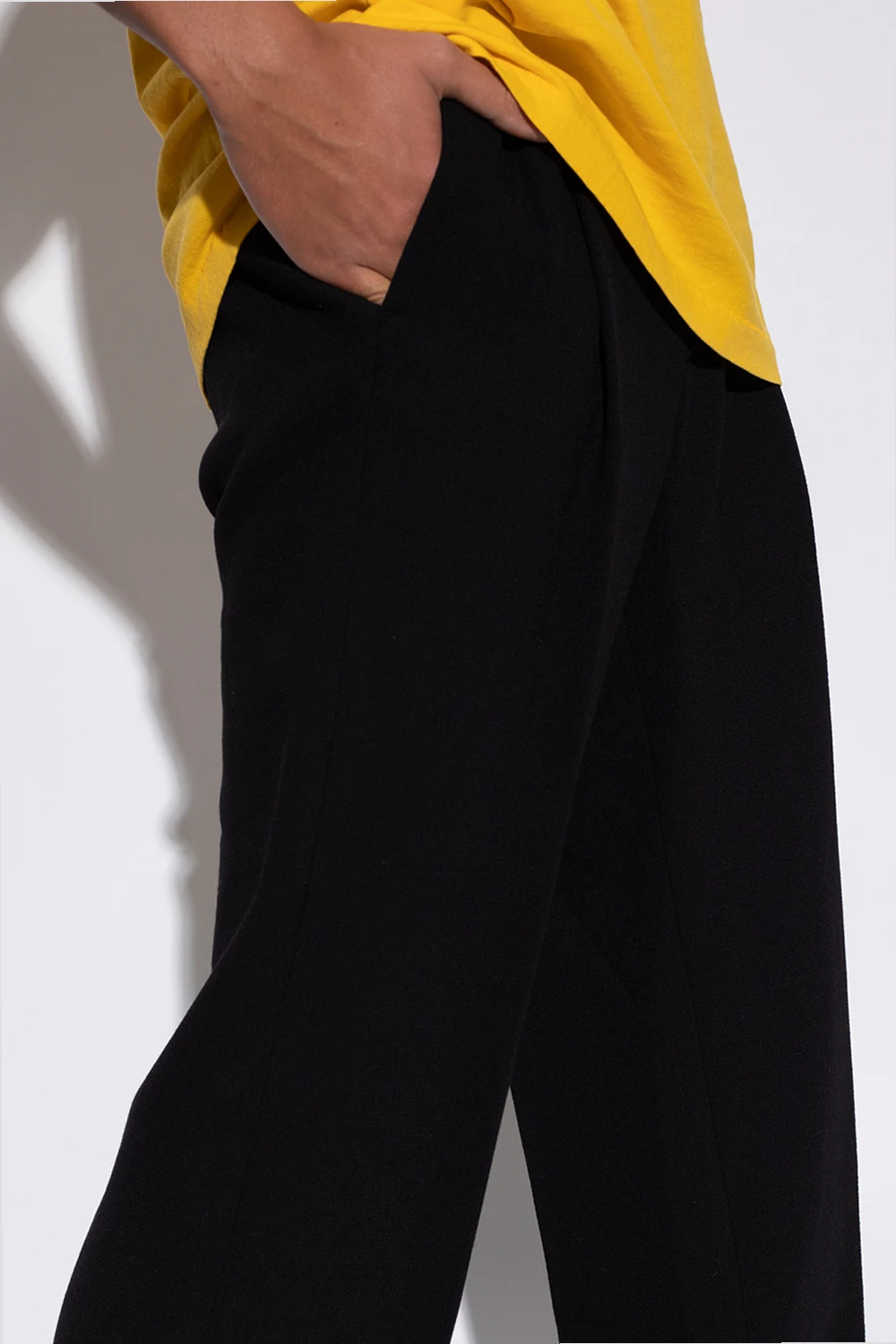 Czarne spodnie Casablanca. Wykonane z wełny merynosów. Zapinane na zamek oraz haftkę. Trzy wsuwane kieszenie: dwie z przodu oraz pojedyncza kieszeń z tyłu. Proste nogawki.