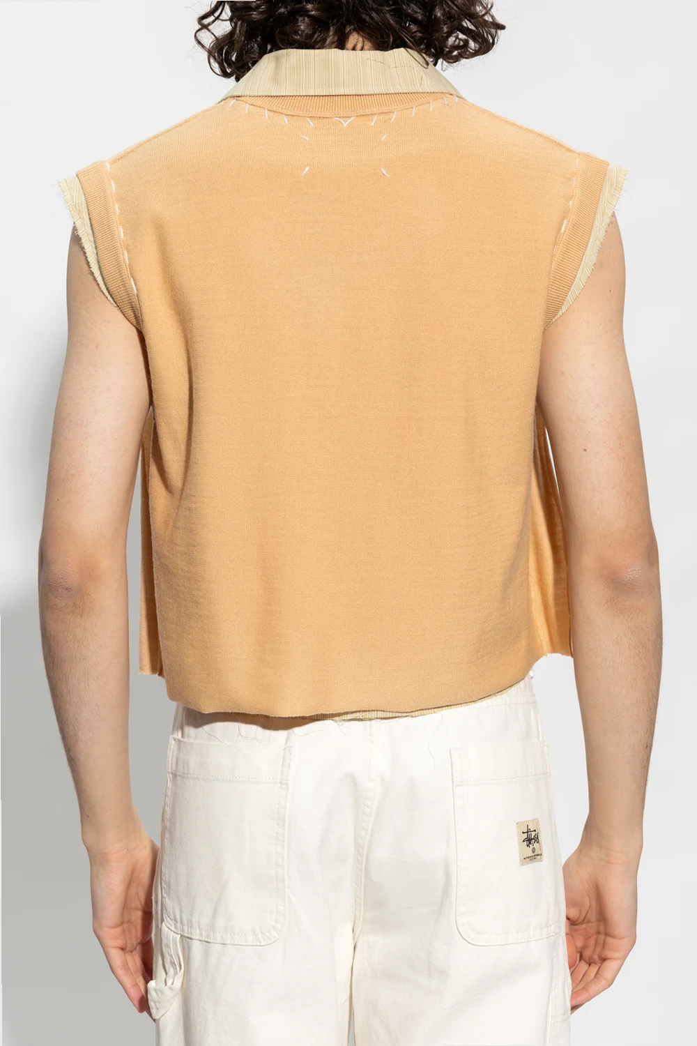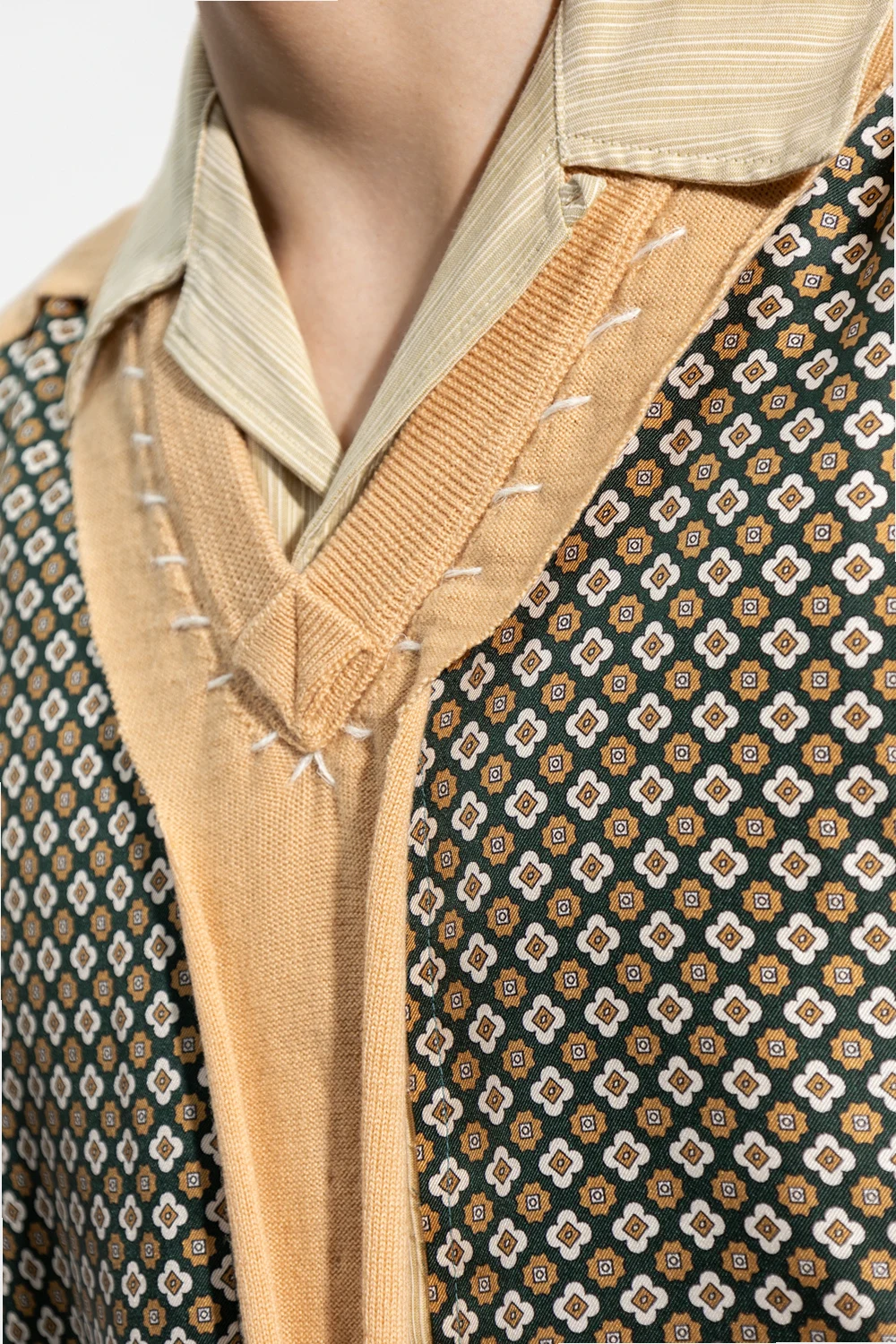 Beżowo-zielona koszula bez rękawów Maison Margiela. Wykonana z łączonych materiałów: bawełny i jedwabiu. Wykończona dzianiną. Zapinana na guziki. Ozdobiona wzorem. Z przodu dwie wsuwane kieszenie. Surowe wykończenie.