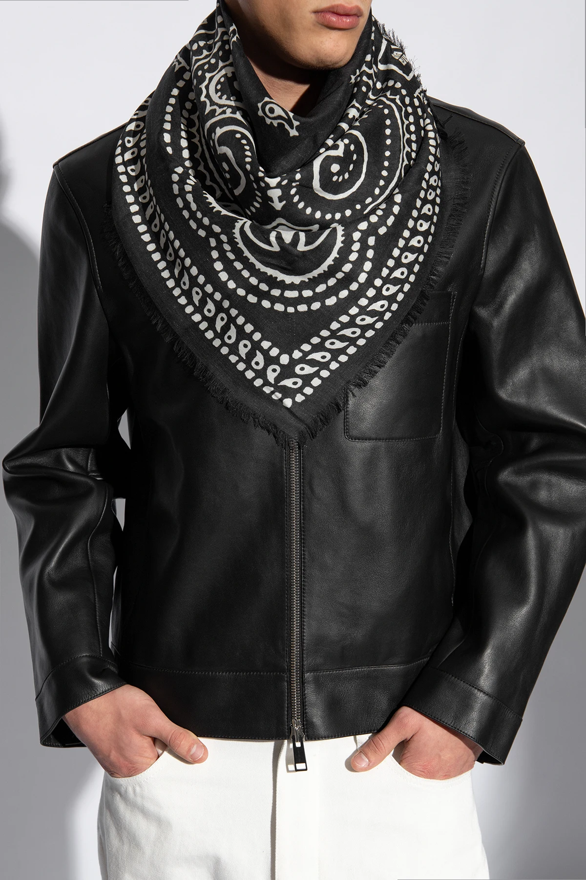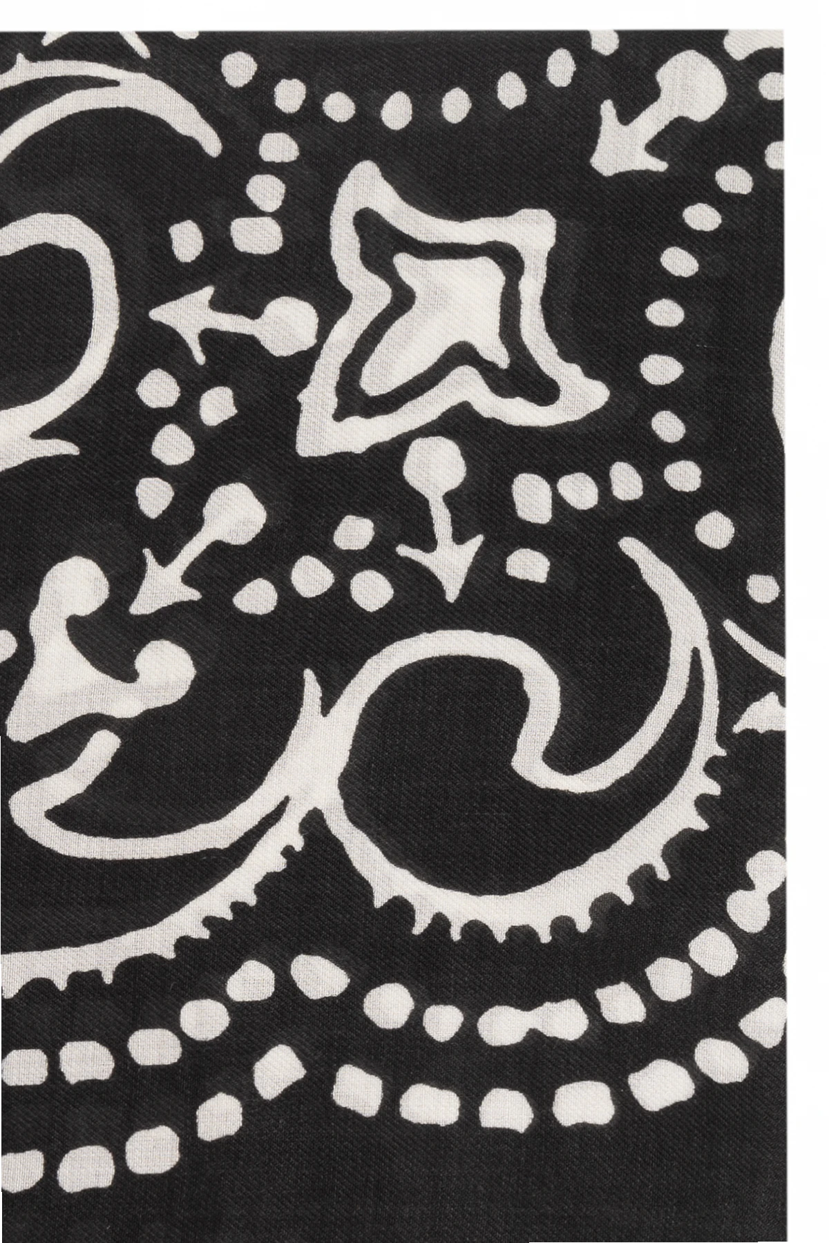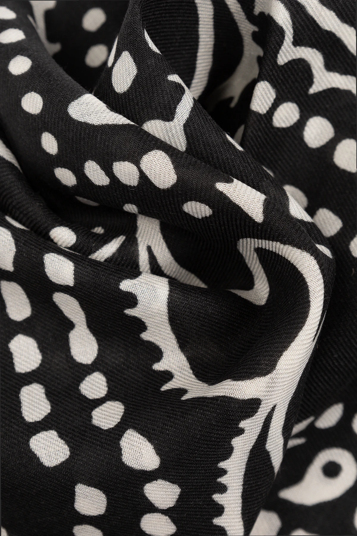Czarno-biała chusta Givenchy. Ozdobiona wzorem ‘paisley’ oraz logo. Surowe wykończenie.