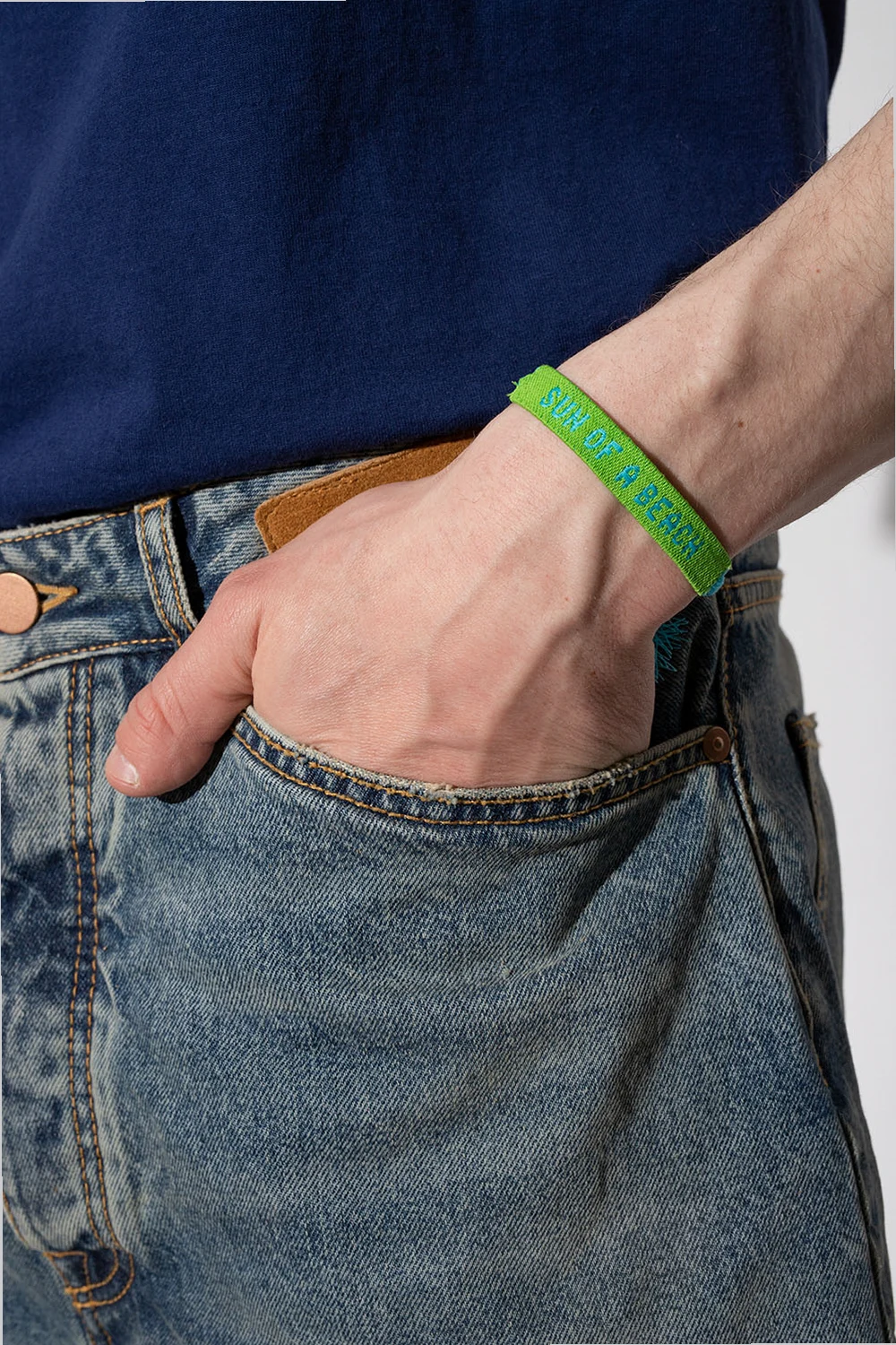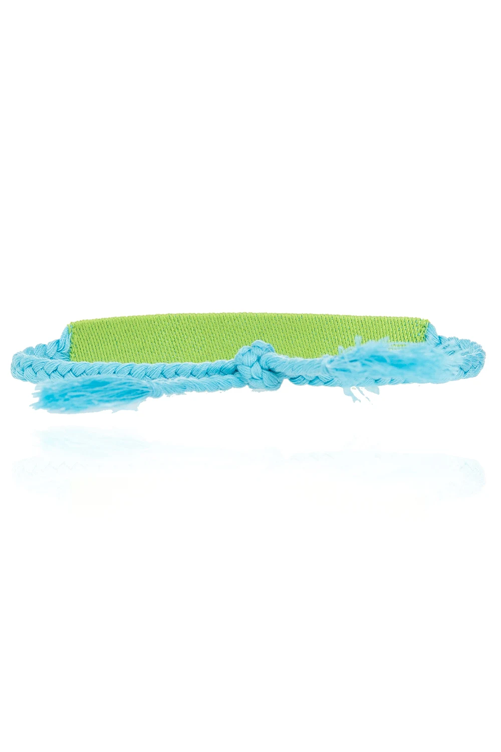 Zielono-niebieska bransoleta Palm Angels. Ozdobiona wyszytym napisem ‘SUN OF A BEACH’. Wiązana trokami.