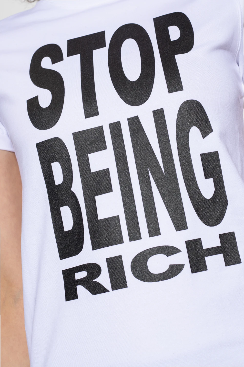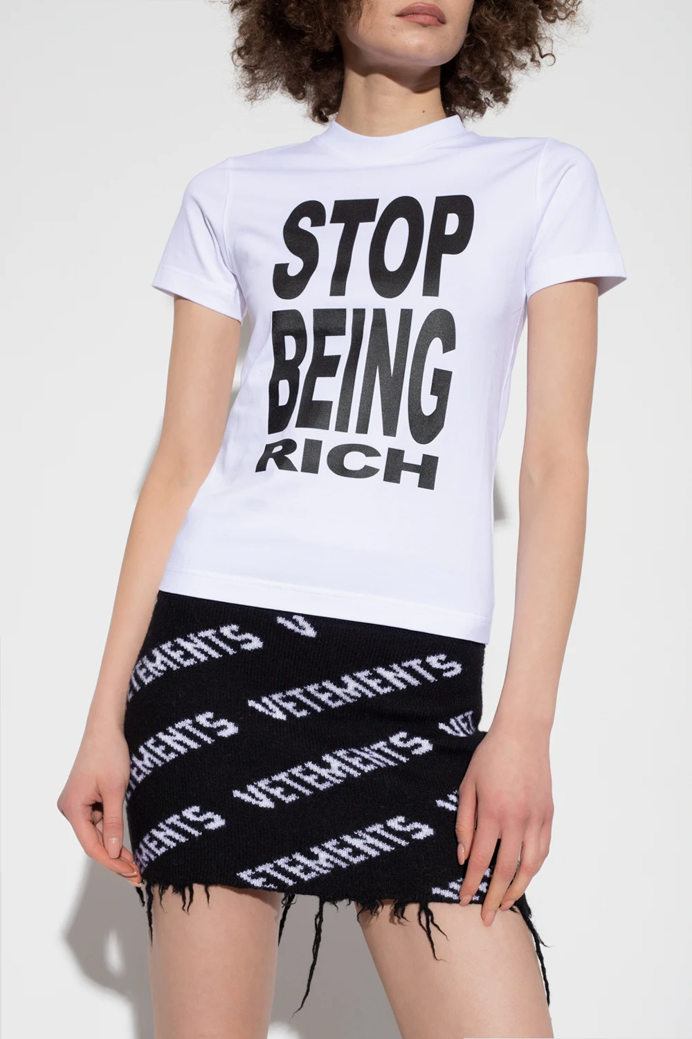 Biały t-shirt o dopasowanym kroju VETEMENTS. Wykonany z bawełny. Z przodu nadrukowany napis w kolorze czarnym. Z tyłu wyszyte logo. Okrągły dekolt wykończony ściągaczem, krótkie rękawy.