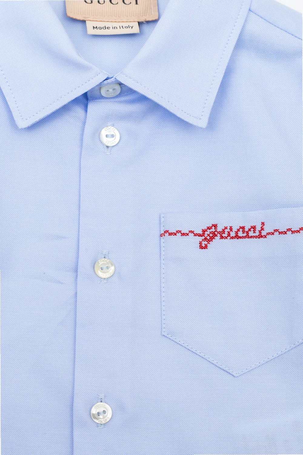Jasnoniebieska, bawełniana koszula Gucci. Zapinana na guziki. Z przodu wsuwana kieszeń z wyszytym czerwonym logo. Długie rękawy, mankiety zapinane na guzik.
