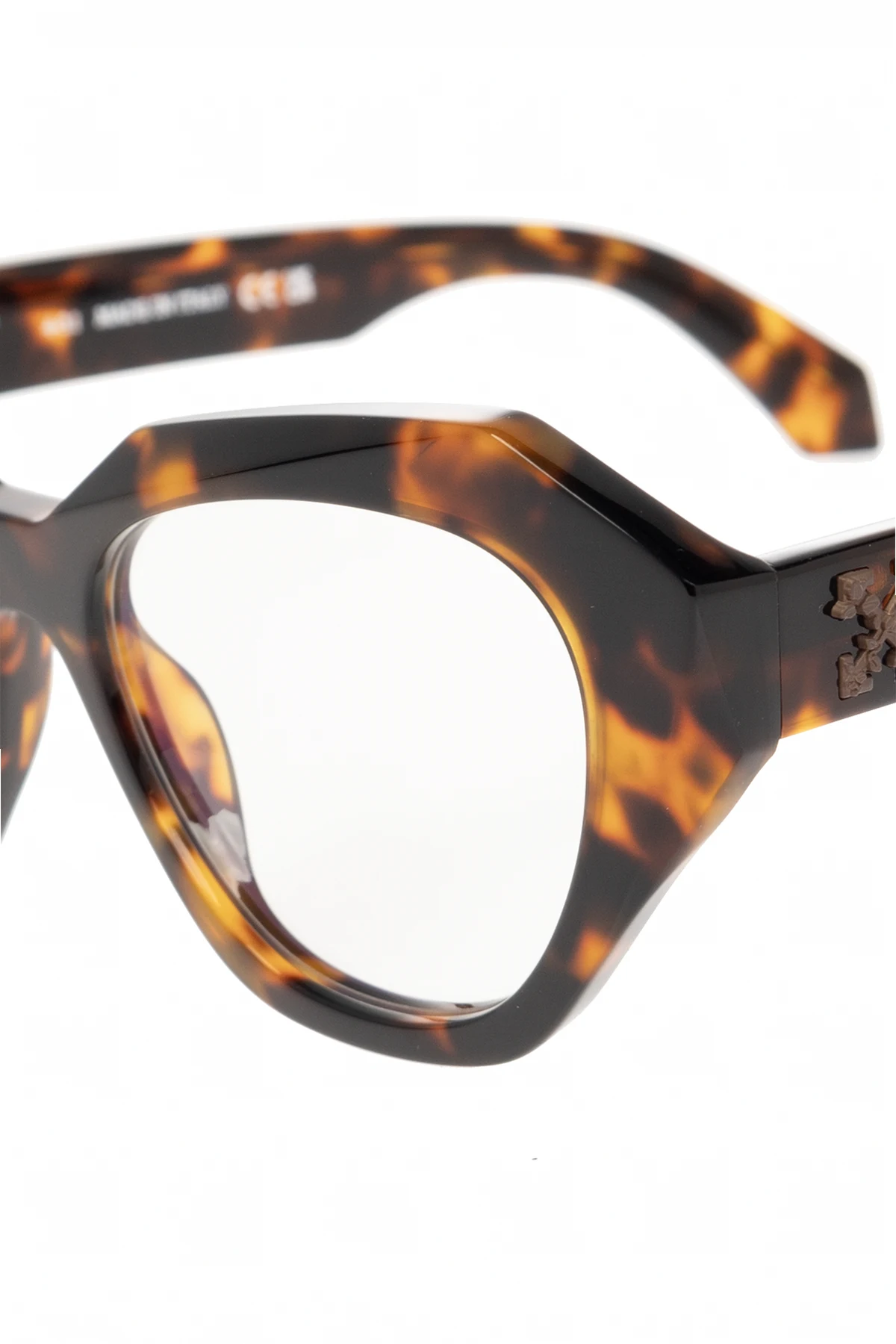 Brązowo-czarne, szylkretowe okulary korekcyjne, model ‘Style 43’ Off-White. Zauszniki ozdobione aplikacją w kształcie charakterystycznych strzałek. Transparentne soczewki filtrujące niebieskie światło. Dołączone etui.