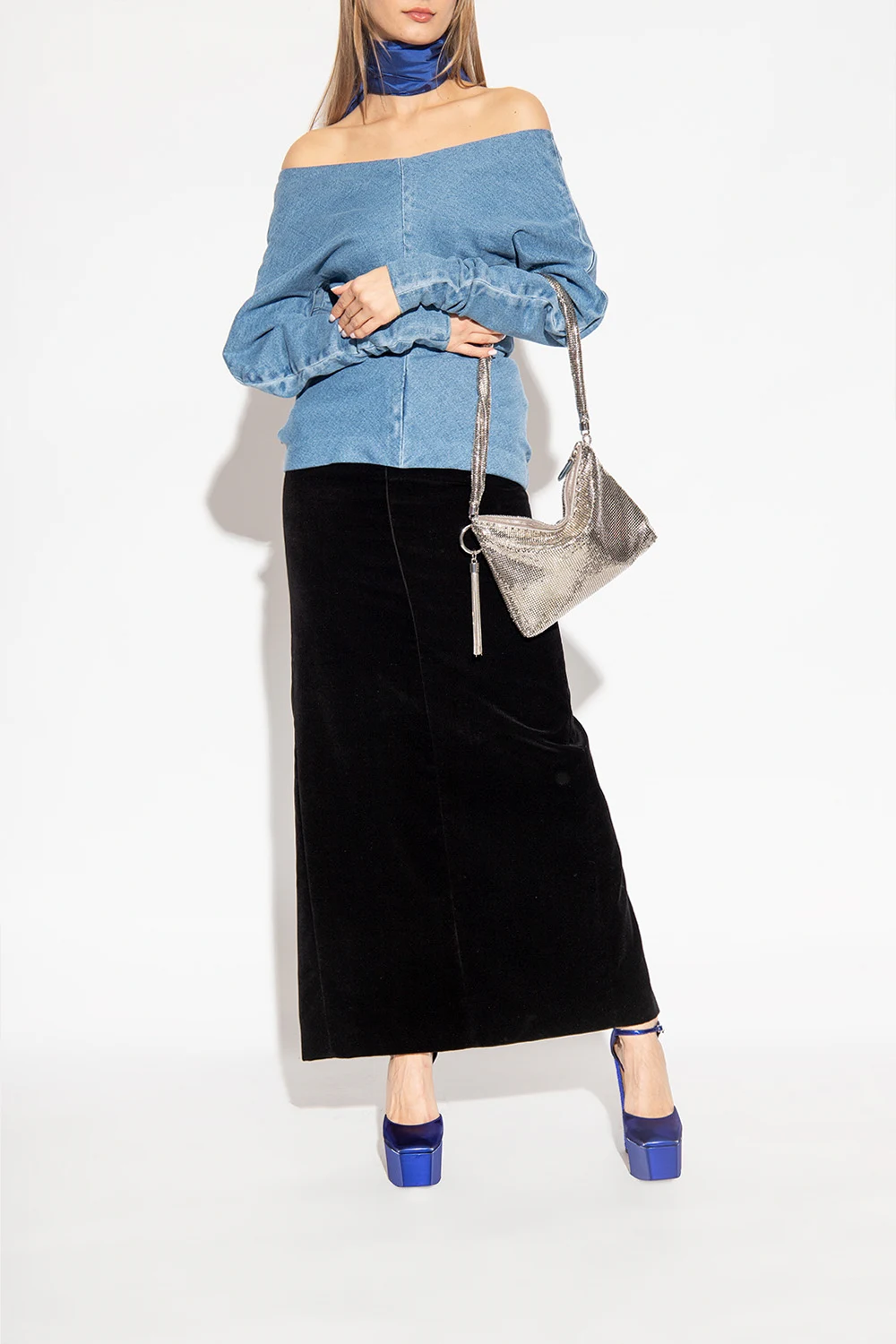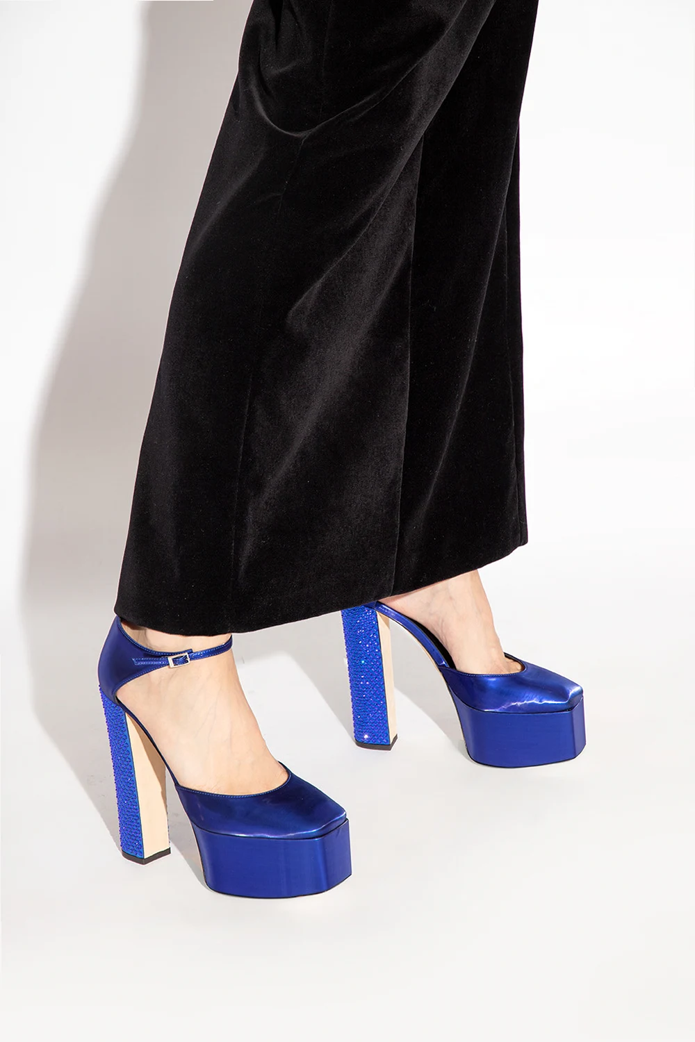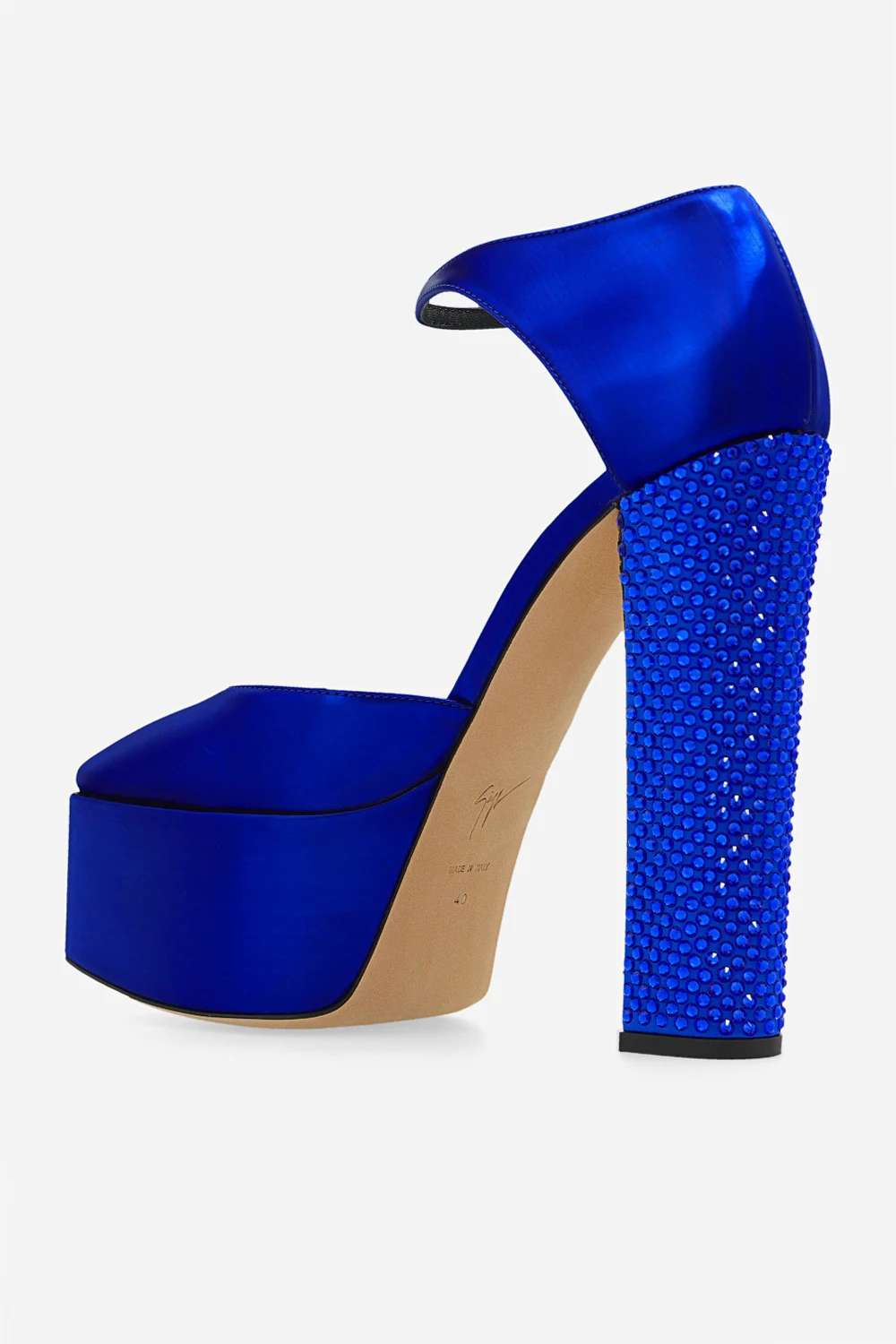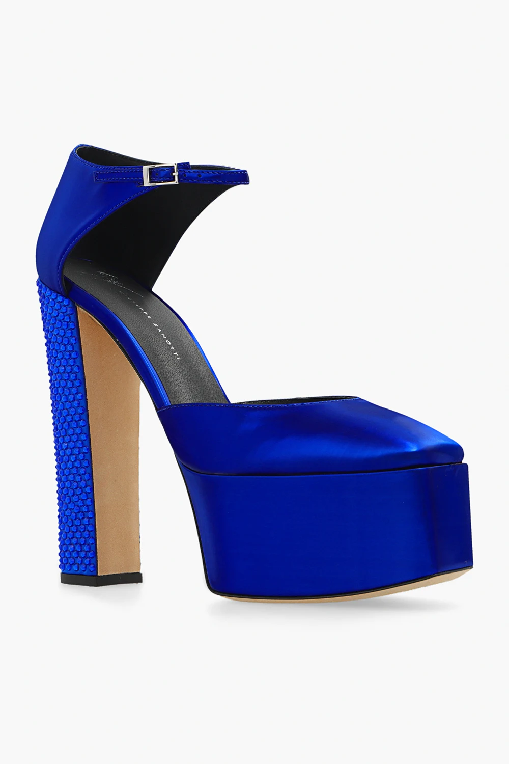 Niebieskie buty na obcasie Giuseppe Zanotti. Zapinane na pas wokół kostki. Obcas z dekoracyjnym wykończeniem. Beżowa, skórzana podeszwa.