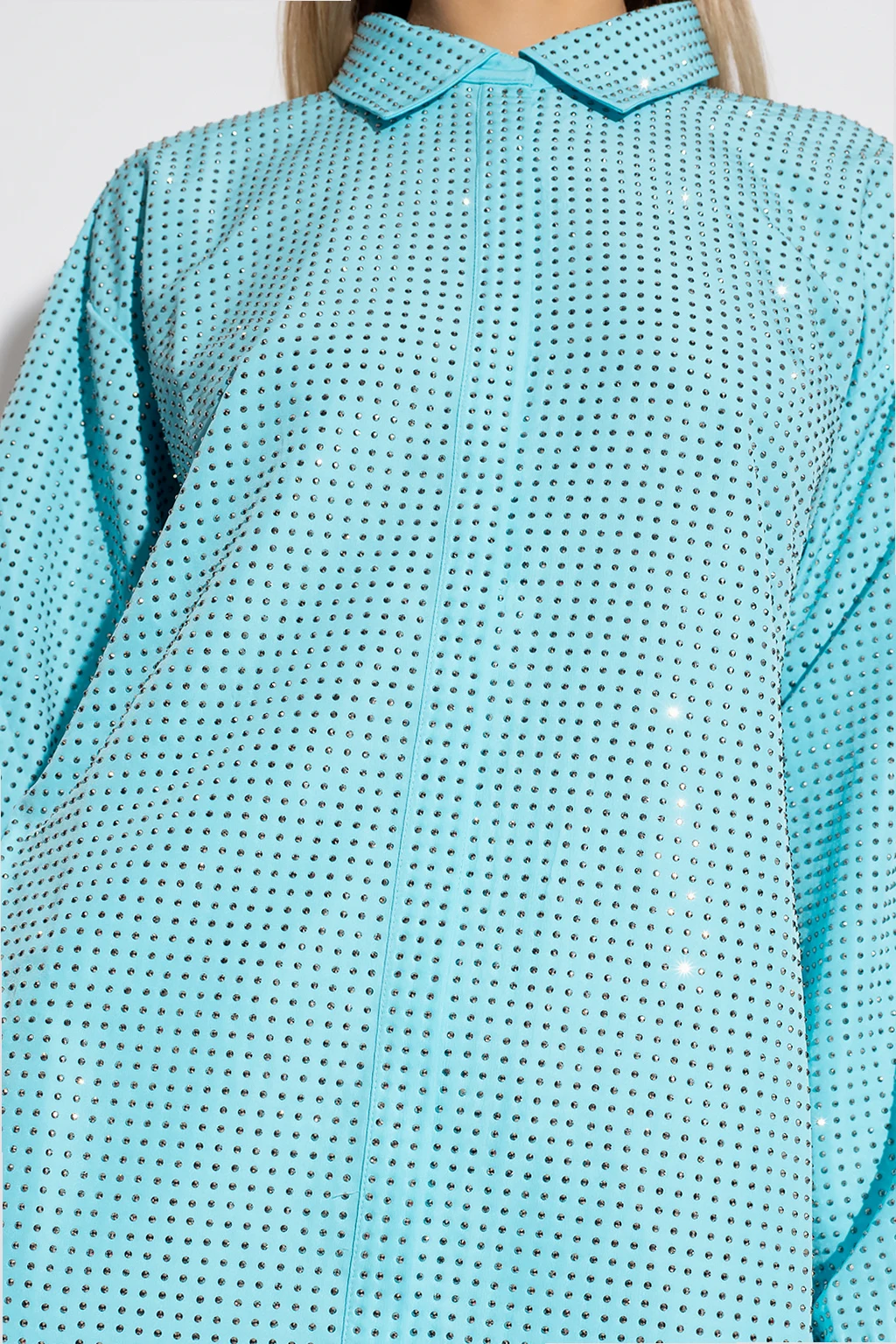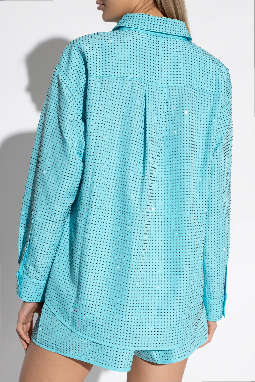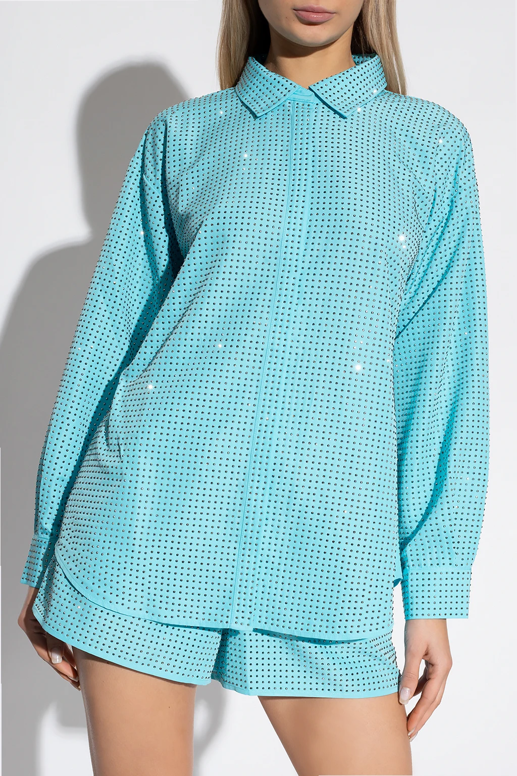 Niebieska koszula o luźnym kroju Self Portrait. Zapinana na guziki z krytą plisą. Wykończona połyskującymi aplikacjami. Długie rękawy, mankiety zapinane na guzik.