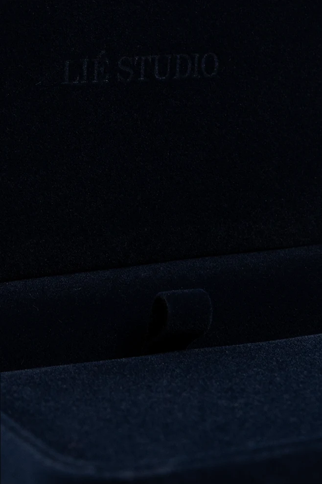 Wnętrze pudełka, wyściełane tym samym miękkim materiałem, kryje w sobie przegródkę na biżuterię oraz małą zakładkę, która zapewnia bezpieczne przechowywanie cennych ozdób. Na wewnętrznej stronie pokrywy widnieje subtelne logo LIÉ STUDIO , które dodaje całości prestiżowego wykończenia.