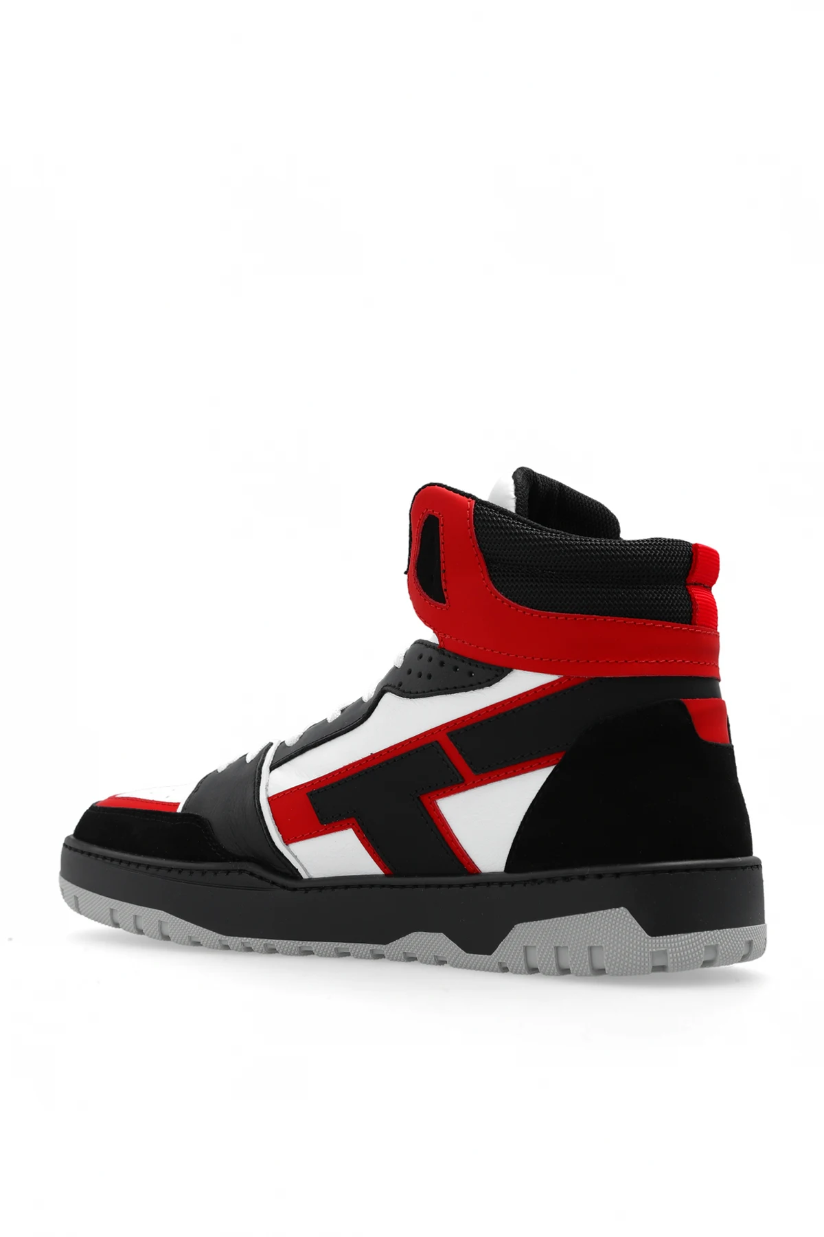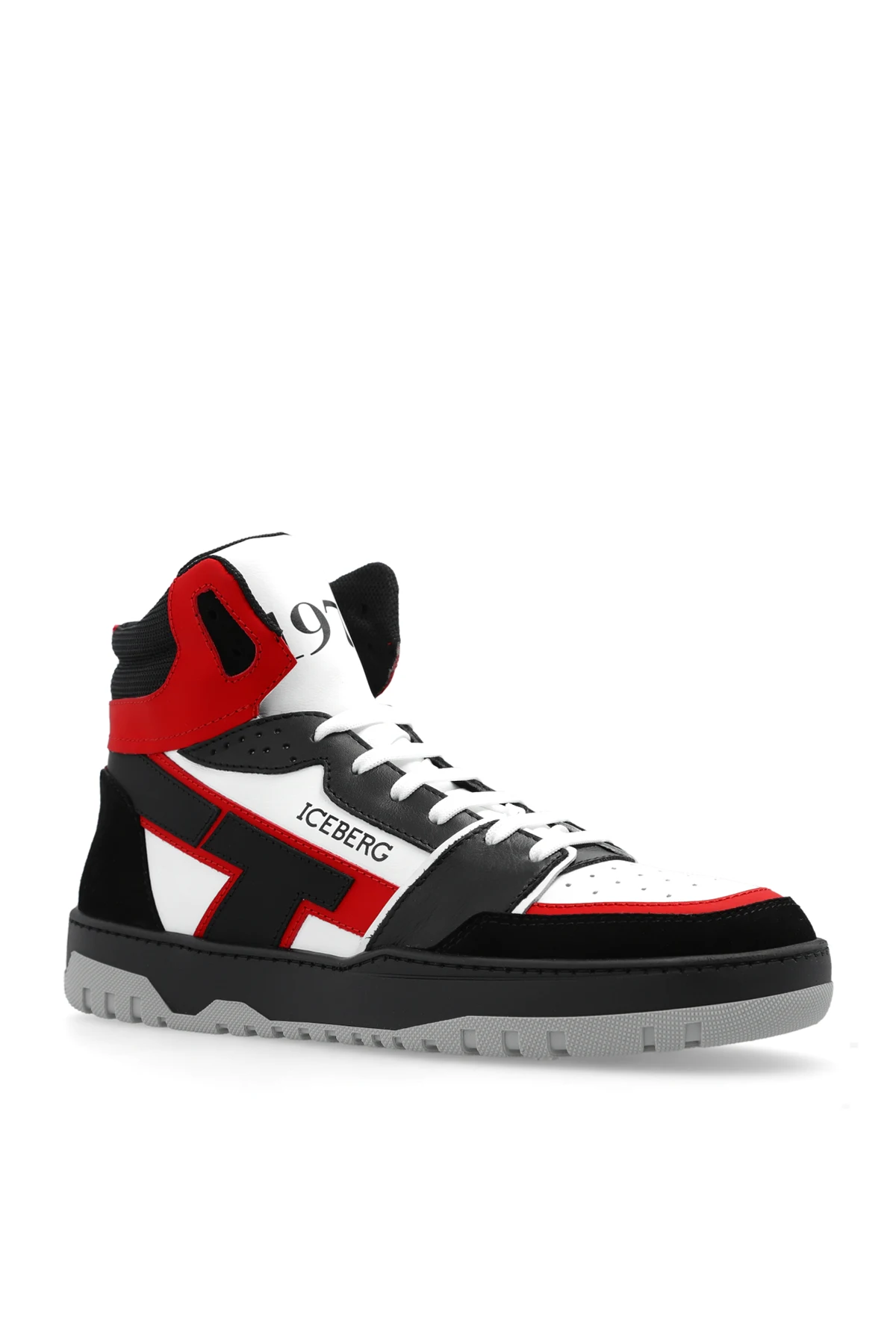 Biało-czarno-czerwone, sznurowane buty sportowe za kostkę Iceberg. Wykonane ze skóry i materiału. Ozdobione perforacją oraz nadrukiem z logo. Szaro-czarna, gumowa podeszwa.