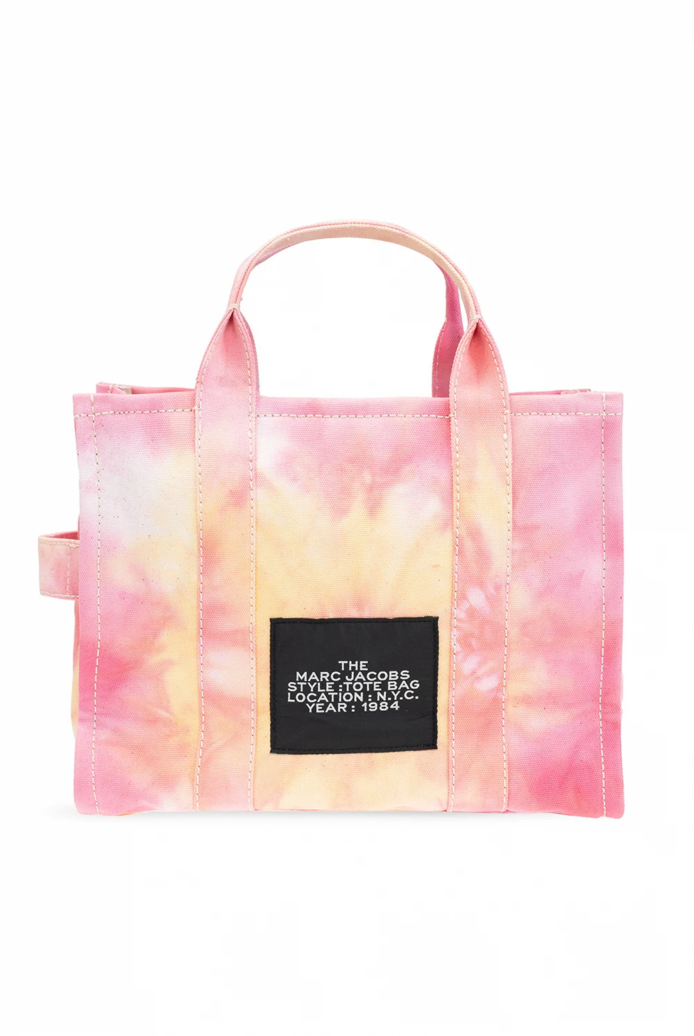Różowa torba na ramię, model ‘The Medium Tote’ Marc Jacobs (The). Wykonana z bawełny. Ozdobiona białym logo oraz naszywką w kolorze czarno-białym. Dwie półokrągłe rączki. Pas na ramię z możliwością regulacji długości. Wewnątrz komora oraz dwie wsuwane kieszenie. Metalowe wykończenie w kolorze srebrnym.