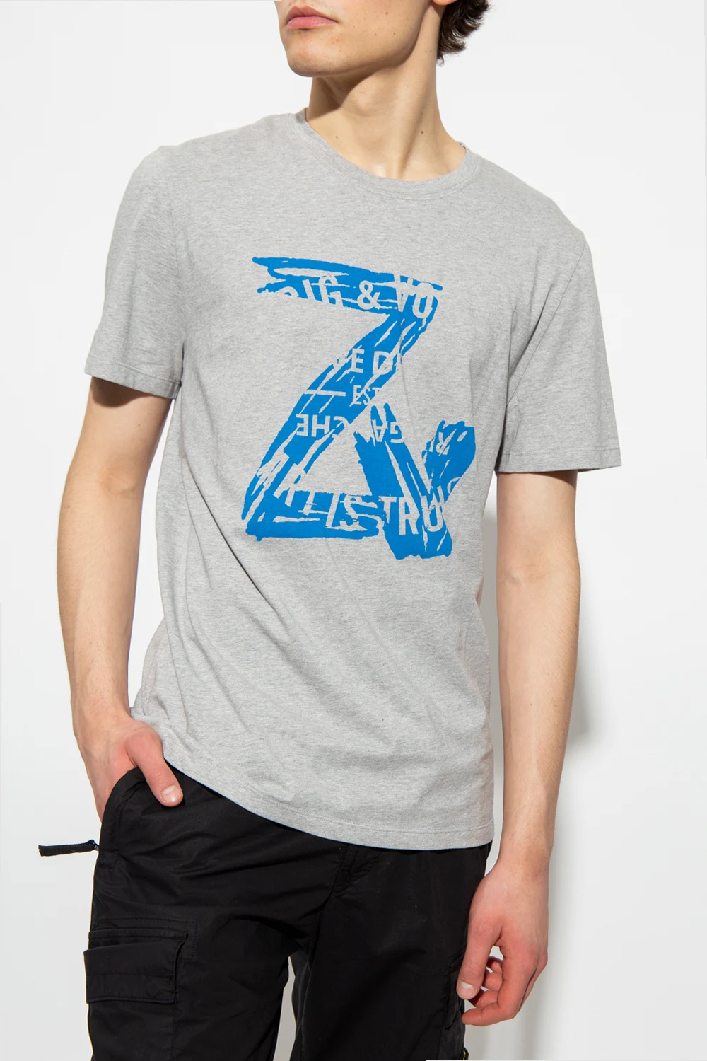 Szary, bawełniany t-shirt, model ‘Tommy New’ Zadig & Voltaire. Z przodu nadrukowane niebieskie logo. Okrągły dekolt. Krótkie rękawy.